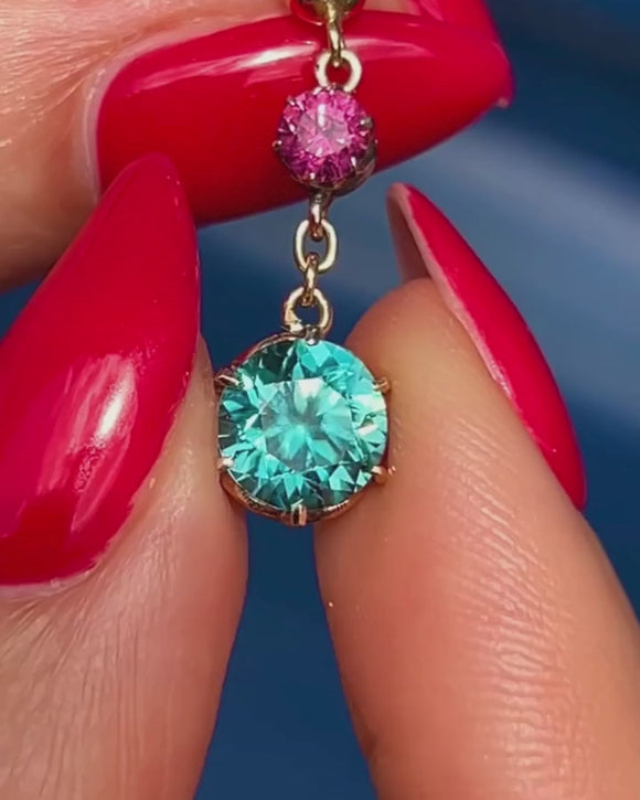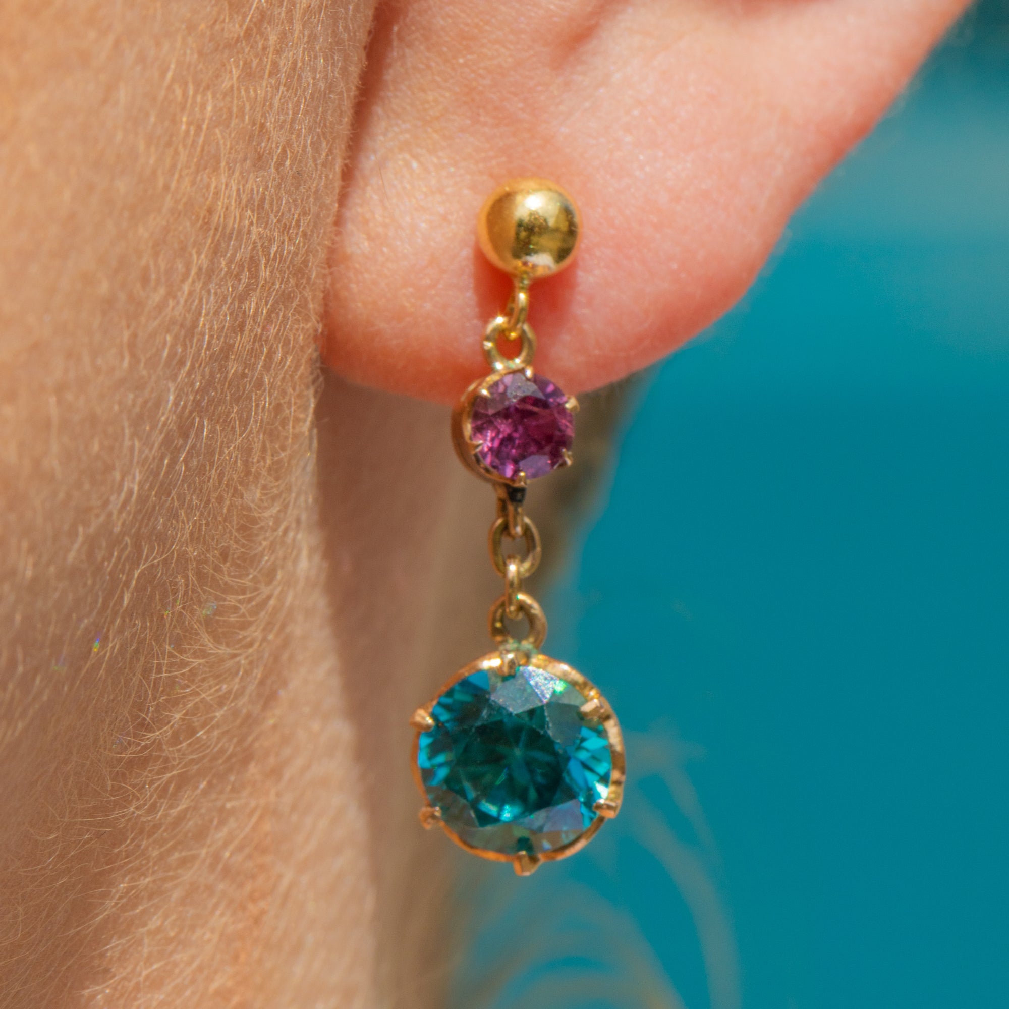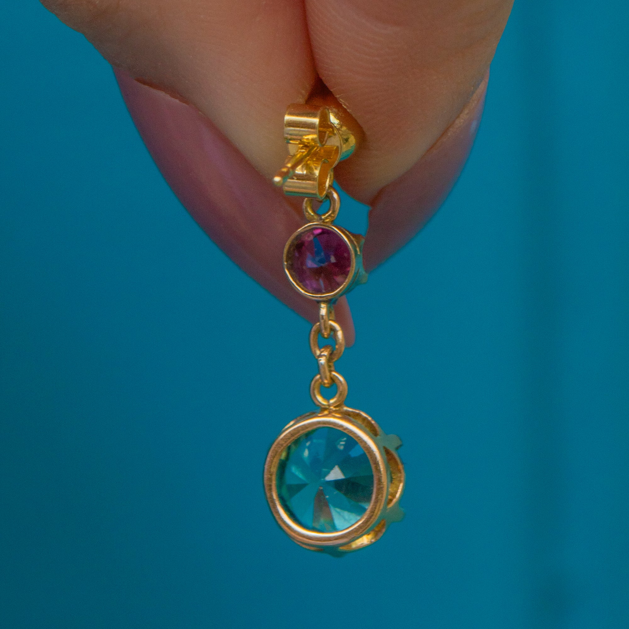Elevate your antique jewellery collection with these vibrant Art Deco 18ct Gold Blue Zircon Ruby drop earrings! This mesmerising duo will instantly catch the attention of any onlooker with their scintillating combination of icy blue Zircons and fuschia-infused Rubies.