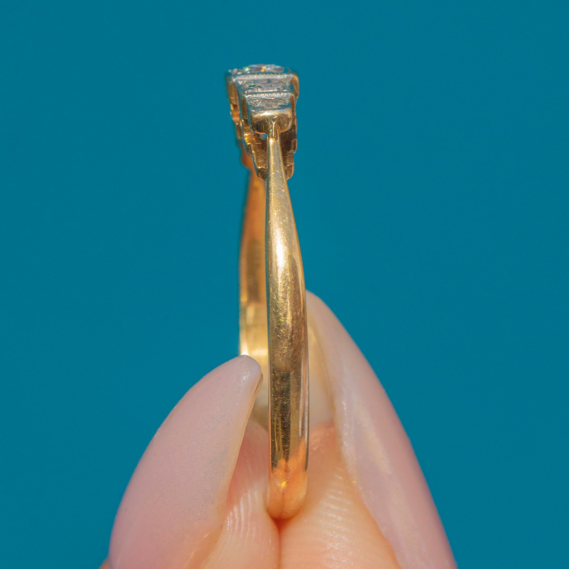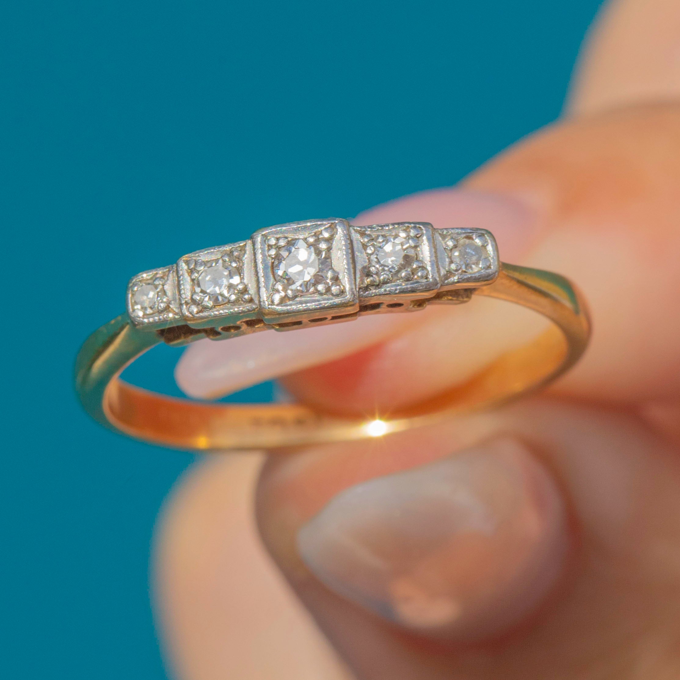 A chic Art Deco Diamond 5-stone ring in 18ct Gold and Platinum, c.1920. The design features five graduating old cut Diamonds, each set in a crisp square Platinum bezel, forming a stepped architectural row across the finger. The style is distinctly Art Deco, reminiscent of the iconic Chrysler Building of the era.