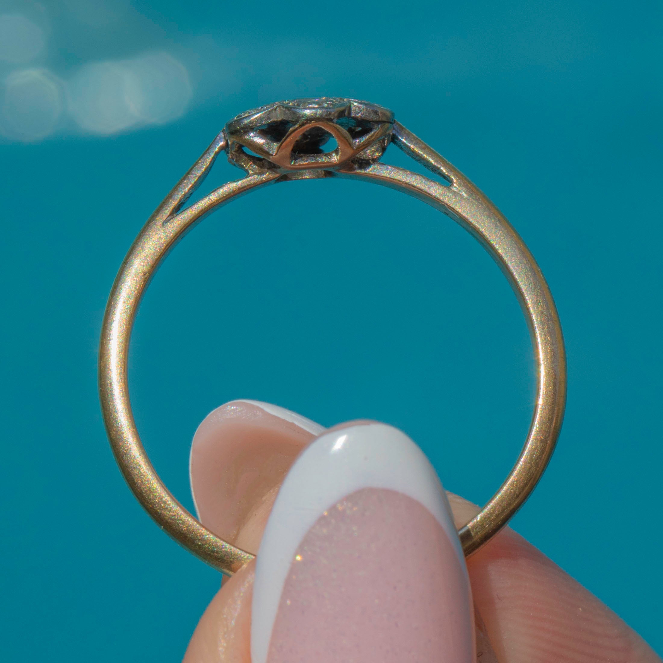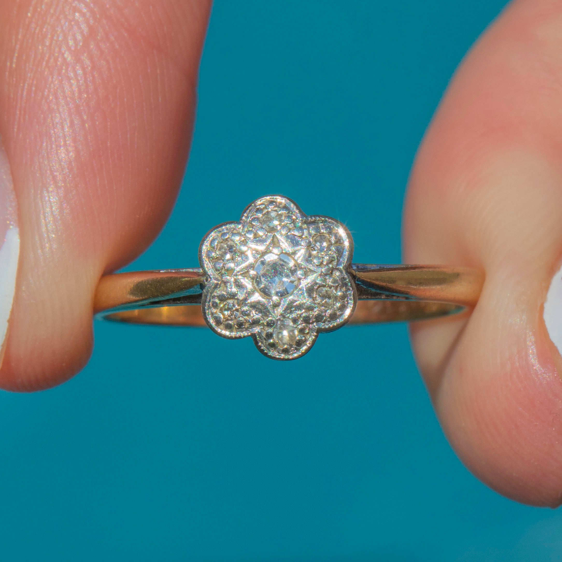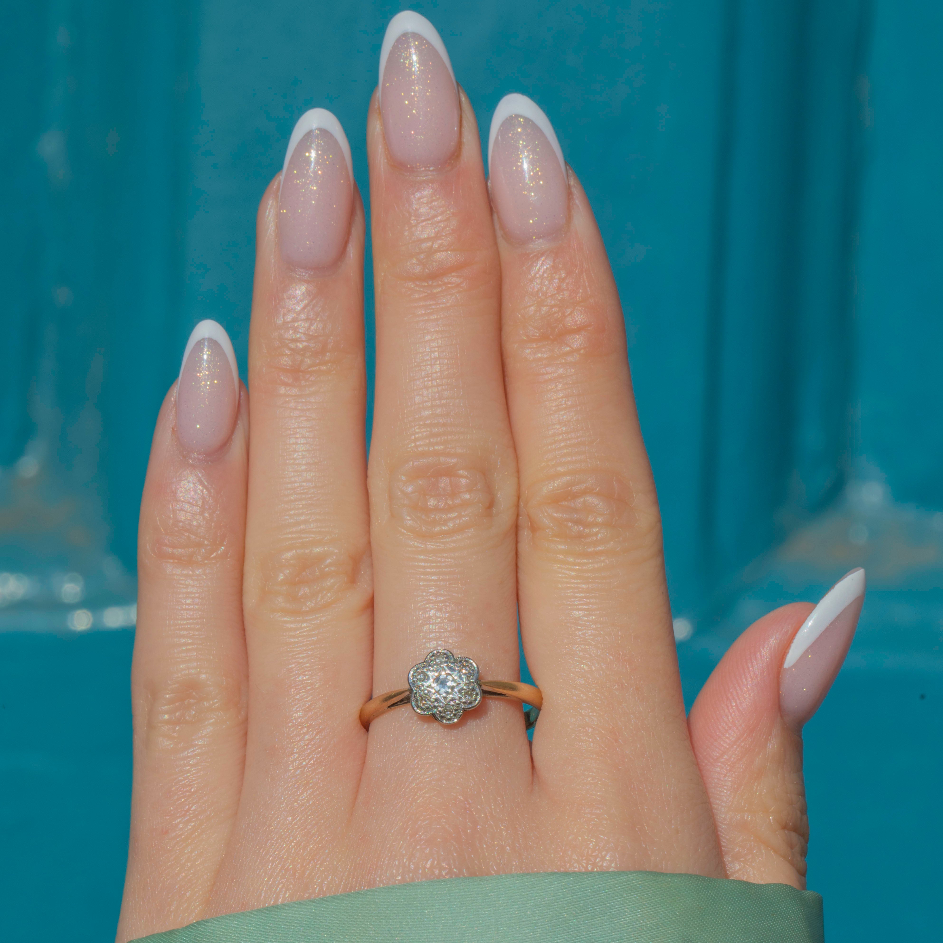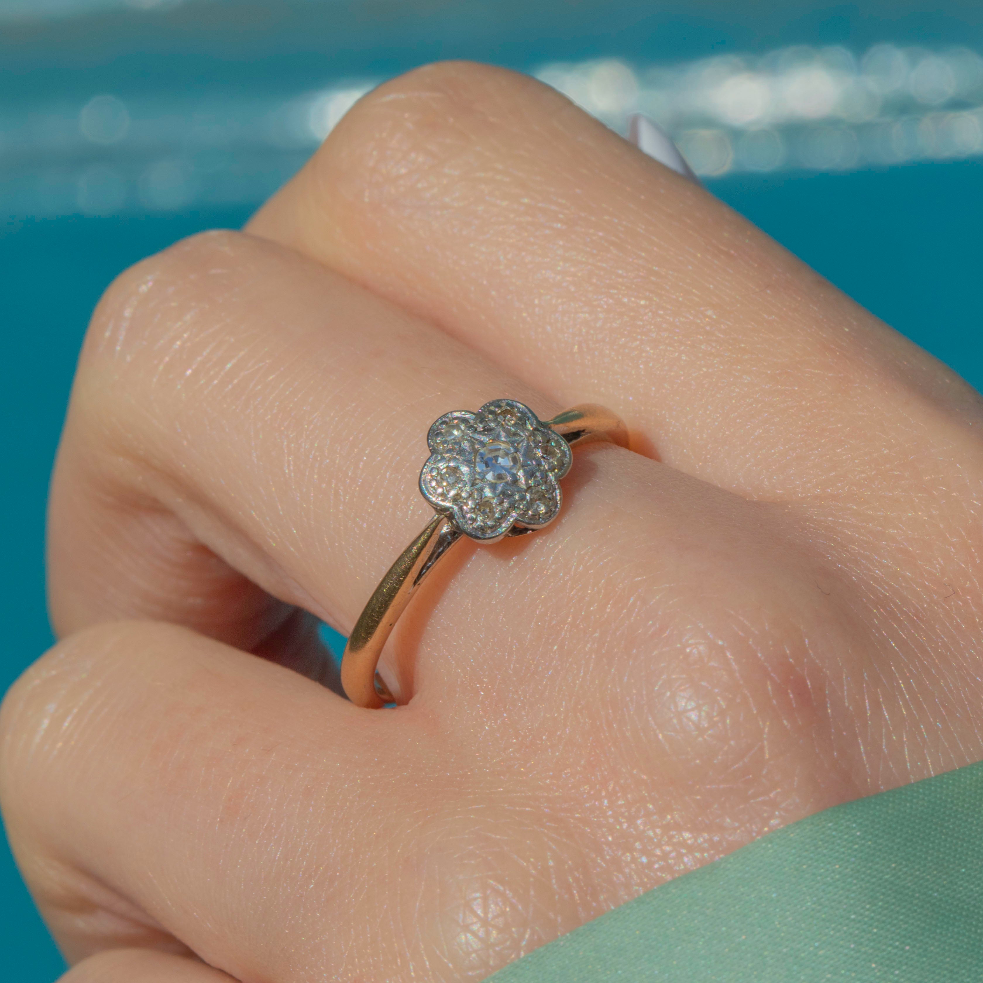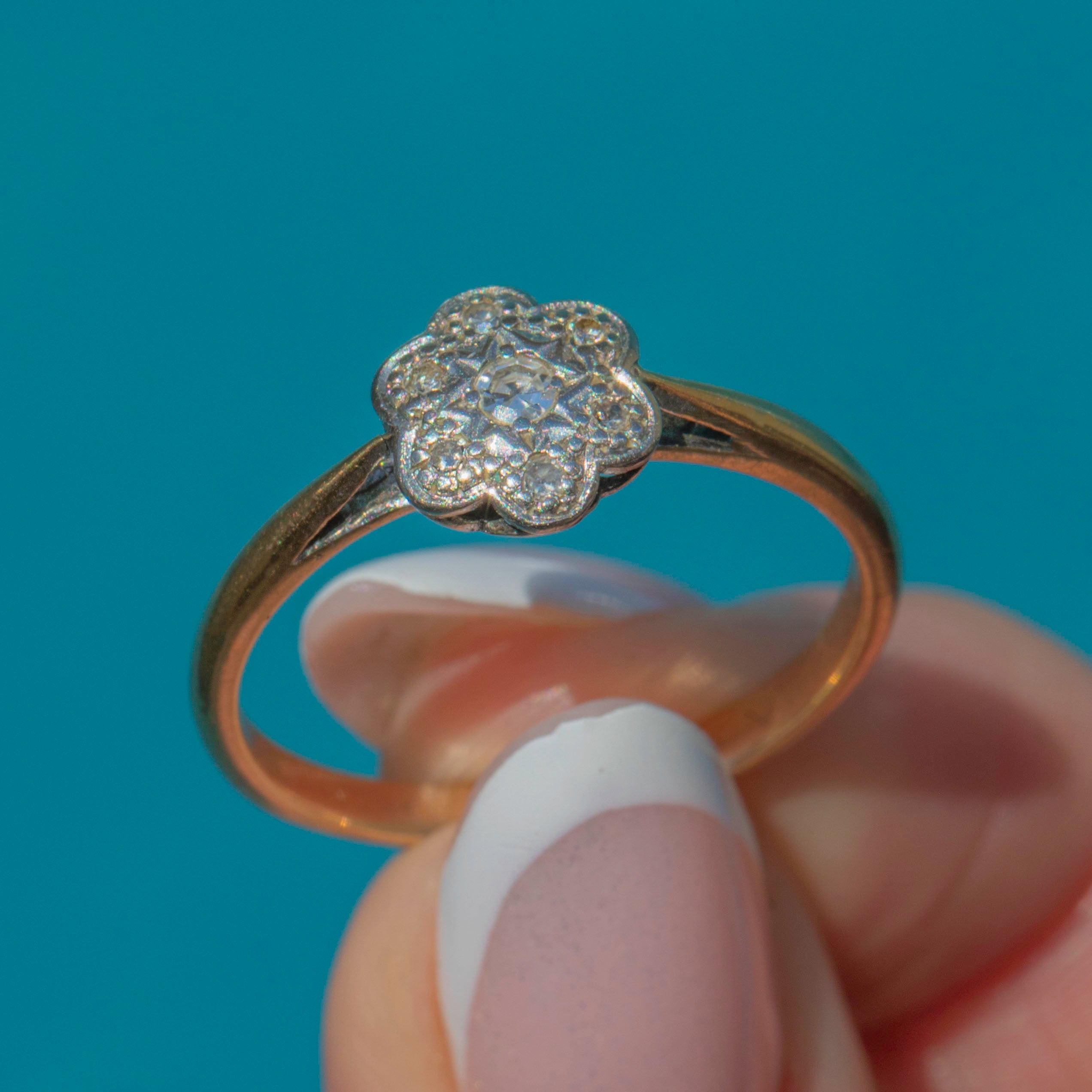 We are absolutely enchanted by this delicate Art Deco 9ct Gold Diamond cluster ring, a stunning piece from the most decadent era!