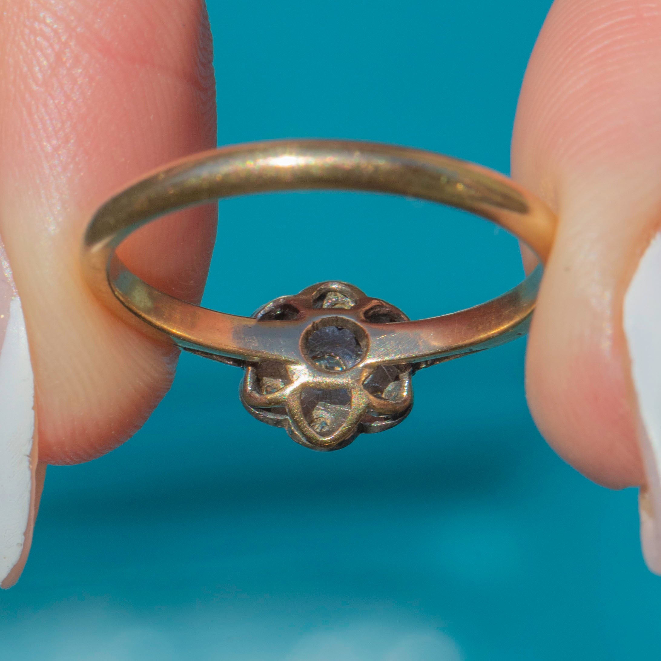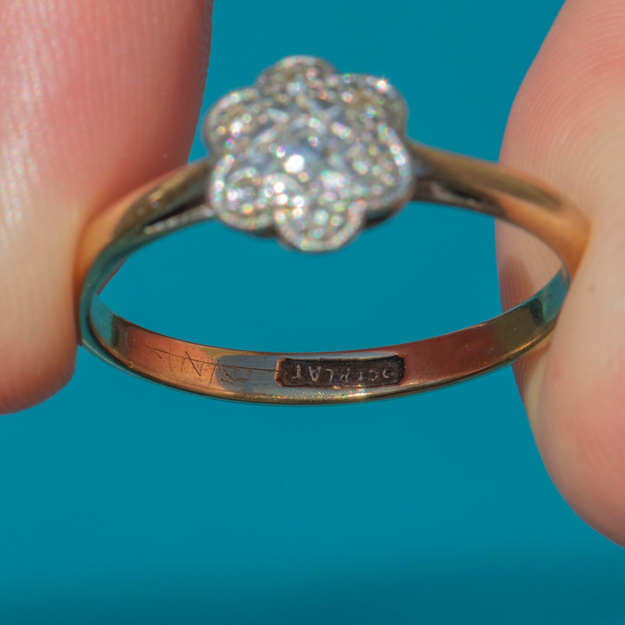 VERY GOOD: This Art Deco 9ct Gold Diamond cluster ring is in very good condition throughout. The Gold gleams in low and natural light, and the Diamonds are securely set with no scratches or chips. There is a minor split at the side of the ring band near the gallery, however, the band is still secure and this is truly only noticeable under close inspection with a jeweller's loupe. There is no wear to the back of the band promising you many years of enjoyment!