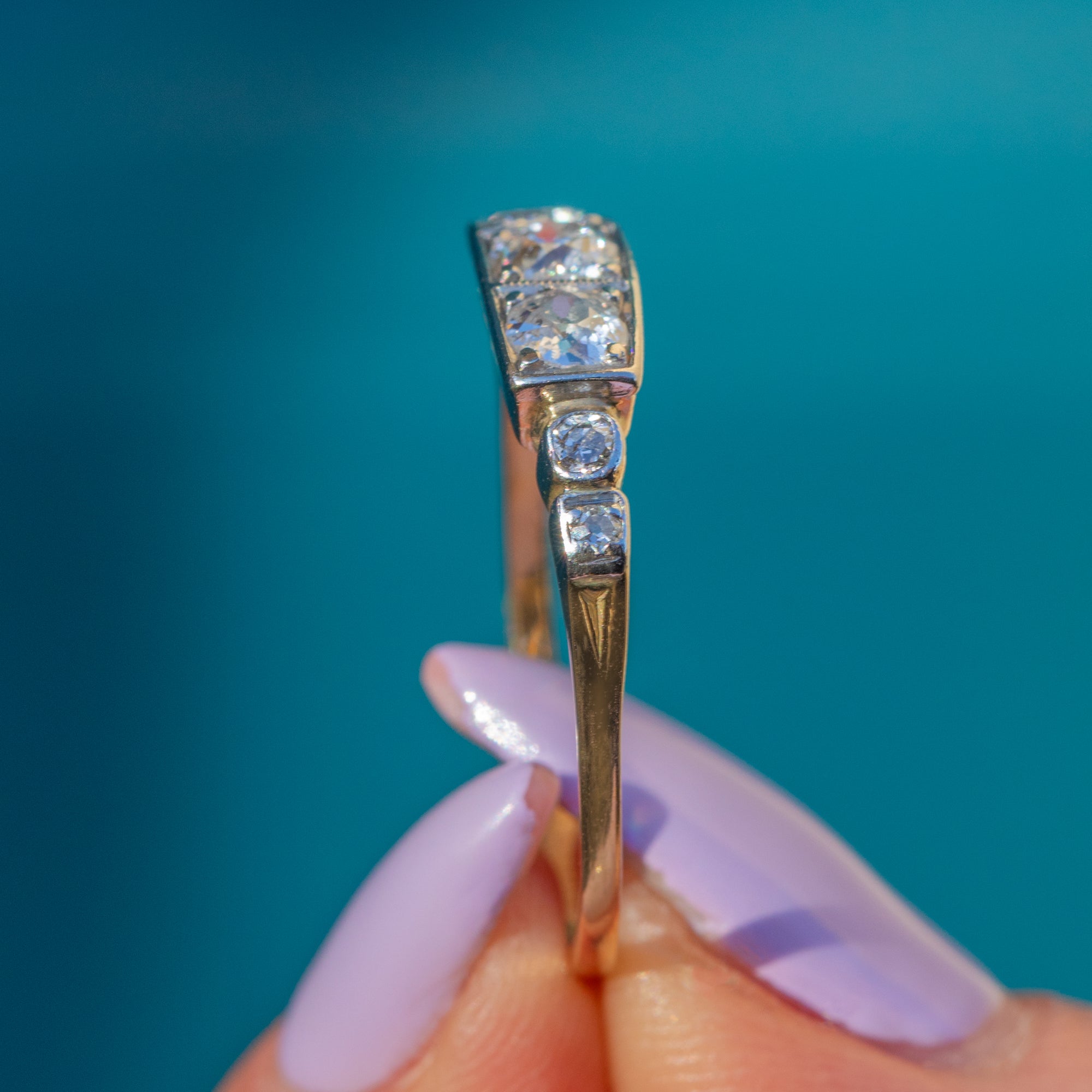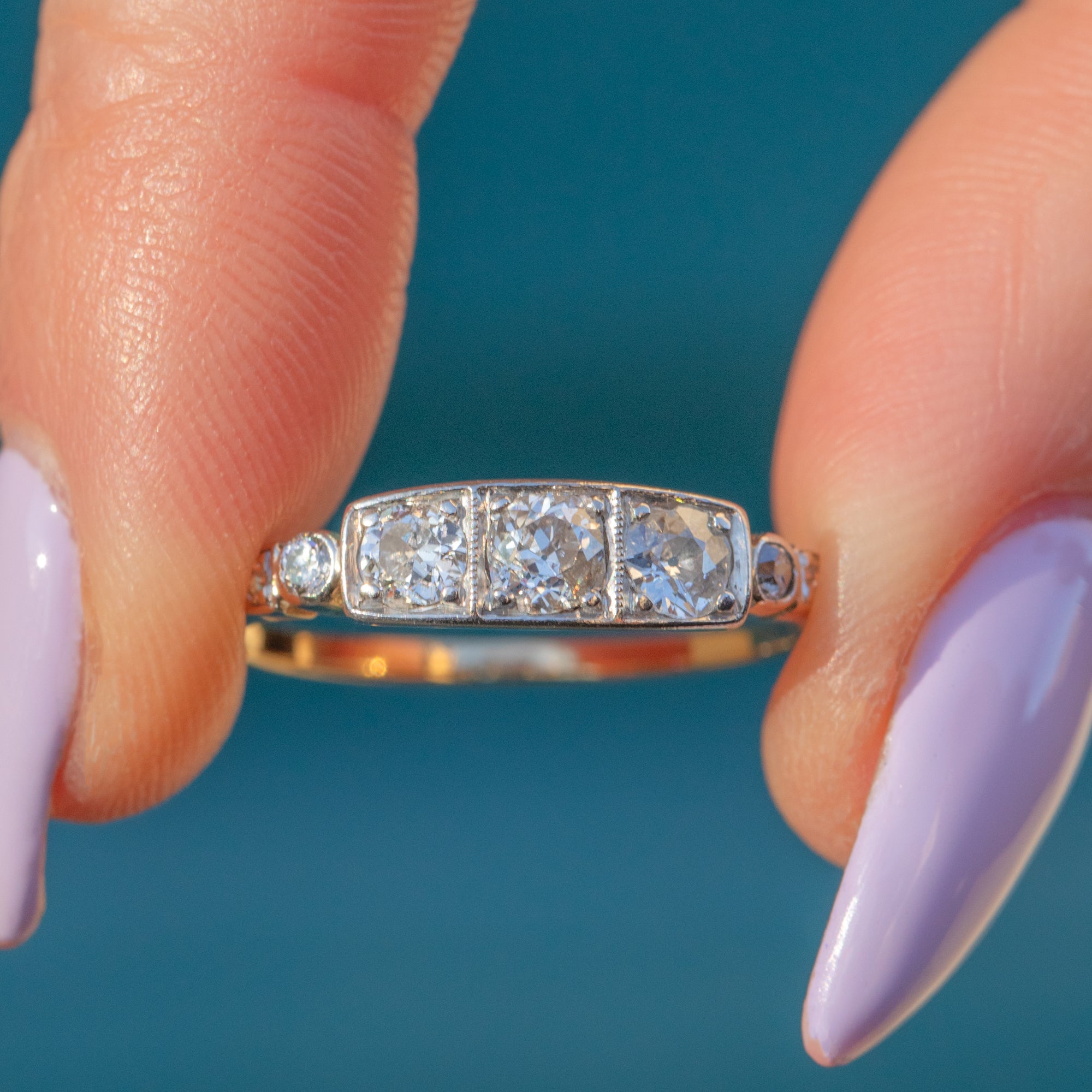Boasting seven Diamonds, with three gorgeous central Old-European-cuts, this 0.60ct Diamond ring twinkles from all angles. A testament to Art Deco craftsmanship, she is bold yet elegant, with her antique Diamonds effortlessly complemented by her 18ct White Gold settings.
