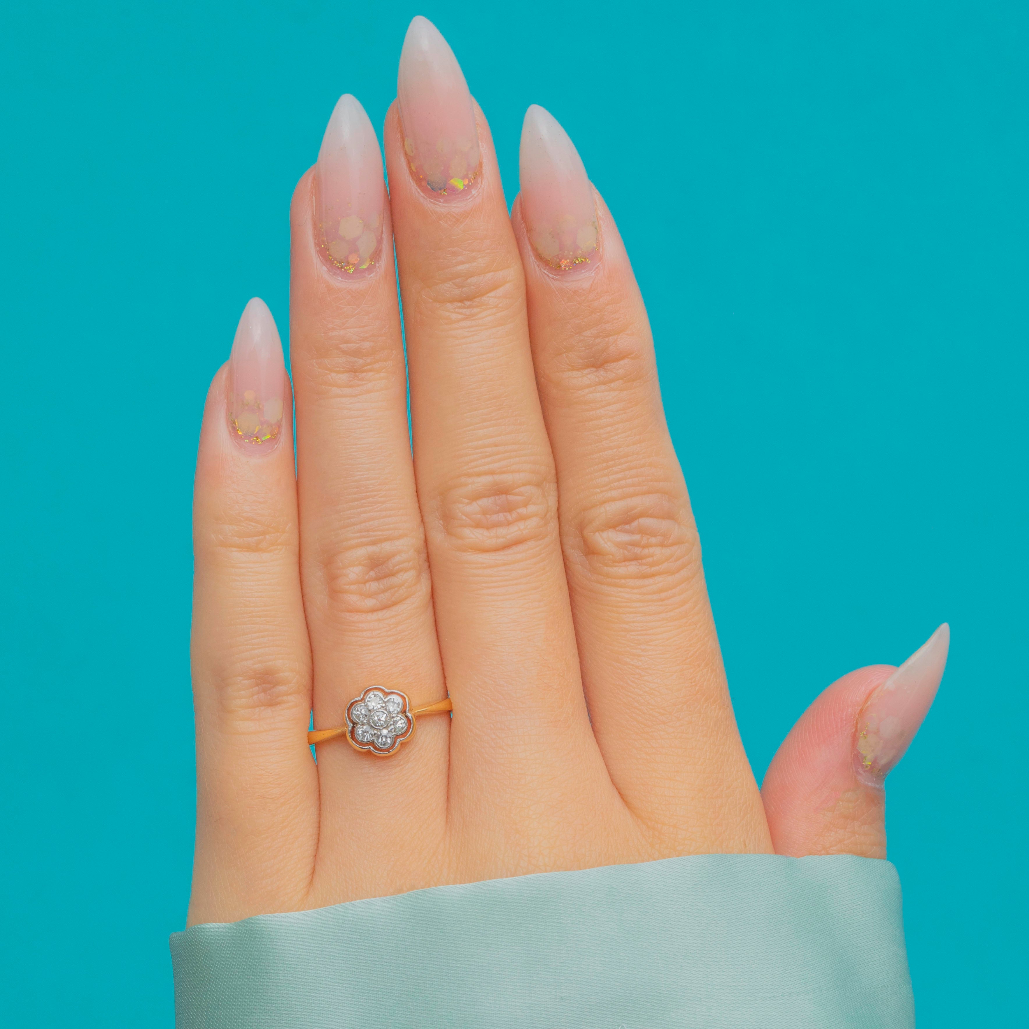 Beautifully proportioned and light on the hand, this antique cluster ring sparkles with timeless charm, making it a perfect choice for an engagement ring or an heirloom-worthy addition to a collection.