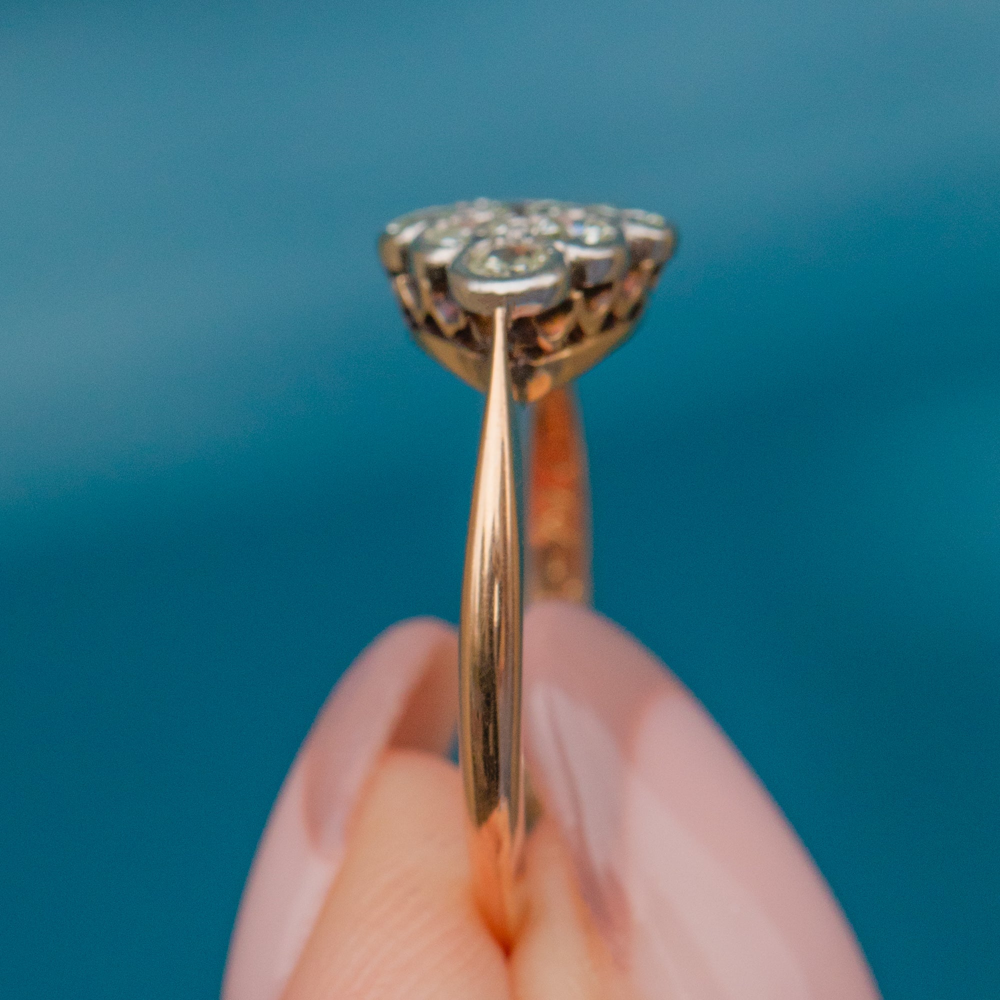 VERY GOOD-EXCELLENT. This Art Deco 18ct Gold & Platinum Diamond cluster ring is in wonderful condition. The Diamonds are all present and securely set in Platinum, with no fleabites or abrasions visible. The only thing to note is that three of the claws on the gallery don't meet the stone settings, but the ring is still robust enough for daily wear. The 18ct Gold band is saturated and smooth with lovely, chunky Art Deco stamps inside.