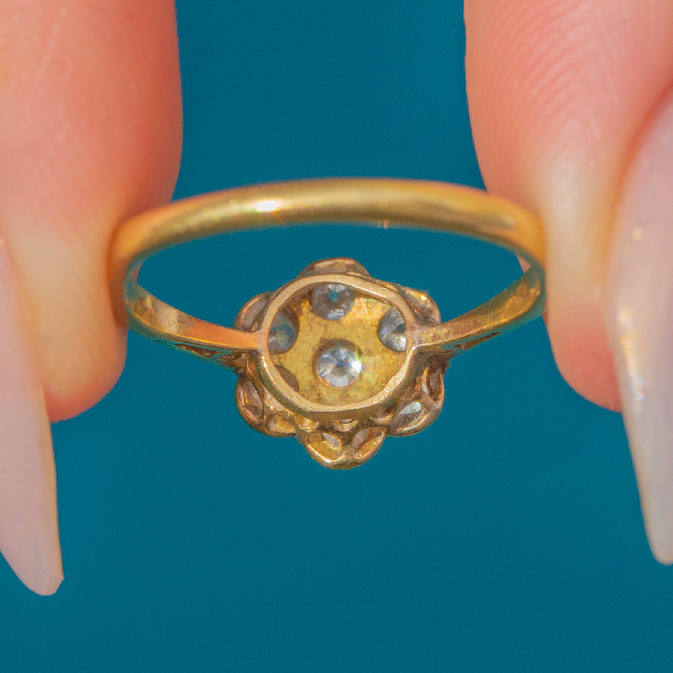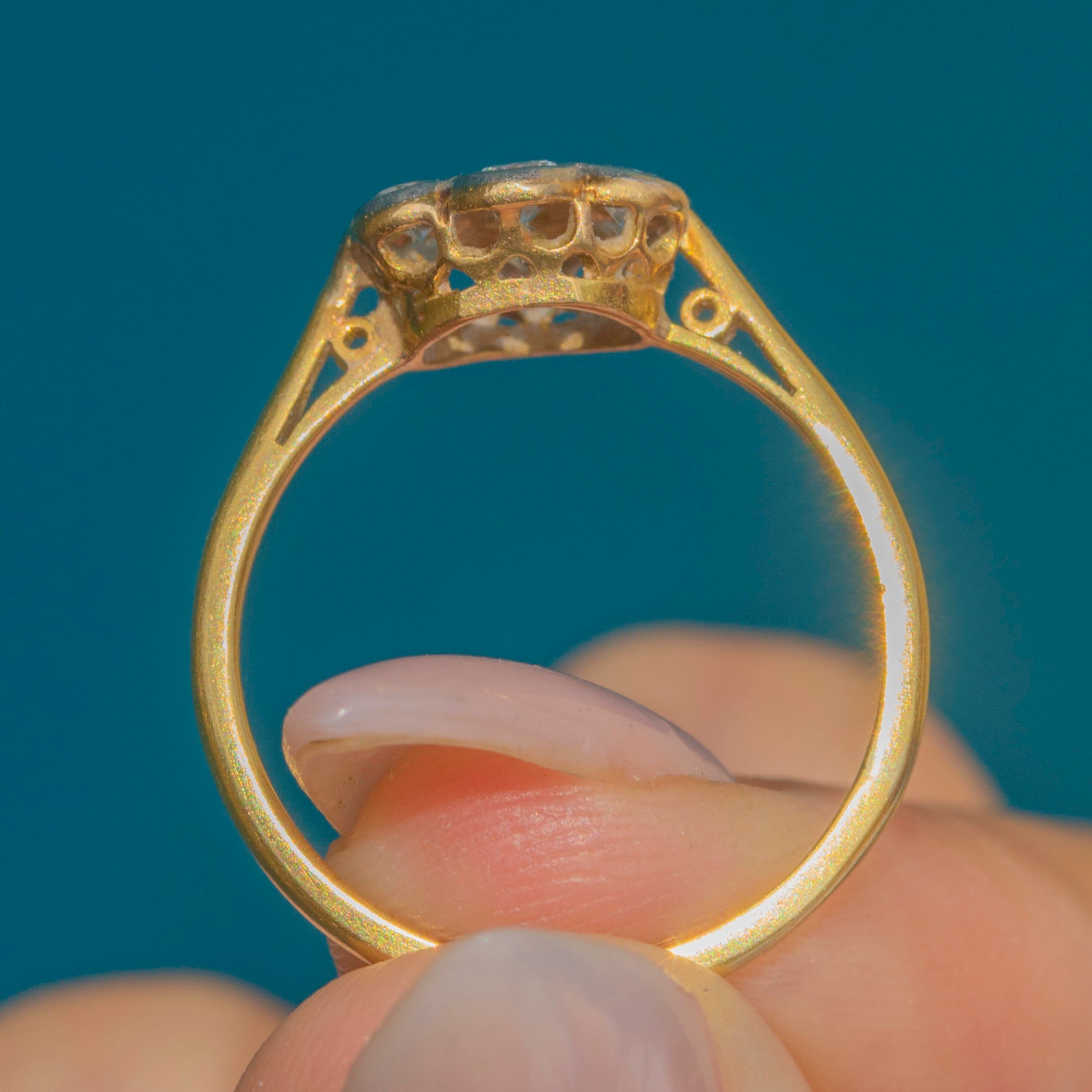 The cluster measures 8.5mm across, with a slim 18ct Gold band stamped “18CT” and “PLAT”. A classic engagement ring style of the early 20th century, this piece perfectly embodies the elegance and enduring appeal of the Art Deco era.