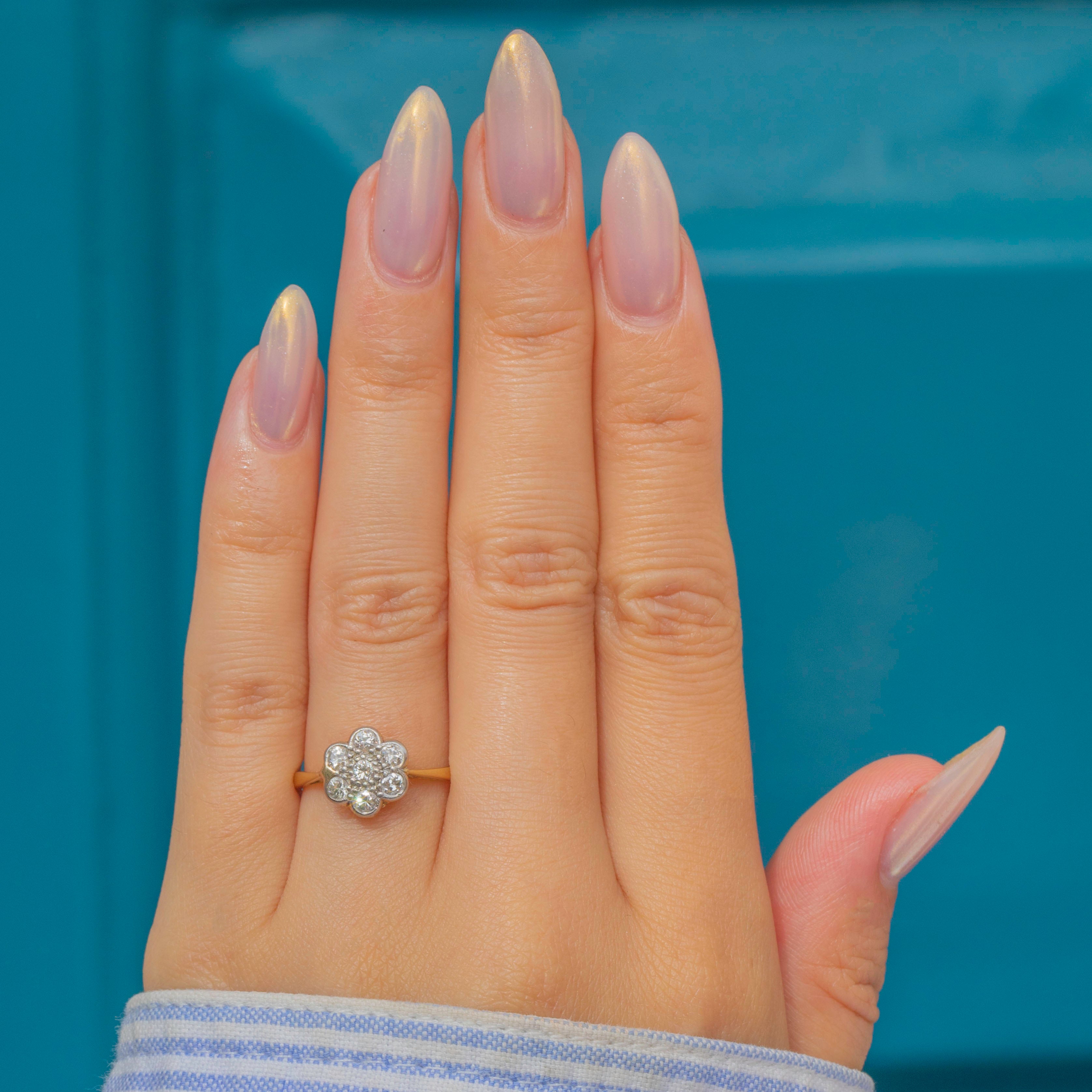 A charming Art Deco Diamond flower cluster ring in 18ct Gold and Platinum, c.1920. The ring features seven natural Diamonds set in a delicate flower-shaped cluster, with each Diamond nestled in a Platinum bezel. Together, they create a soft sparkle and a timelessly romantic motif that has been loved for generations.