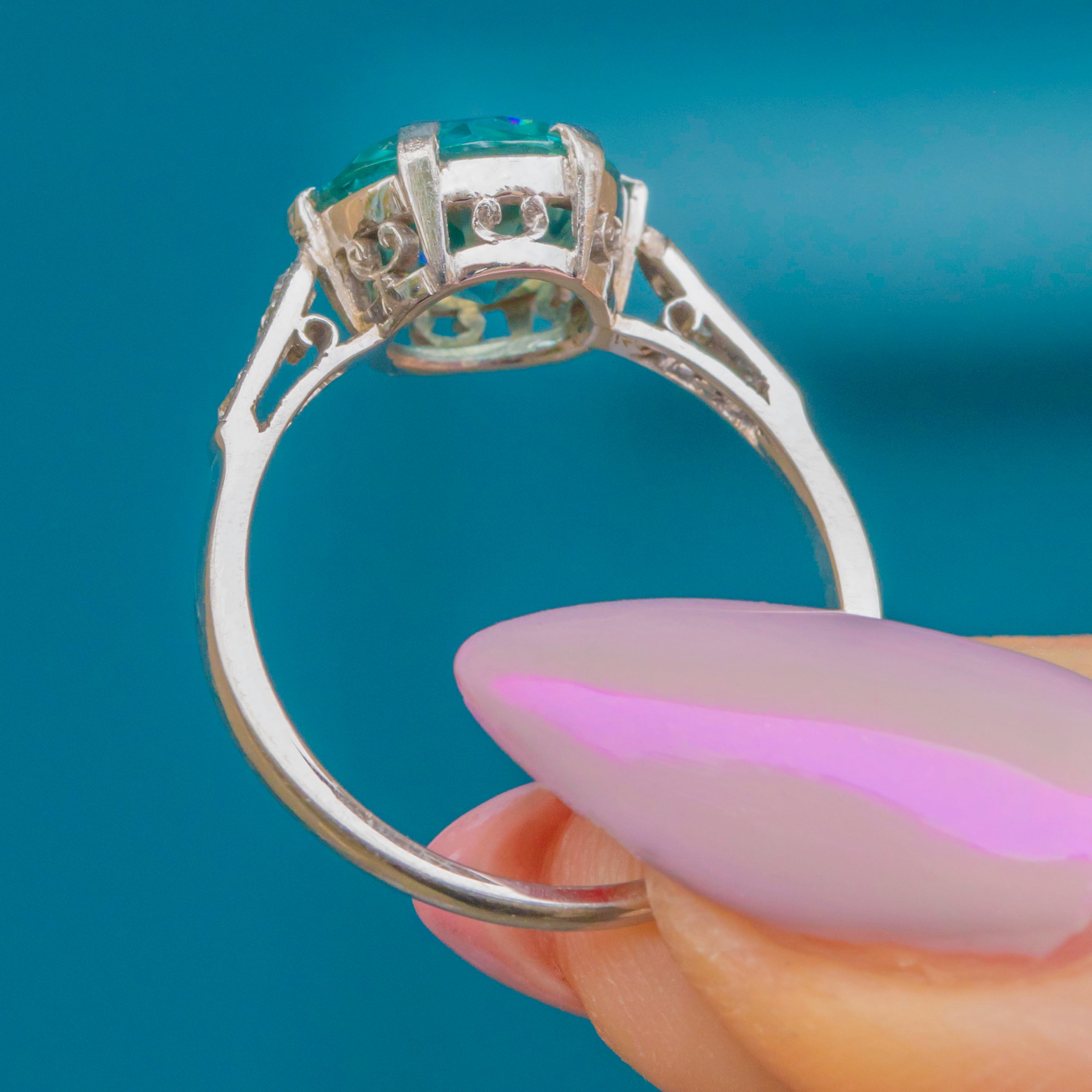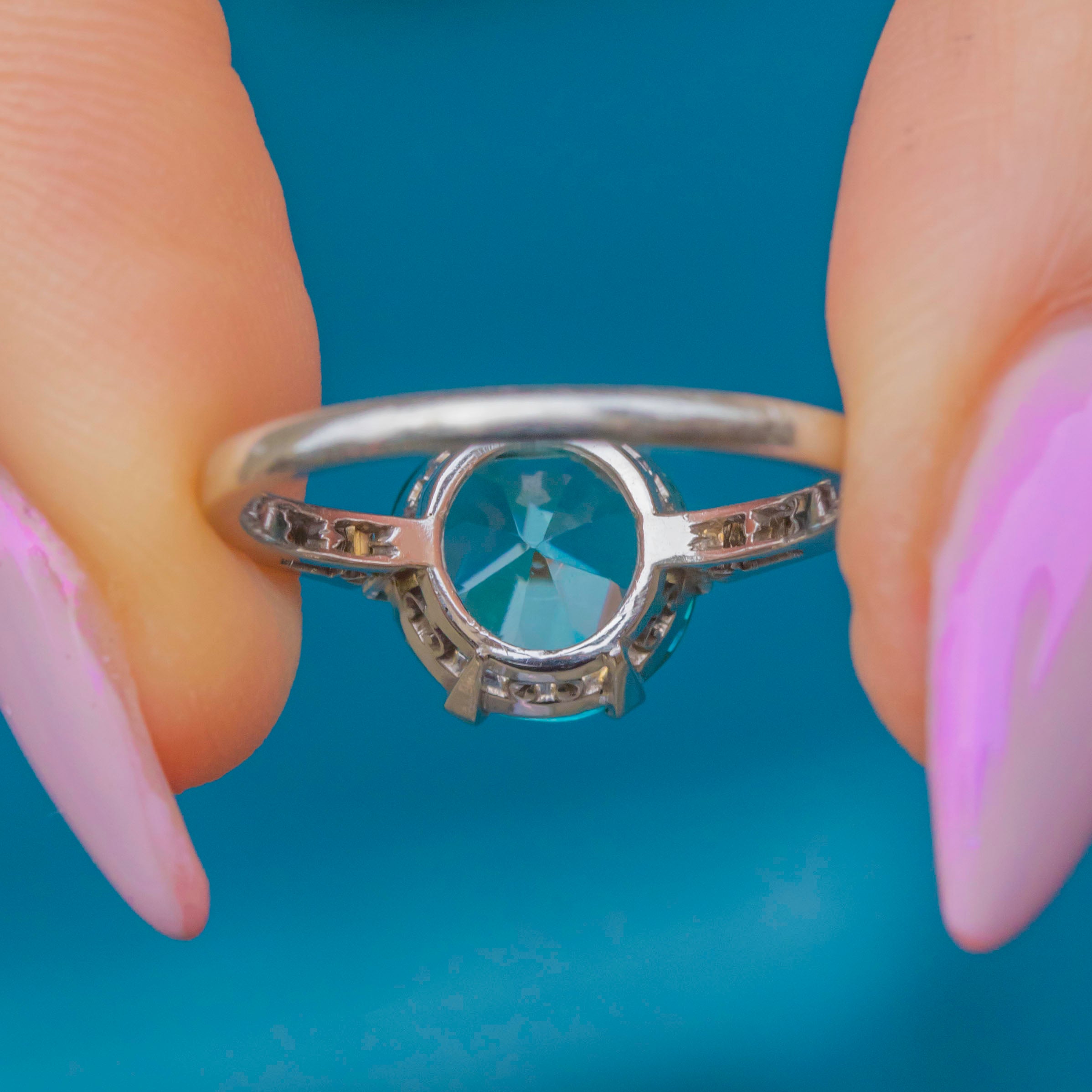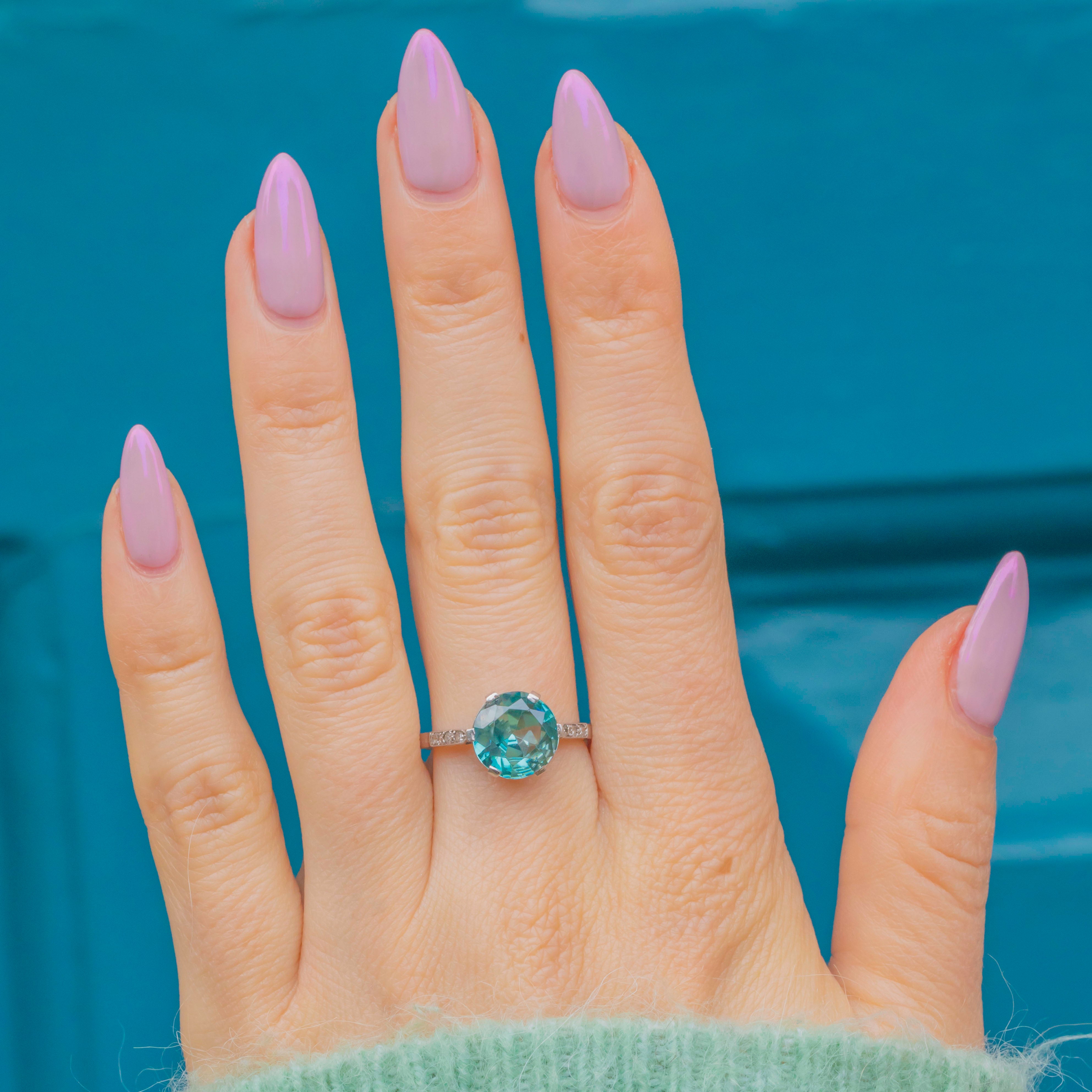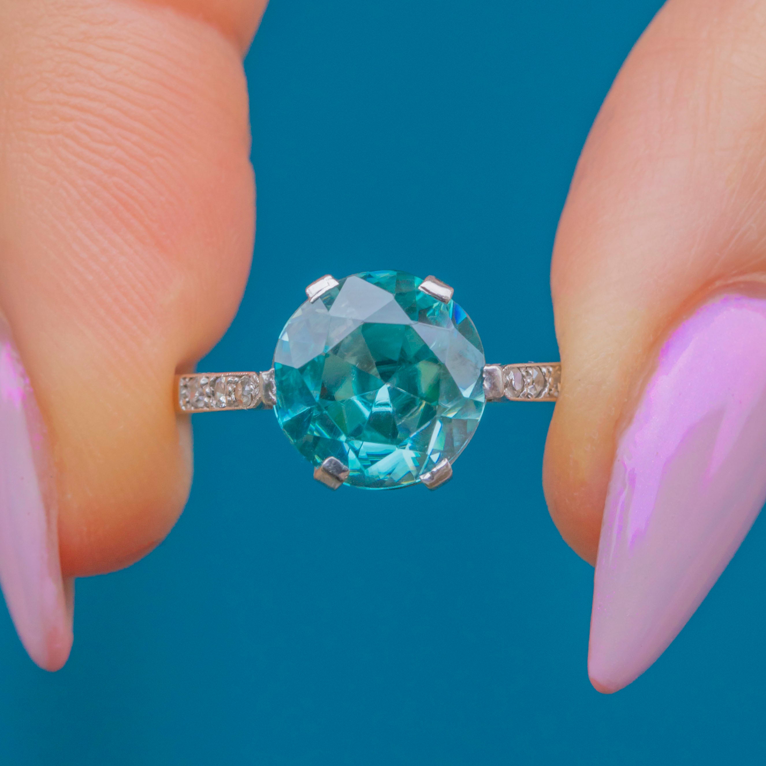 This elegant Art Deco ring is centred with a vivid 2.70ct blue Zircon, full of brilliance and fire, flanked by six twinkling old-cut Diamonds set into Platinum shoulders. The cool, lustrous Platinum contrasts beautifully with the rich 18ct Gold band, a quintessentially Deco colour pairing.