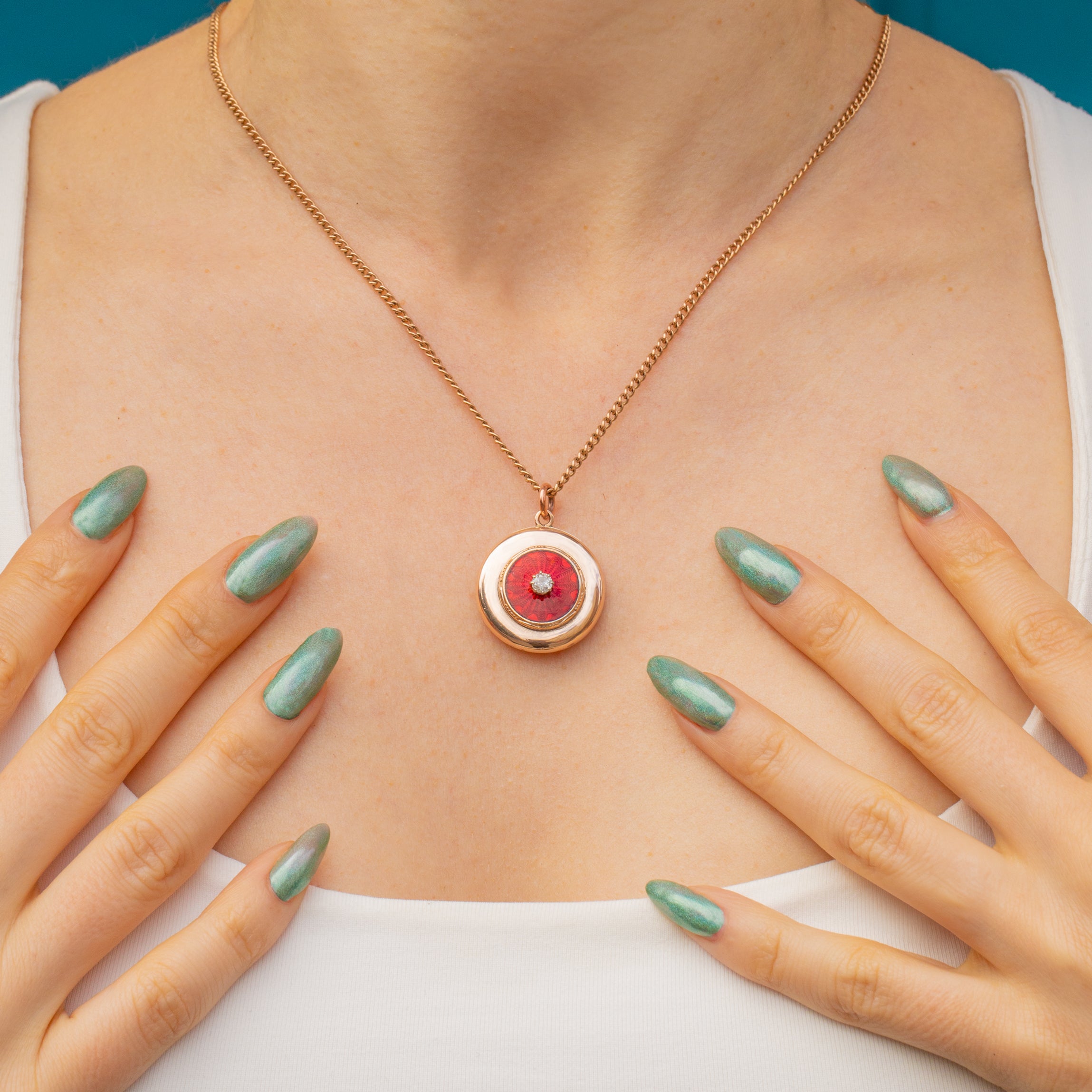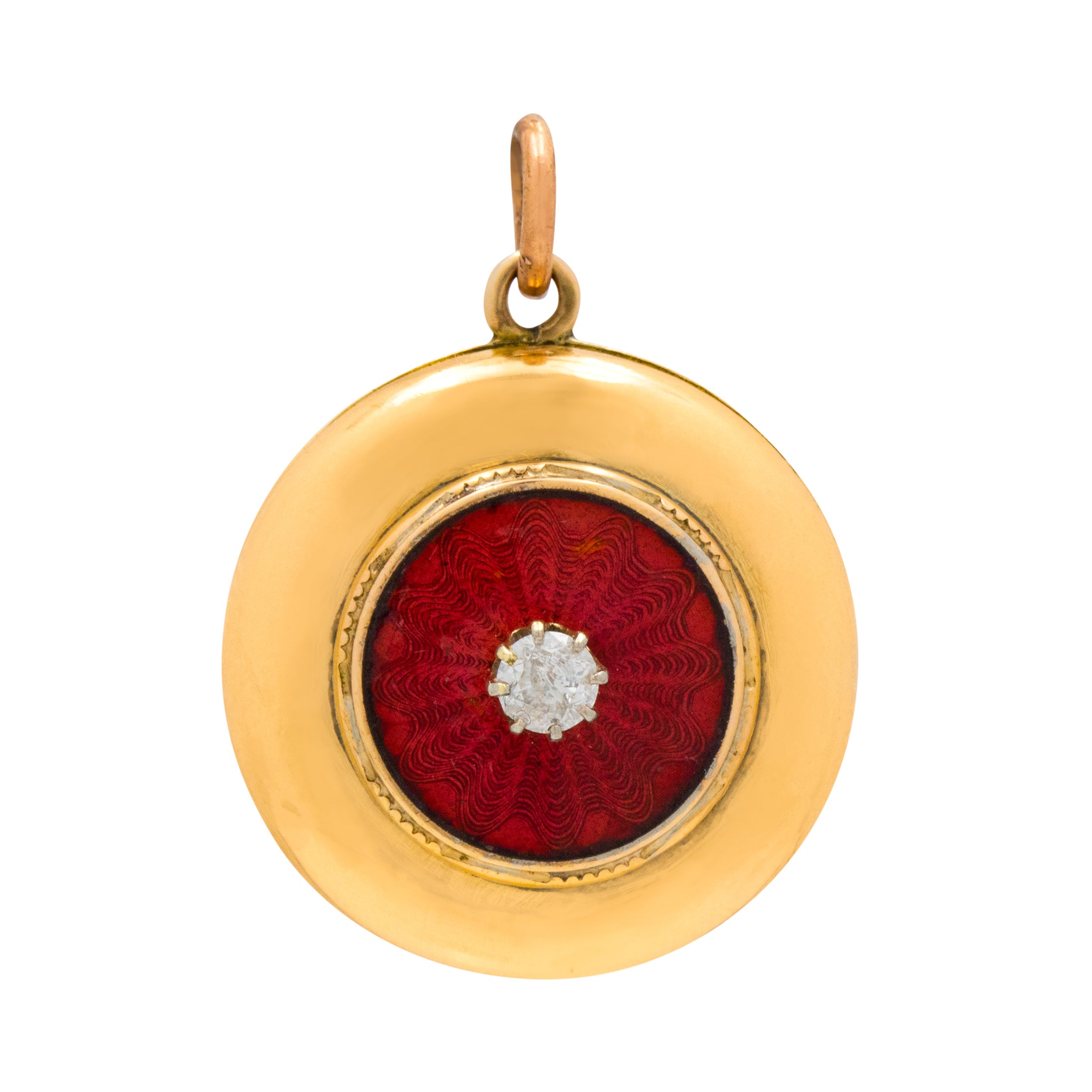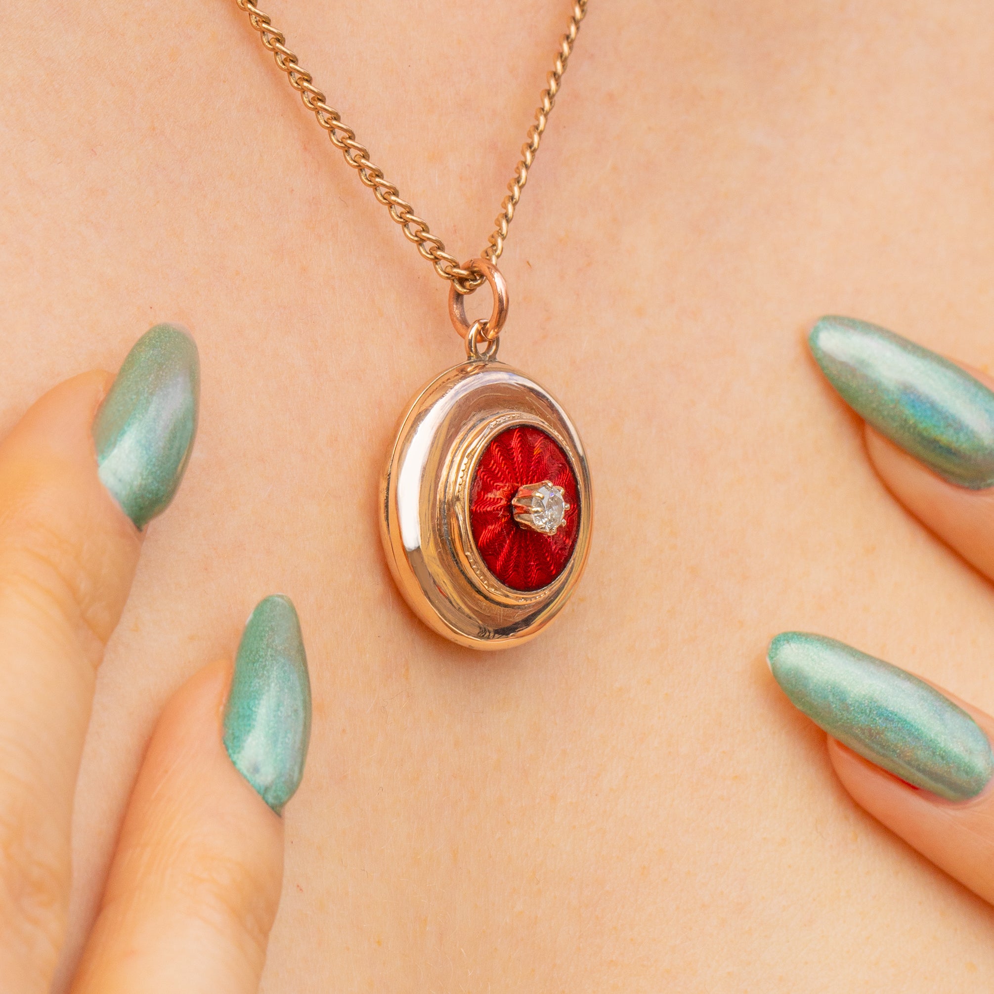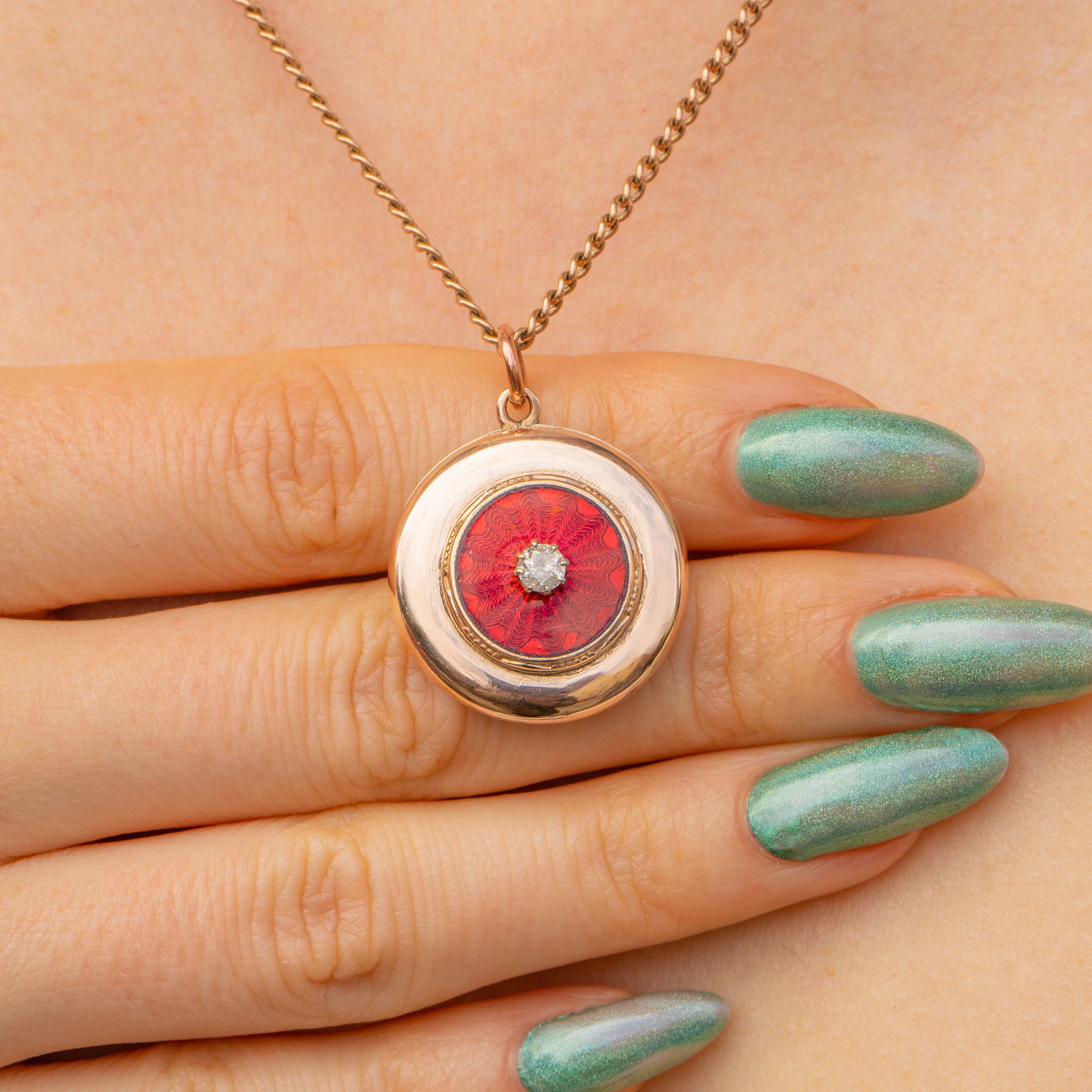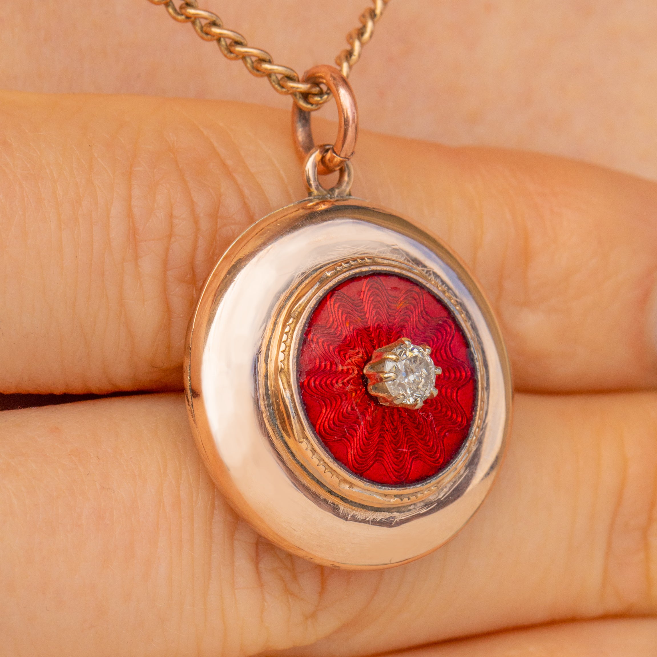 Crafted with meticulous attention to detail, this Art Deco locket has been formed of buttery 9ct Gold inlaid with a scintillating Diamond surrounded by Guilloché Enamel, creating a feast for the eyes! Whether a special treat for yourself or a thoughtful gift for a loved one, this special piece of Art Deco jewellery will become a treasured and sentimental heirloom!