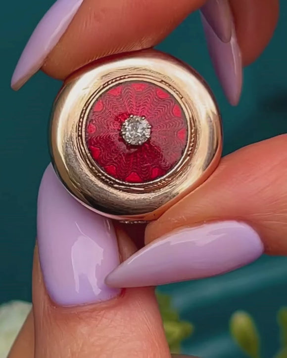 VERY GOOD. This Art Deco 9ct Gold Enamel Diamond family locket is in very good condition. The Gold is buttery throughout and the Guilloché Enamel is pristine, which is no mean feat when considering her grand age! The locket has all its original frames in place but has lost the glass through time. The Gold-tone metal inside exhibits some wear, but this does not affect the structural integrity of the locket and cannot be seen while worn. The Diamond is securely set and is free from fleabites or abrasions, bringing a wonderful sparkle to the piece. With securely closing locket doors, you can wear this piece with absolute confidence!