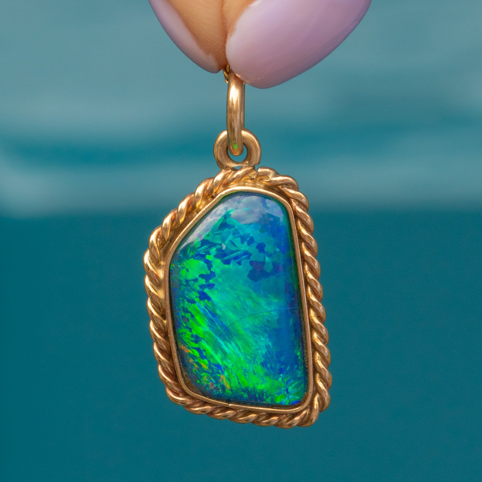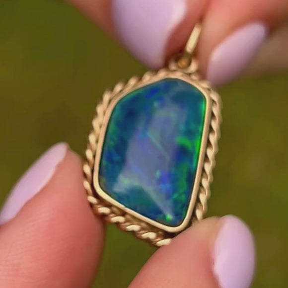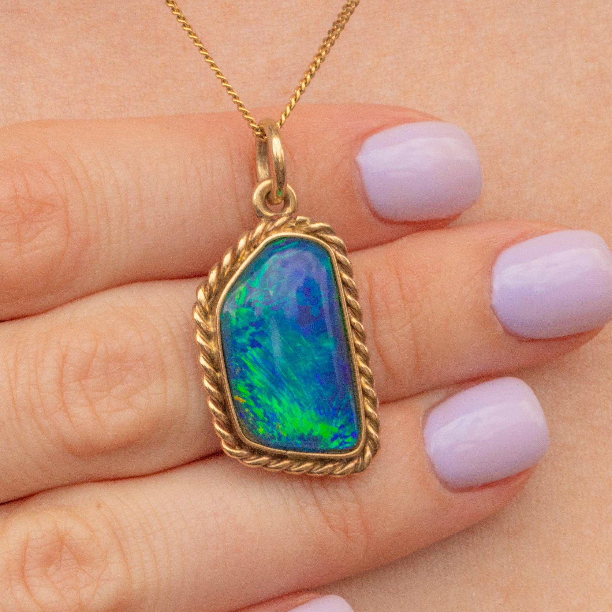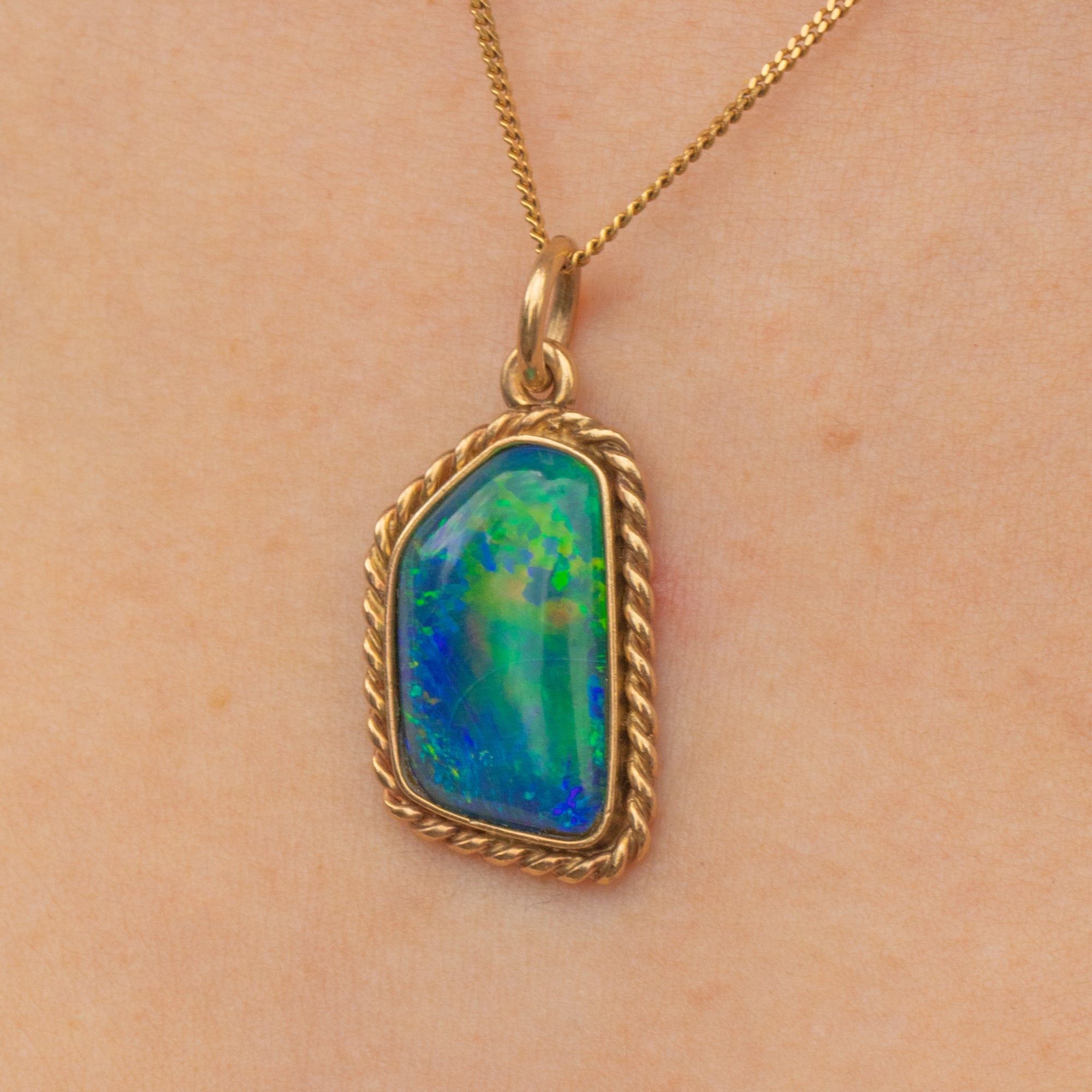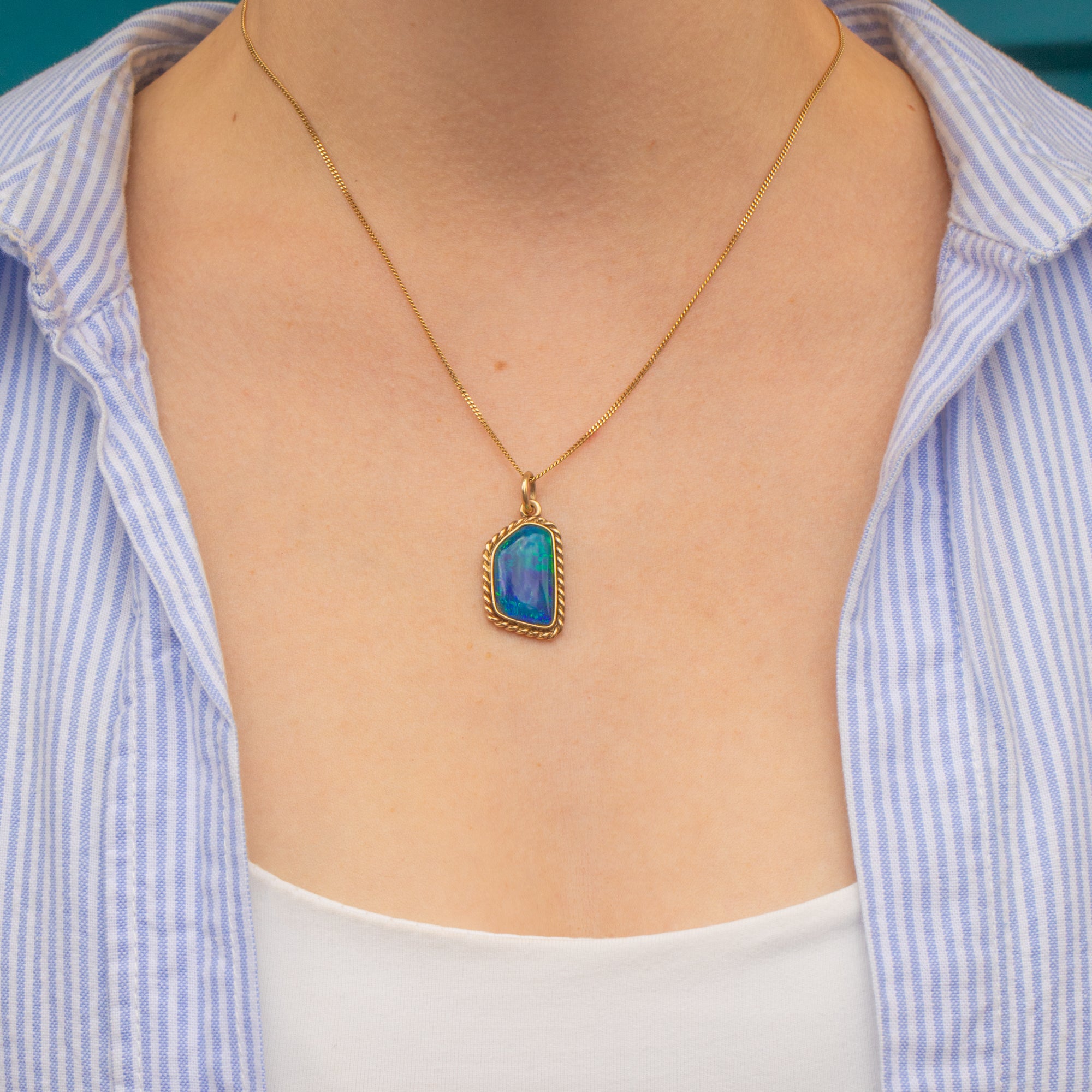 EXCELLENT. This Art Deco 9ct Gold black Opal doublet pendant is in excellent condition. The Opal is securely set, smooth to the touch, and has a divine display of colour! The 9ct Gold is buttery with the rope border securely soldered, and sitting flush against the skin.