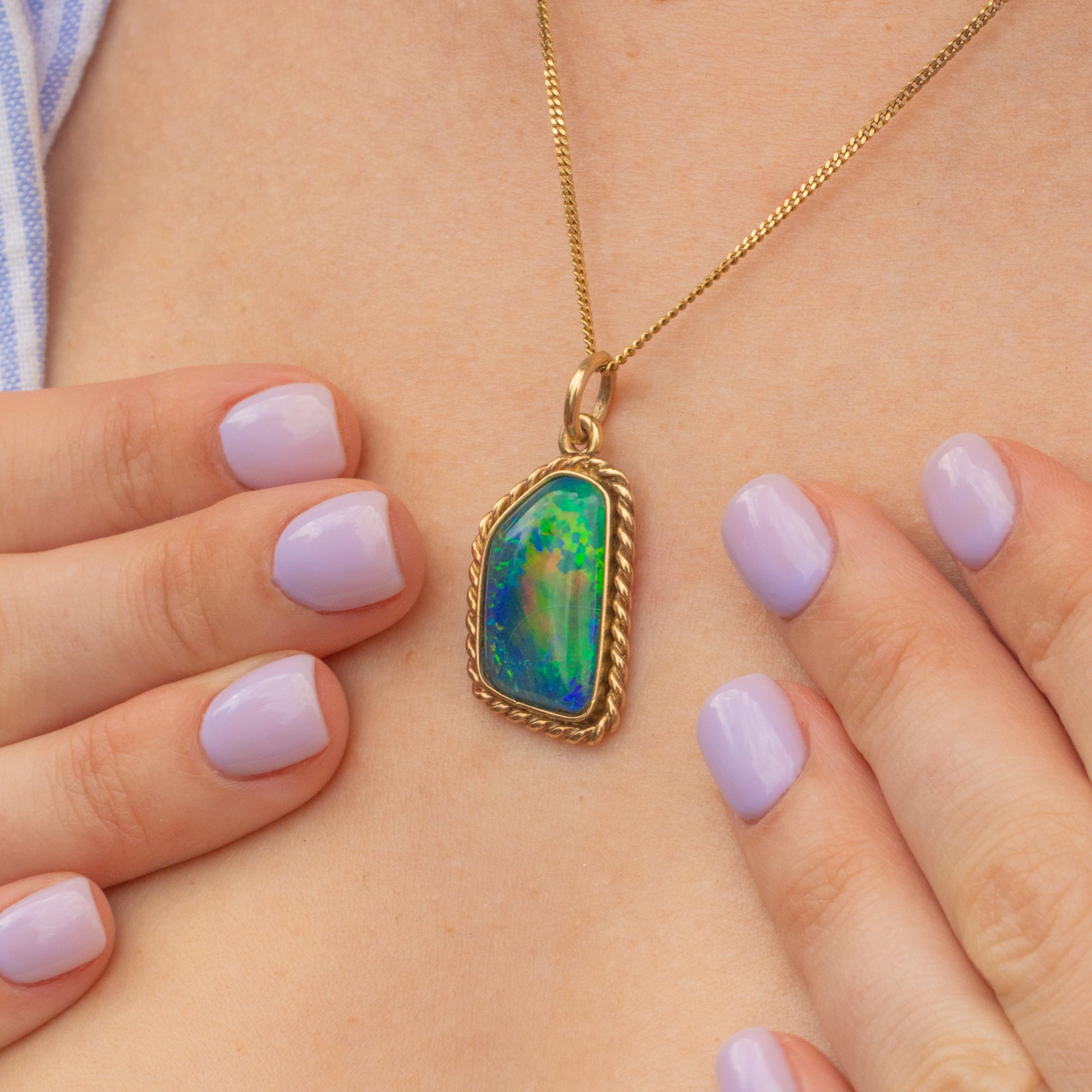 This Art Deco 9ct Gold black Opal doublet pendant is a galactic dream! A generous size with a divine play of colour, this Art Deco pendant embraces an organic form and is the perfect size for daily wear.