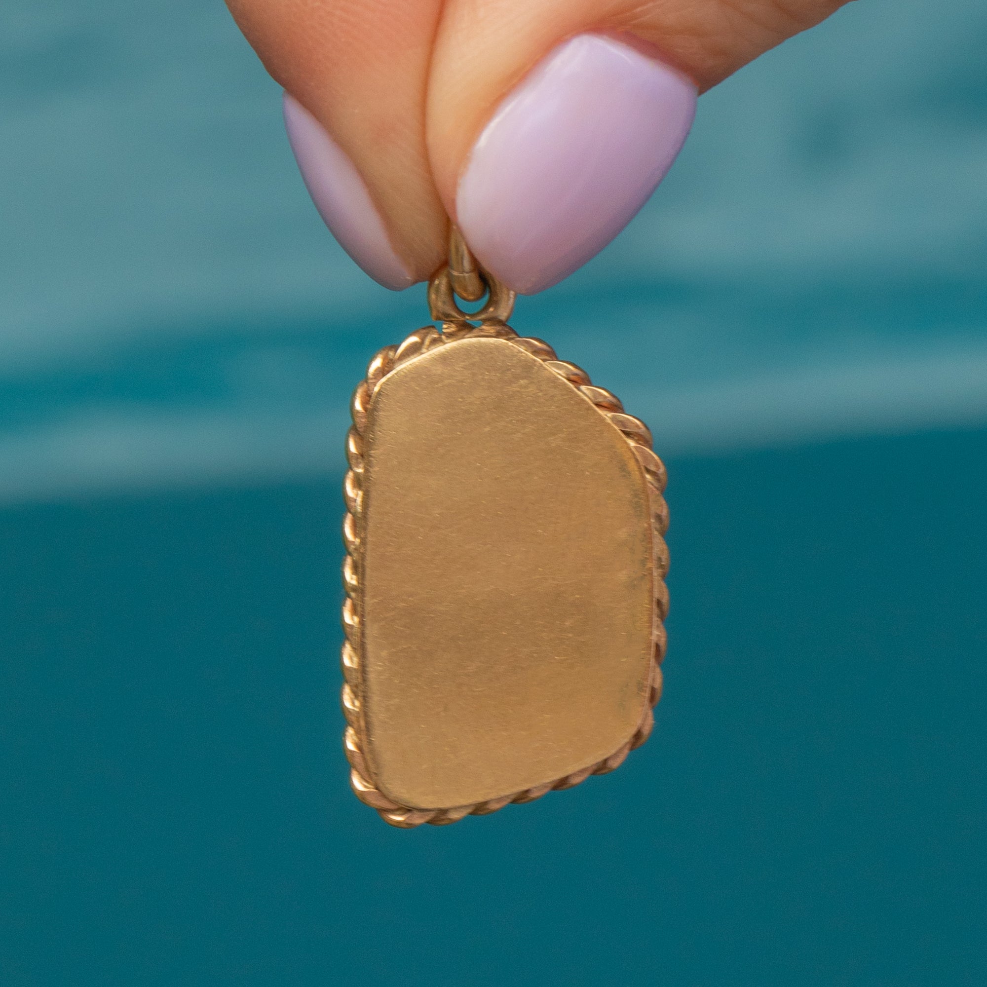 The Opal doublet has a firework display of deep violets, blues, and flashes of orange which come to life under the light. Cushioned snugly within a 9ct Gold bezel and framed by a decorative rope border, this antique Opal pendant is set to become your go-to piece!