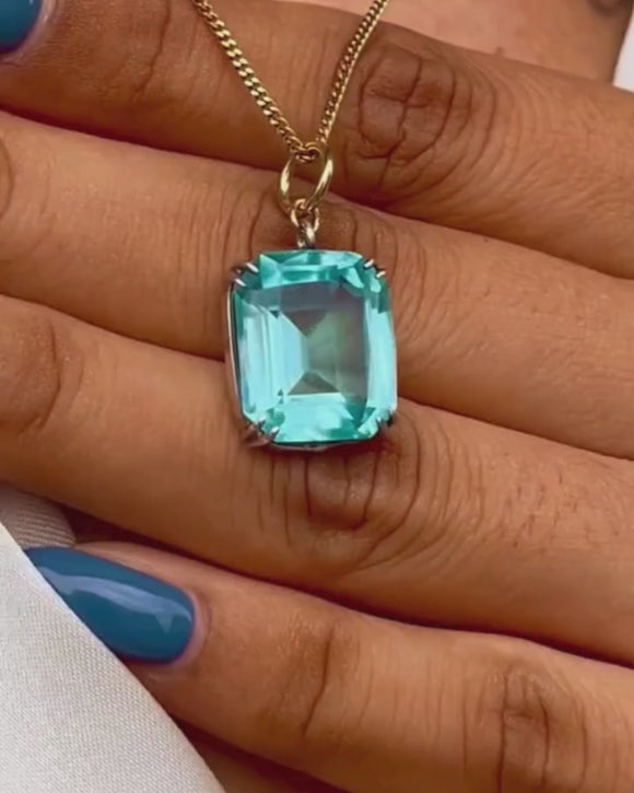 The Sterling Silver settings perfectly compliment the icy tones of her Paste, and her tapered claw settings bring a dash of Deco decadence. Complete with a 9ct Gold jump-ring, all she needs now is an antique Gold chain to suspend this beauty from!