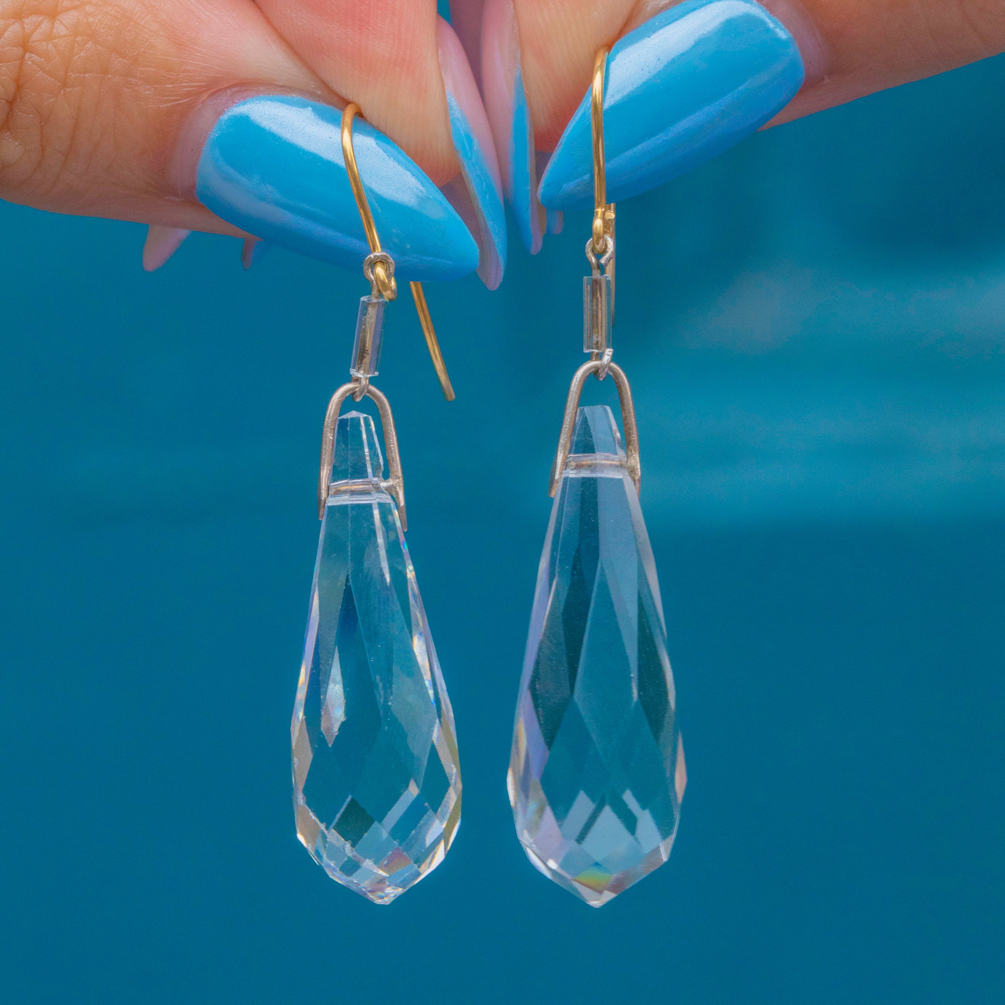 These antique drop earrings each feature a wonderfully faceted transparent Briolette-cut Paste stone which radiates soft rainbow hues as it catches the light.