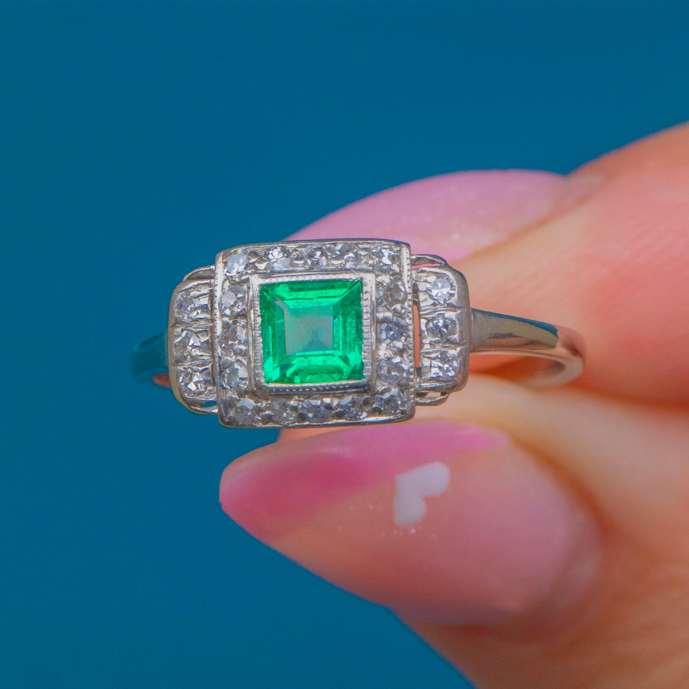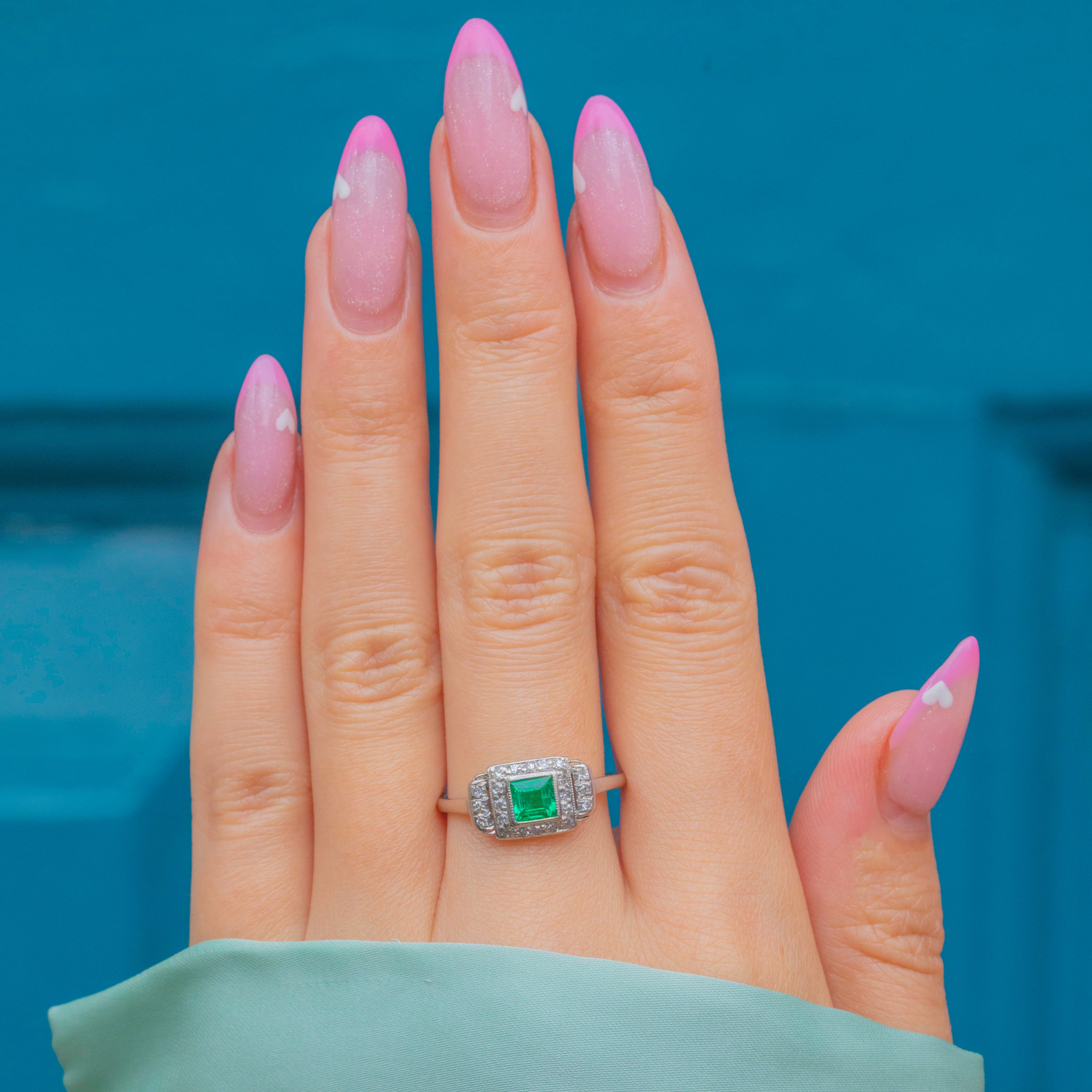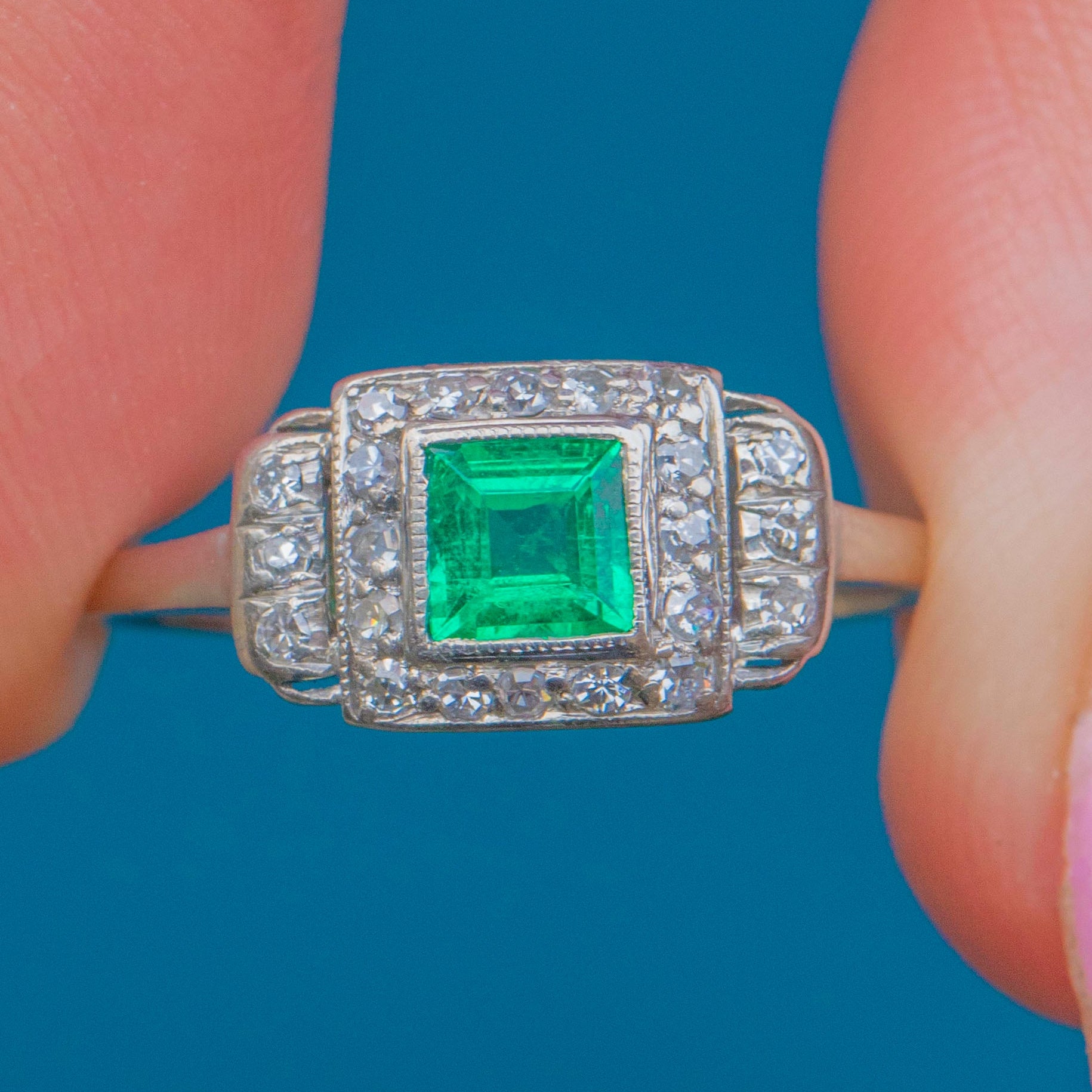 This elegant Art Deco ring showcases a vivid square-cut Emerald framed by a glittering halo of Diamonds, perfectly capturing the geometric glamour of the 1920s. The crisp Platinum setting enhances the Emerald’s rich green hue and the Diamonds’ bright sparkle, creating a timeless and sophisticated piece.