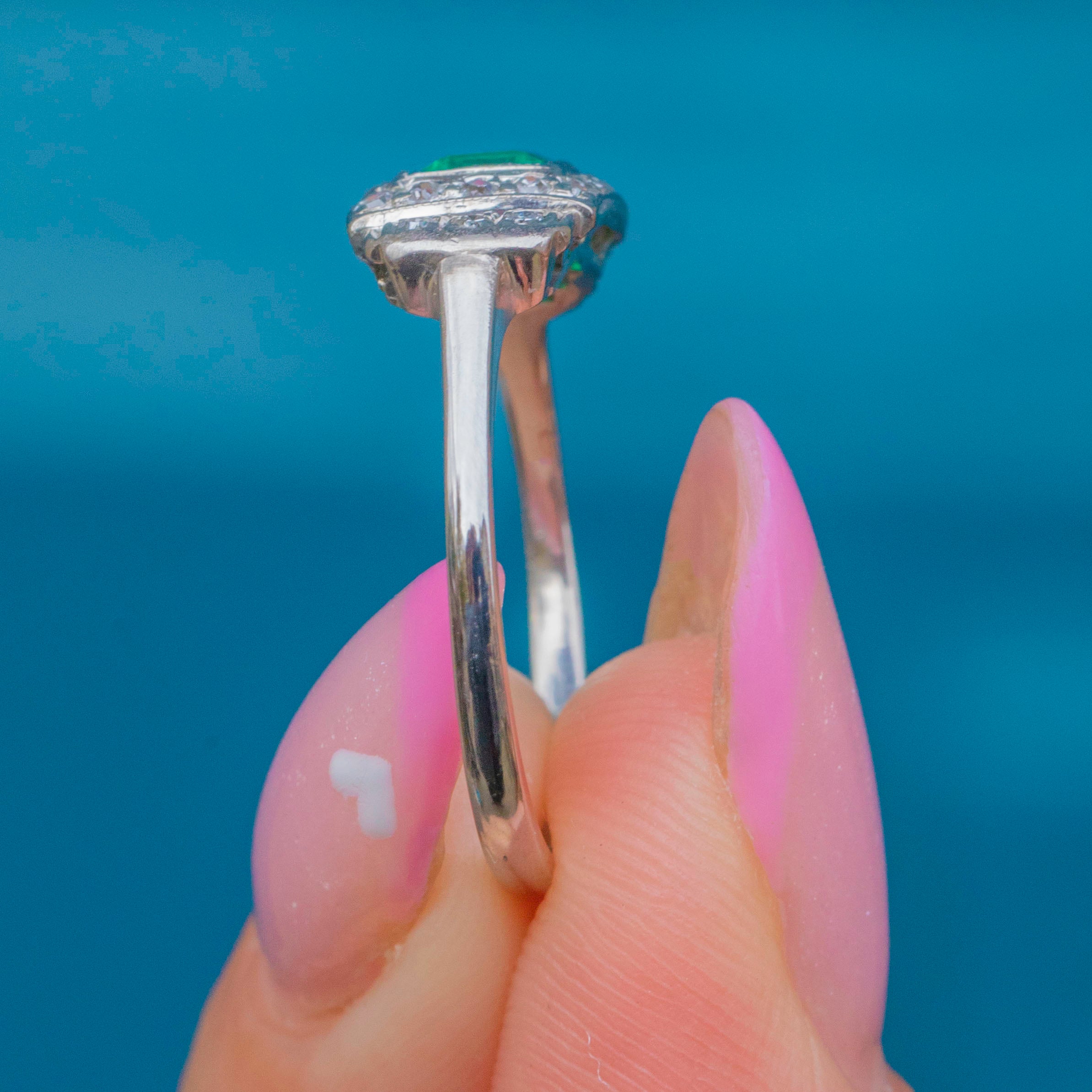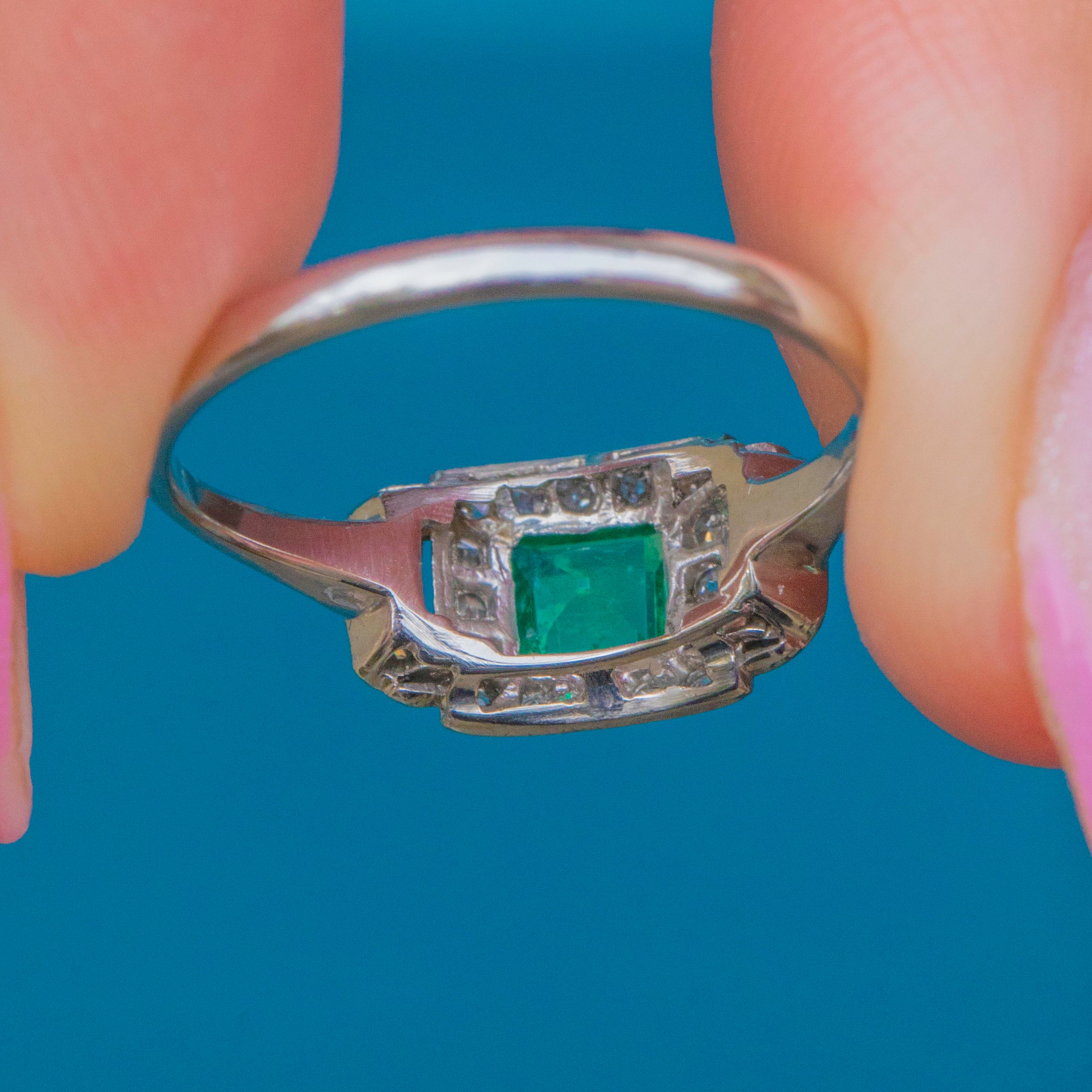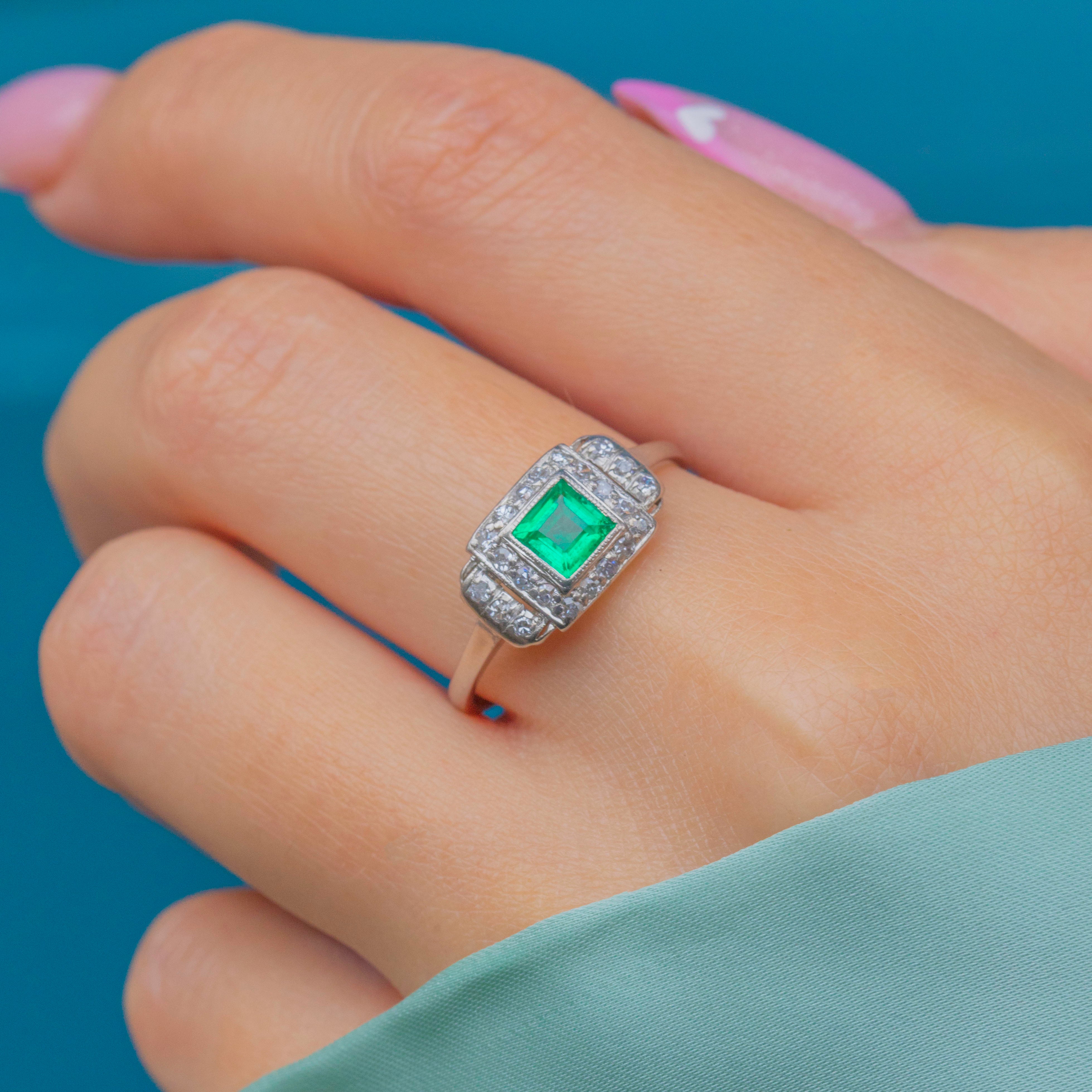 This elegant Art Deco ring showcases a vivid square-cut Emerald framed by a glittering halo of Diamonds, perfectly capturing the geometric glamour of the 1920s. The crisp Platinum setting enhances the Emerald’s rich green hue and the Diamonds’ bright sparkle, creating a timeless and sophisticated piece.