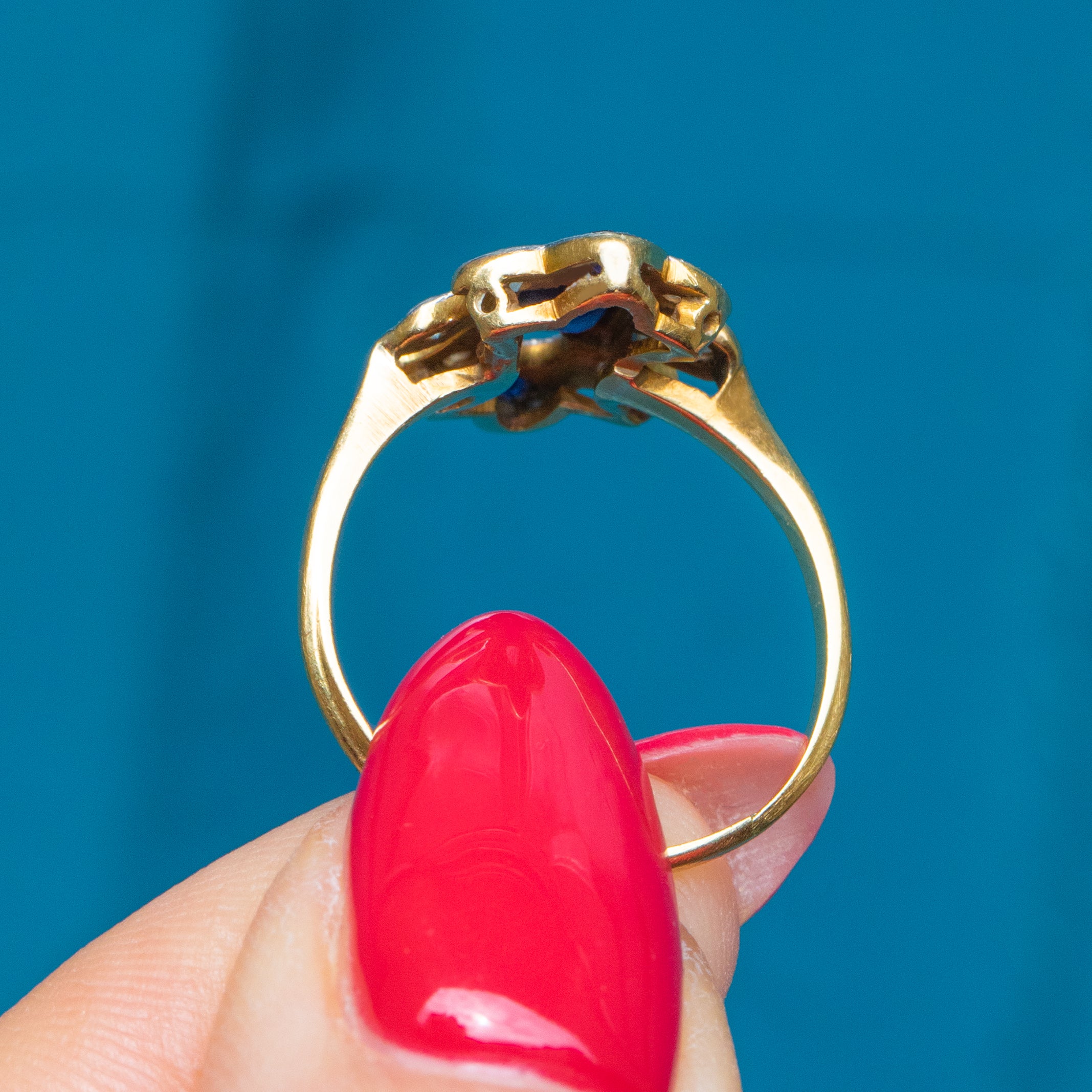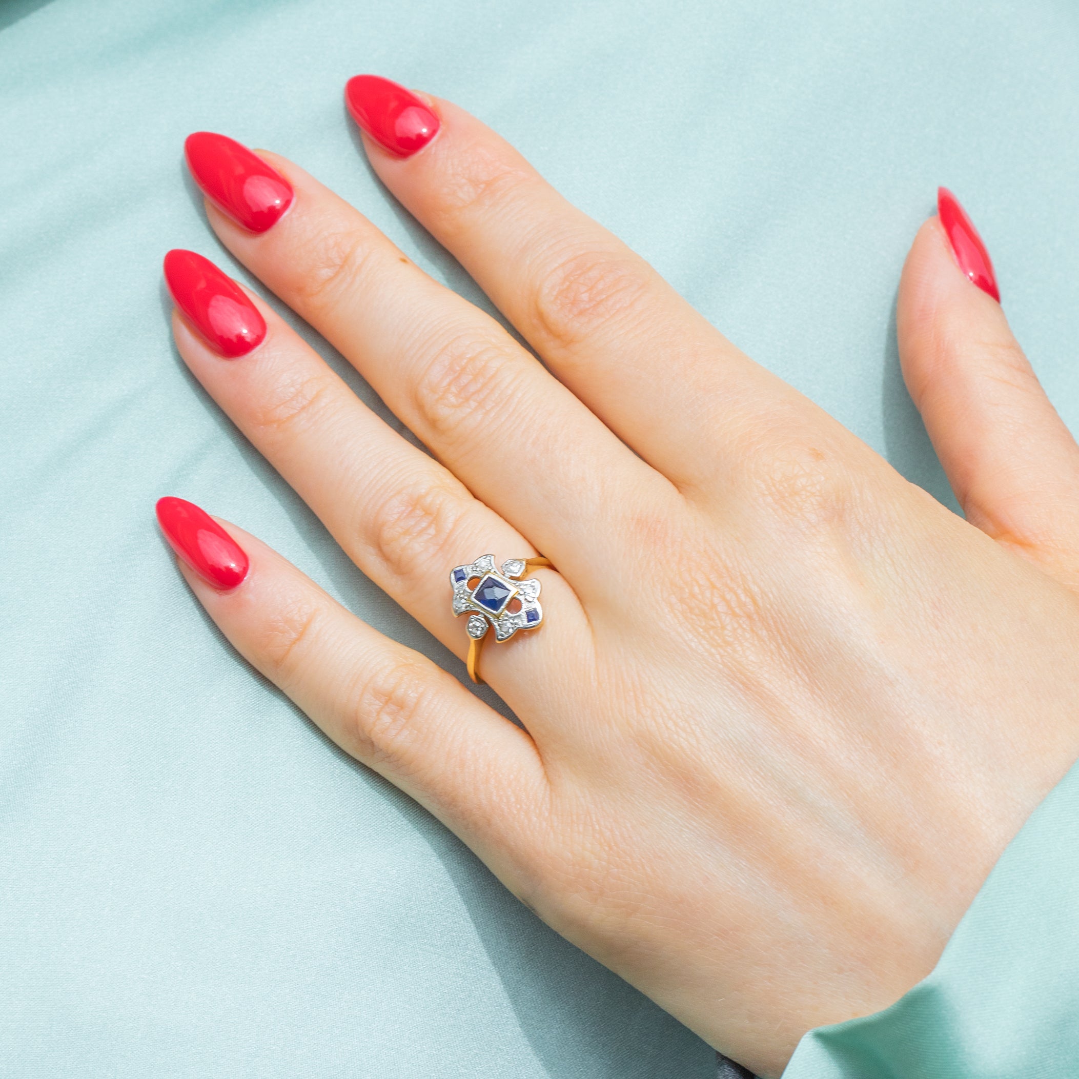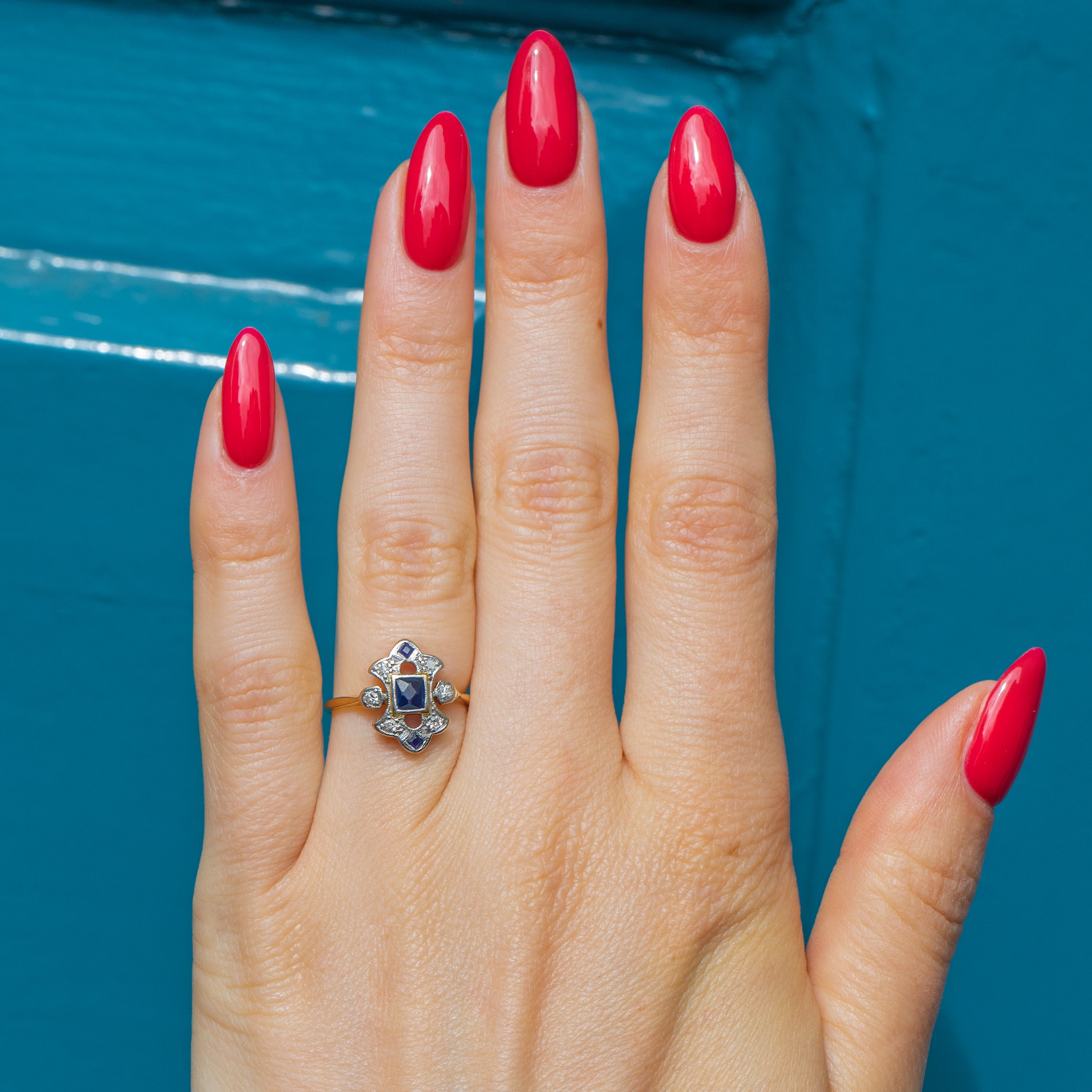 The form of this Sapphire Diamond ring accentuates your hand, and if you are looking for something a little different she would make an exceptional engagement ring choice! With a sleek Gold band that hugs your finger in all the right places, the moment you make this Art Deco ring yours you will wonder how you ever went without!