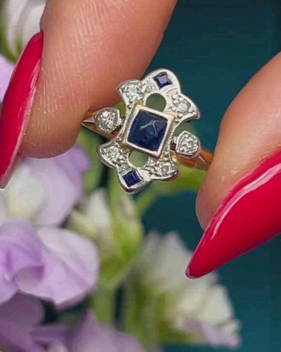 How divine is this Art Deco French-Cut Sapphire and Diamond ring! Her perfectly symmetrical form is quintessentially Art Deco, and to make her even more divine her centre flaunts a deep midnight blue French Cut Sapphire, set amongst a sea of scintillating Diamonds.