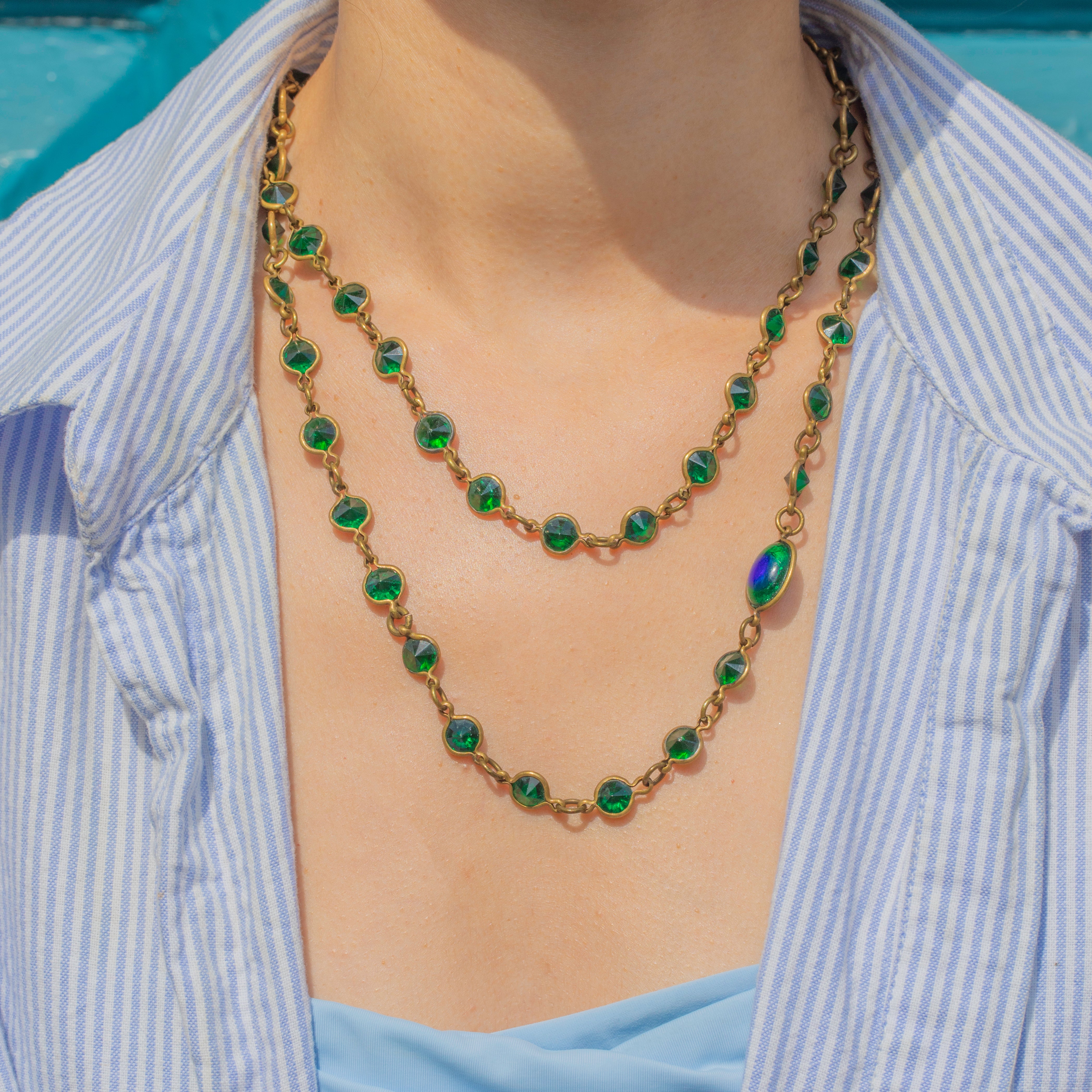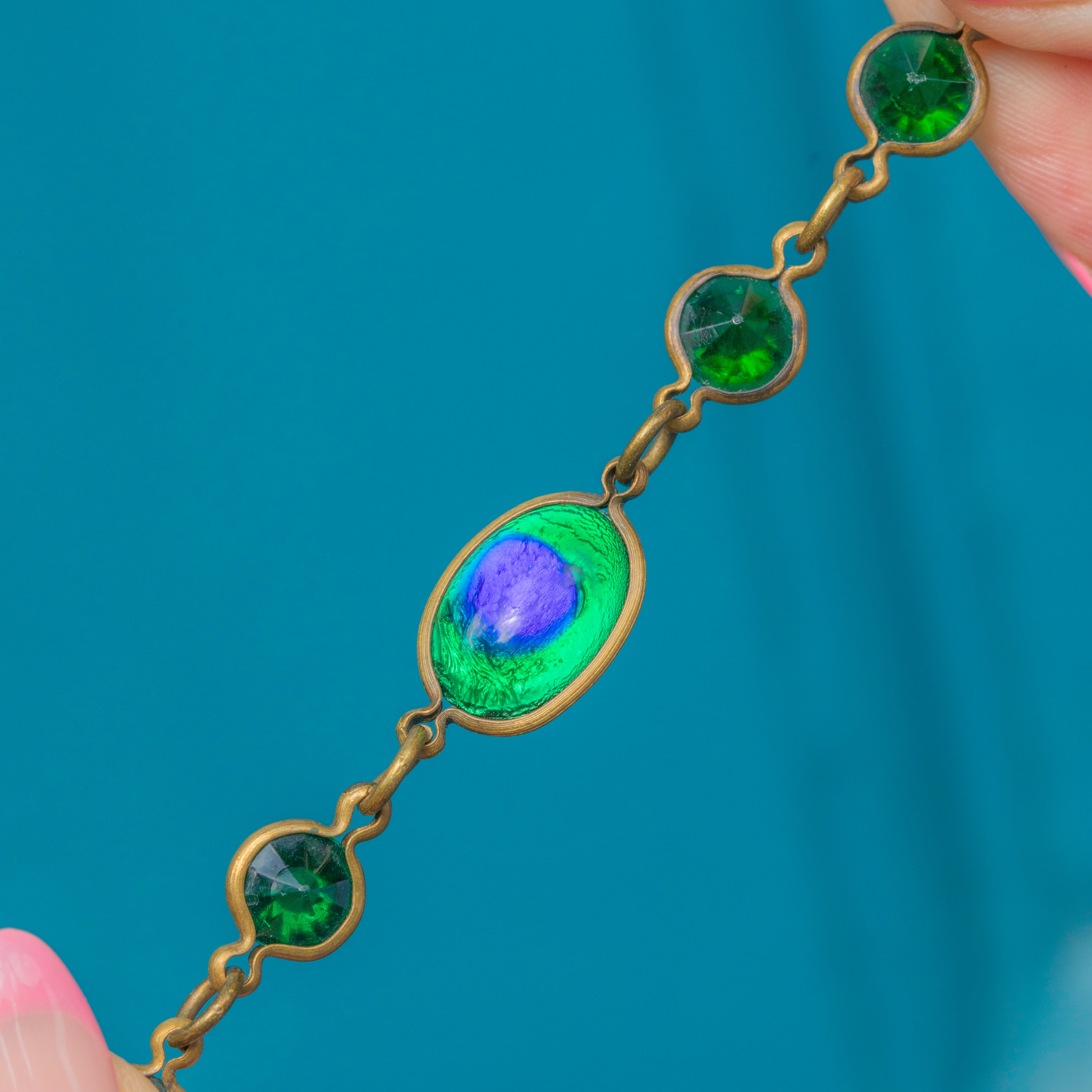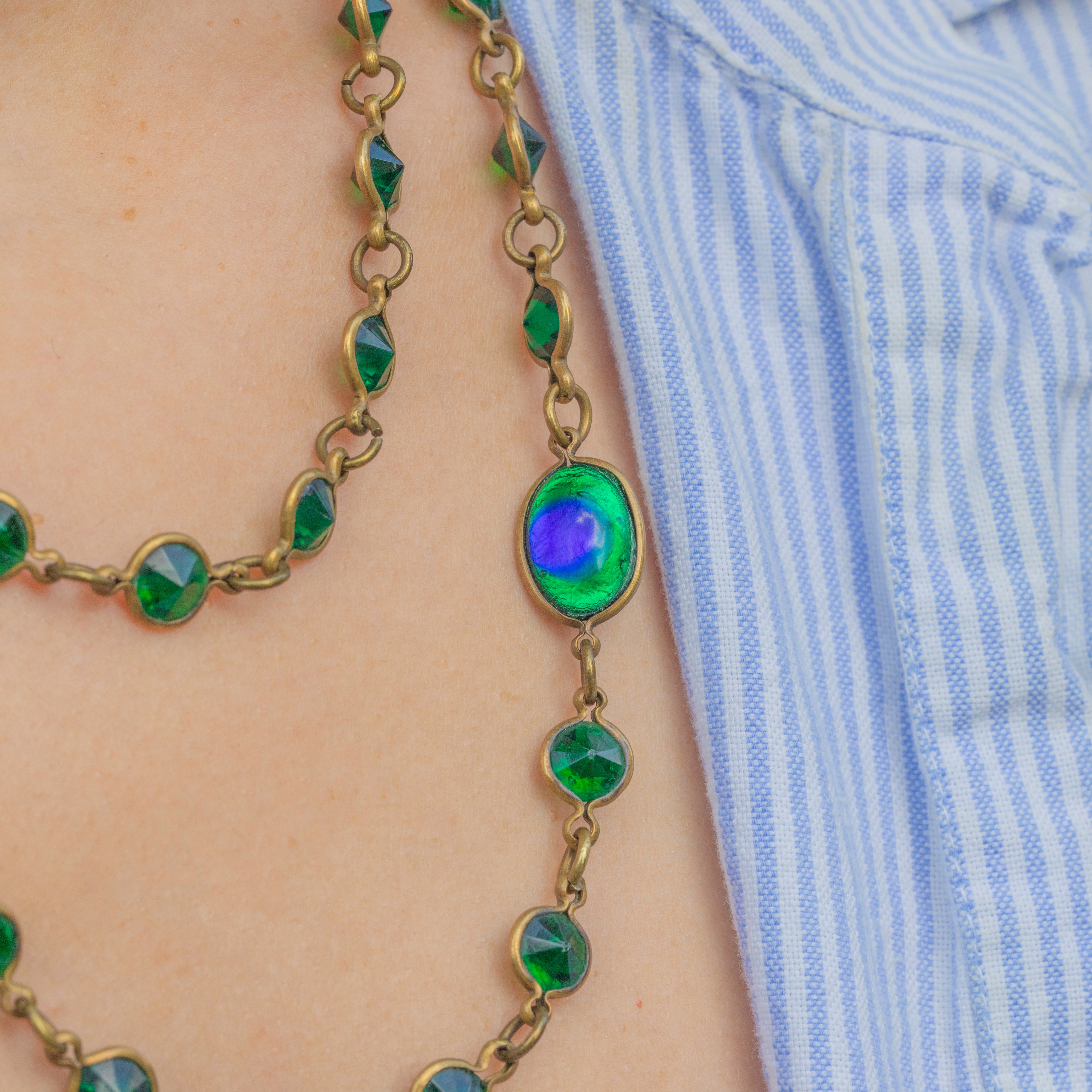 EXCELLENT. This Arts & Crafts green Paste peacock eye longuard necklace is in excellent condition. The necklace is so striking, each bright Paste gem is present and there is only minor surface wear commensurate with age!