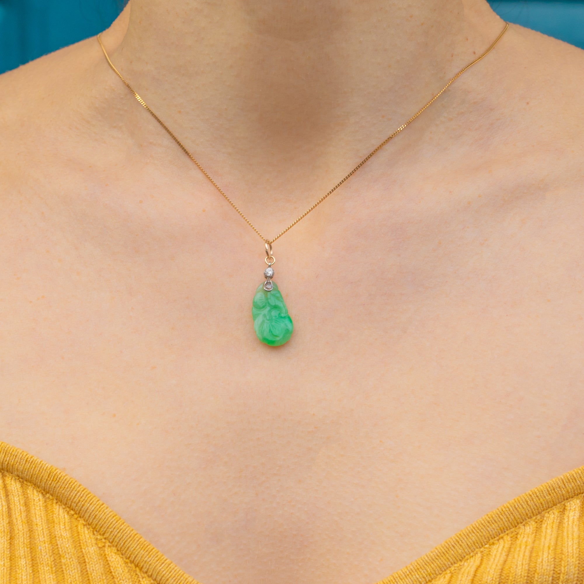 This exquisite piece is masterfully crafted, showcasing a captivating carved Jade centrepiece with intricate detailing and lush, verdant hues. The Jade is gracefully complemented by two shimmering Diamonds that shine delicately beneath the bale, set in a glowing Platinum, adding just the right touch of sparkle.