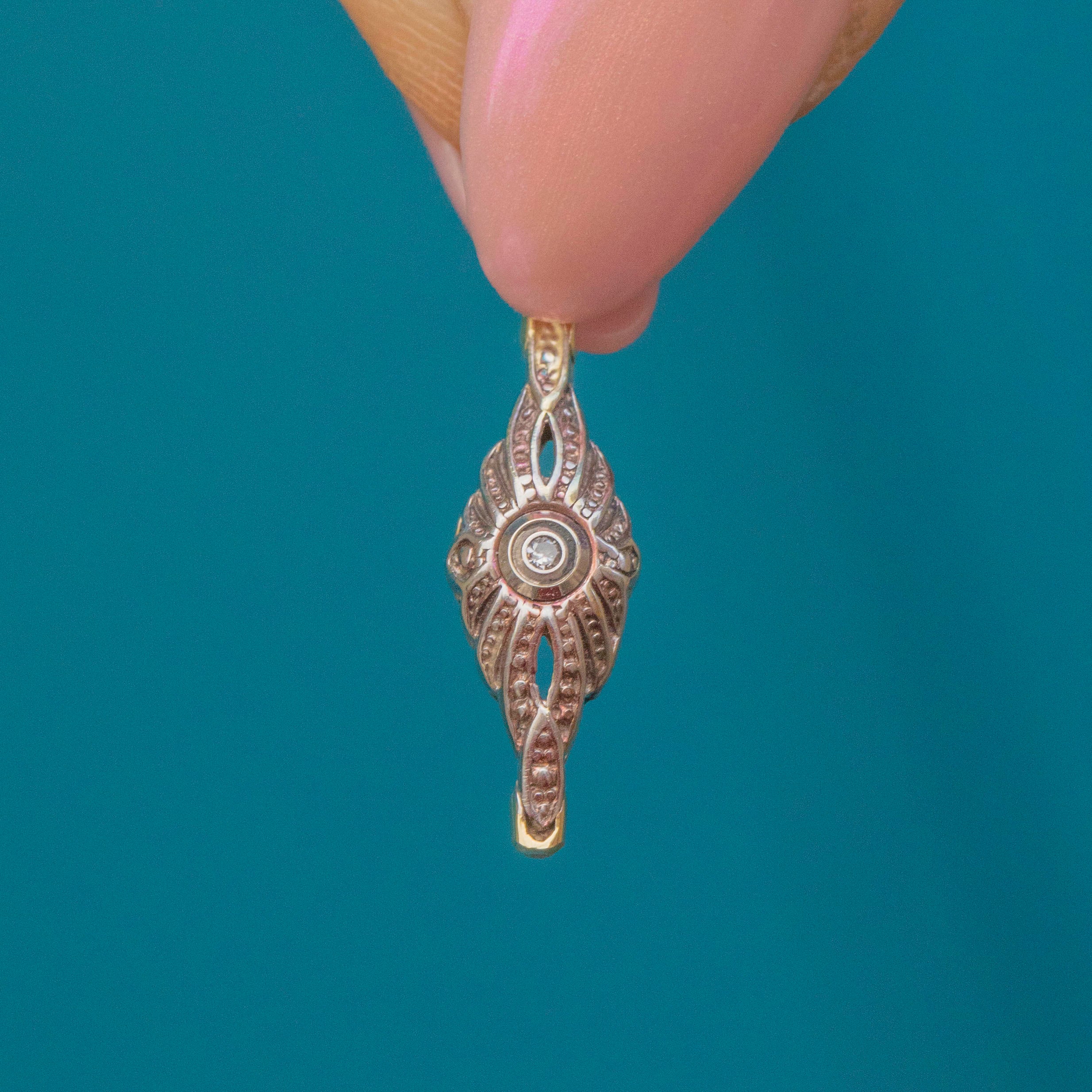 Plucked from the most glamorous era, this Art Deco Platinum Diamond lozenge charm is the perfect piece to add a touch of decadence to your daily attire! The stylistic geometric Deco design has been crafted from lustrous Platinum and backed with 9ct Gold, displaying a petite Diamond in its centre providing a subtle sparkling accent.