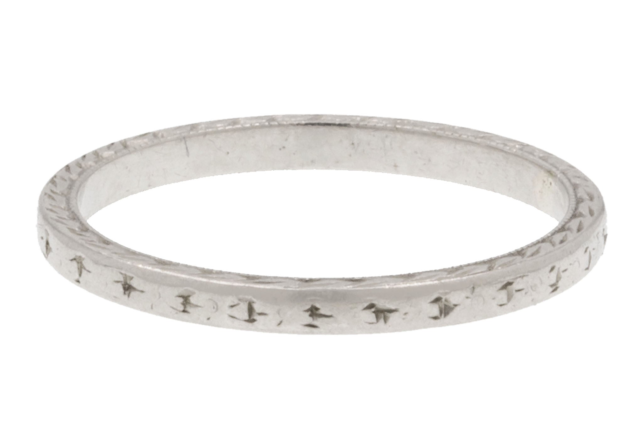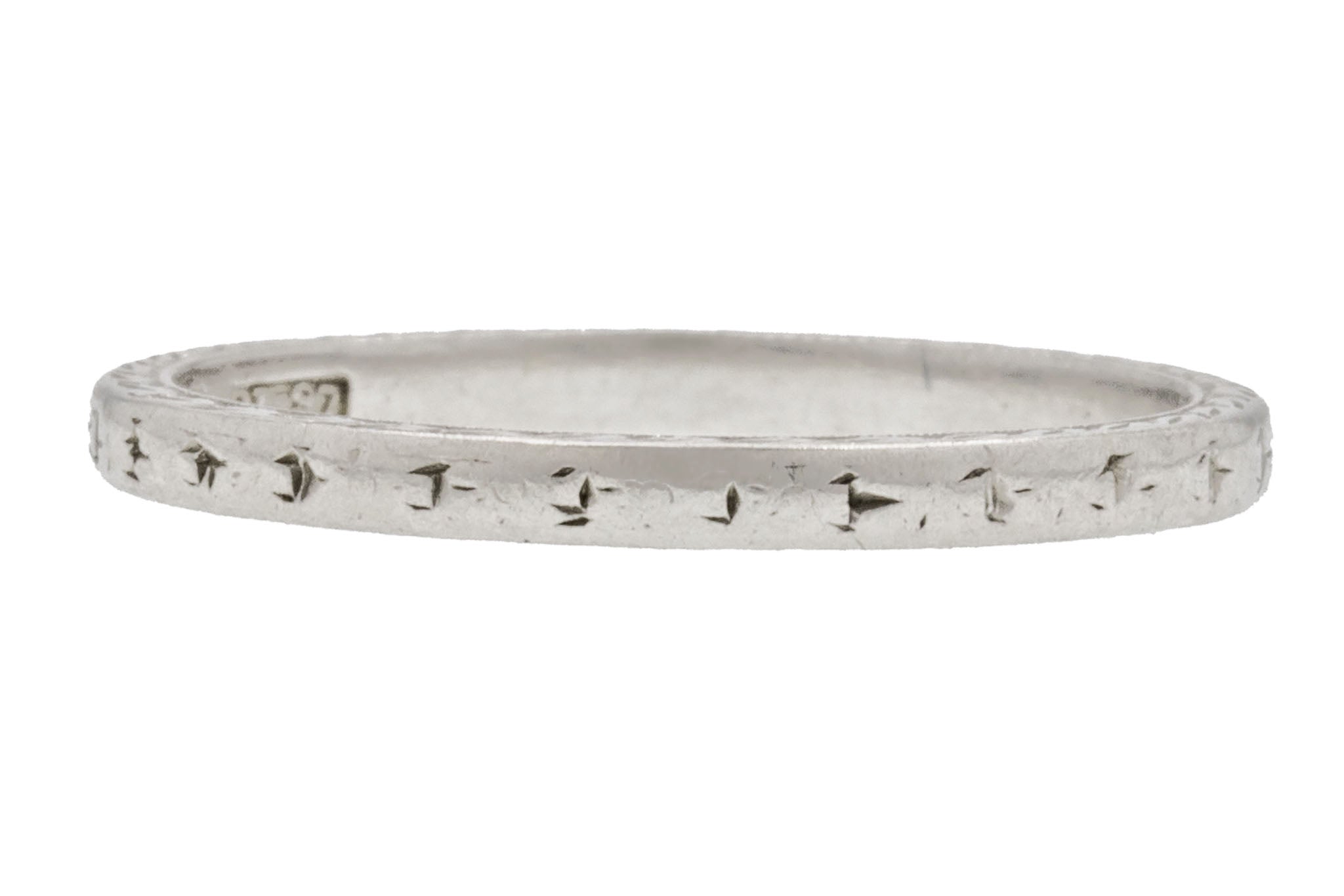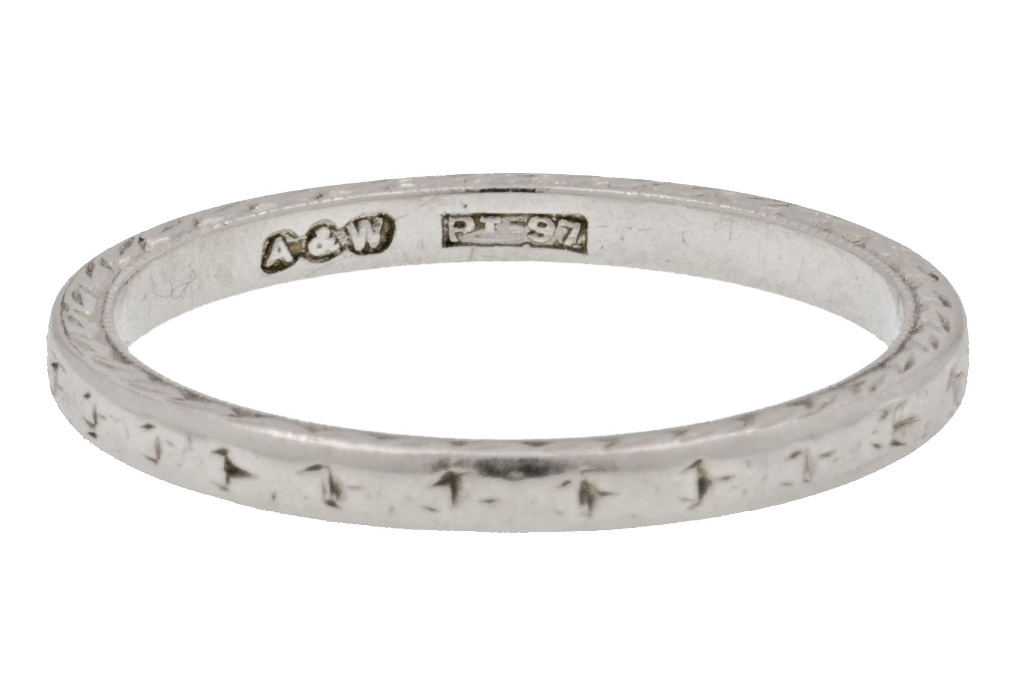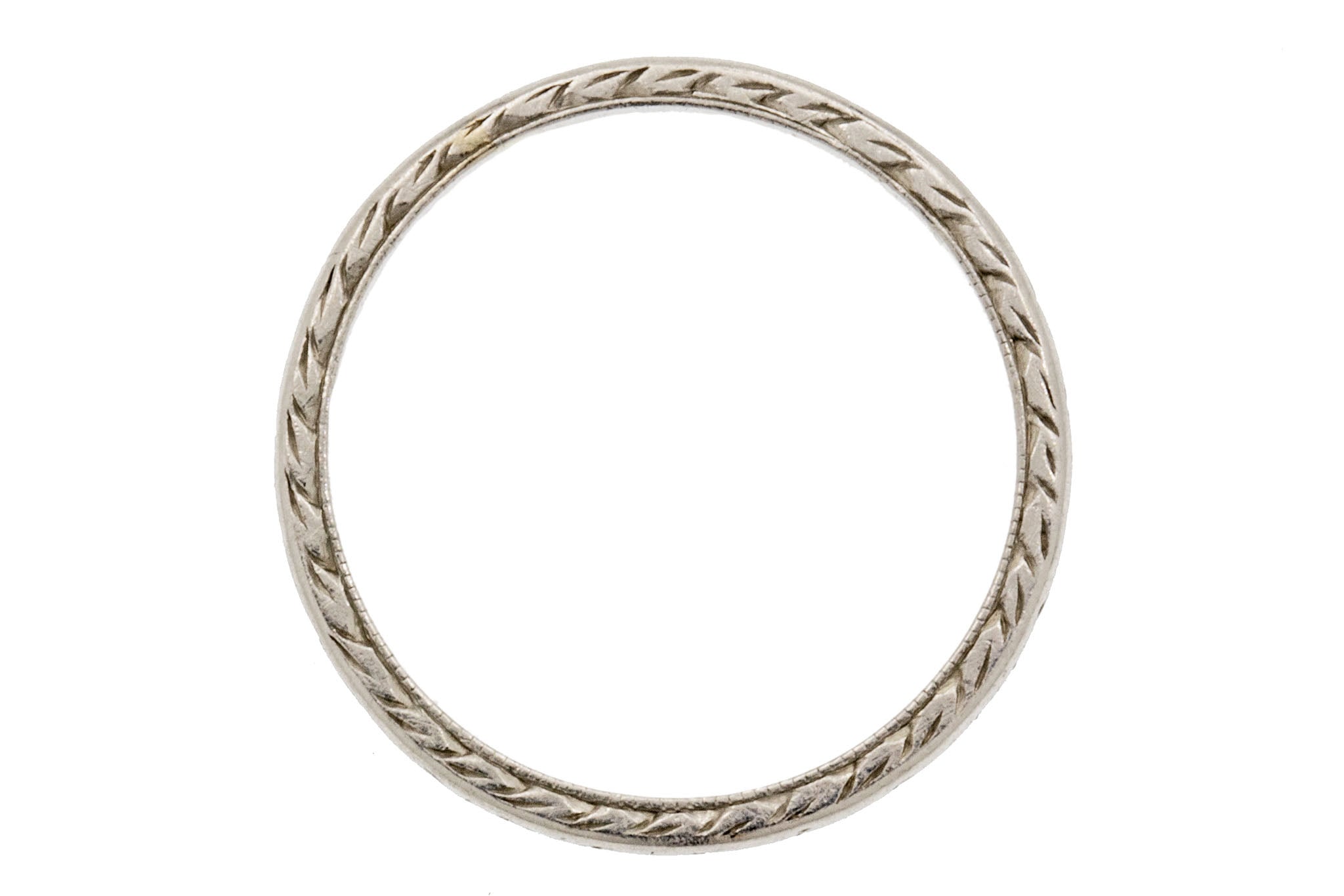 VERY GOOD. This Art Deco Platinum engraved wedding band is in very good condition. The ring has beautifully engraved sides, and the is hallmarked on the inside. The band has some faded orange blossom engravings across its front, which have slowly worn away after years of love. The piece is robust so can be worn every day with confidence!