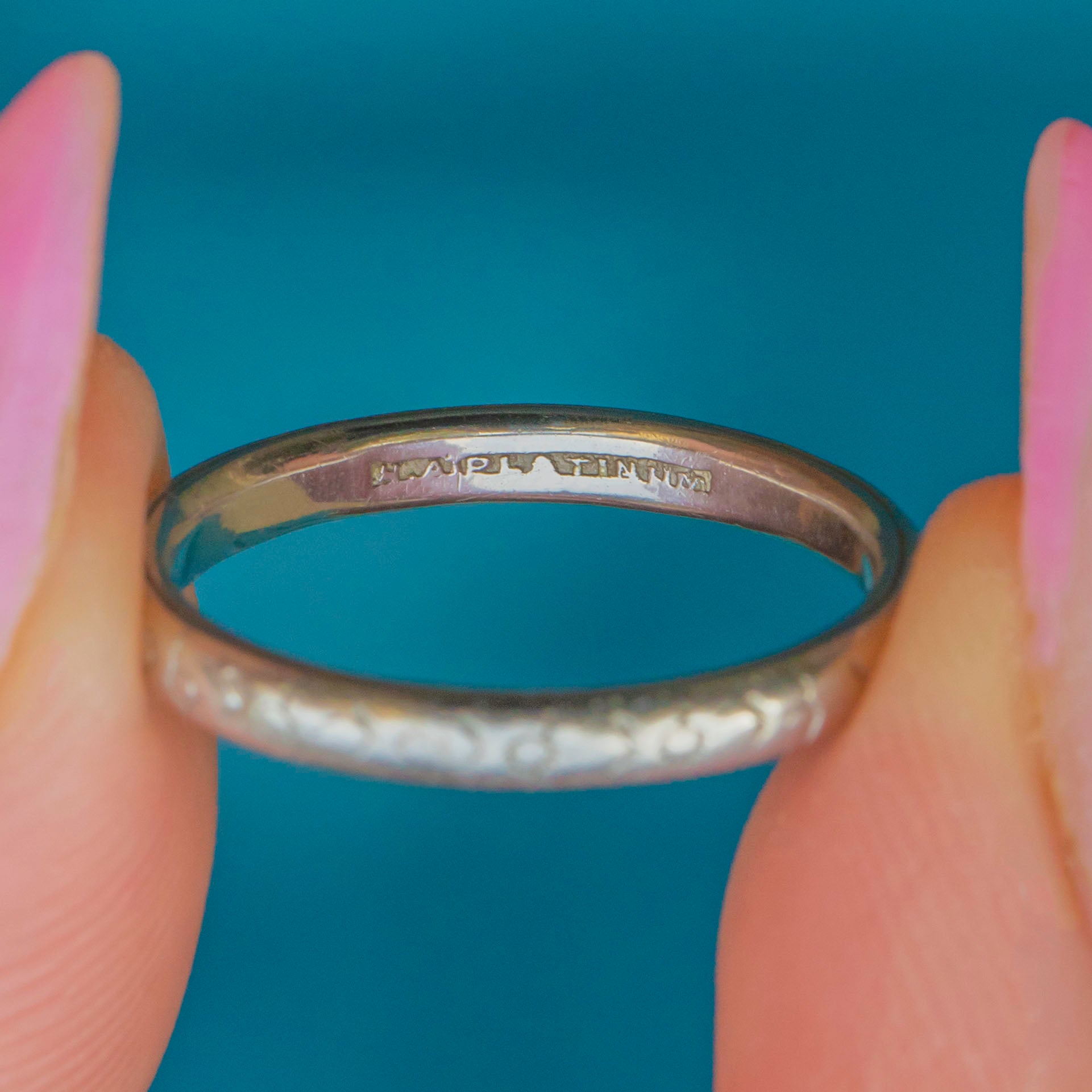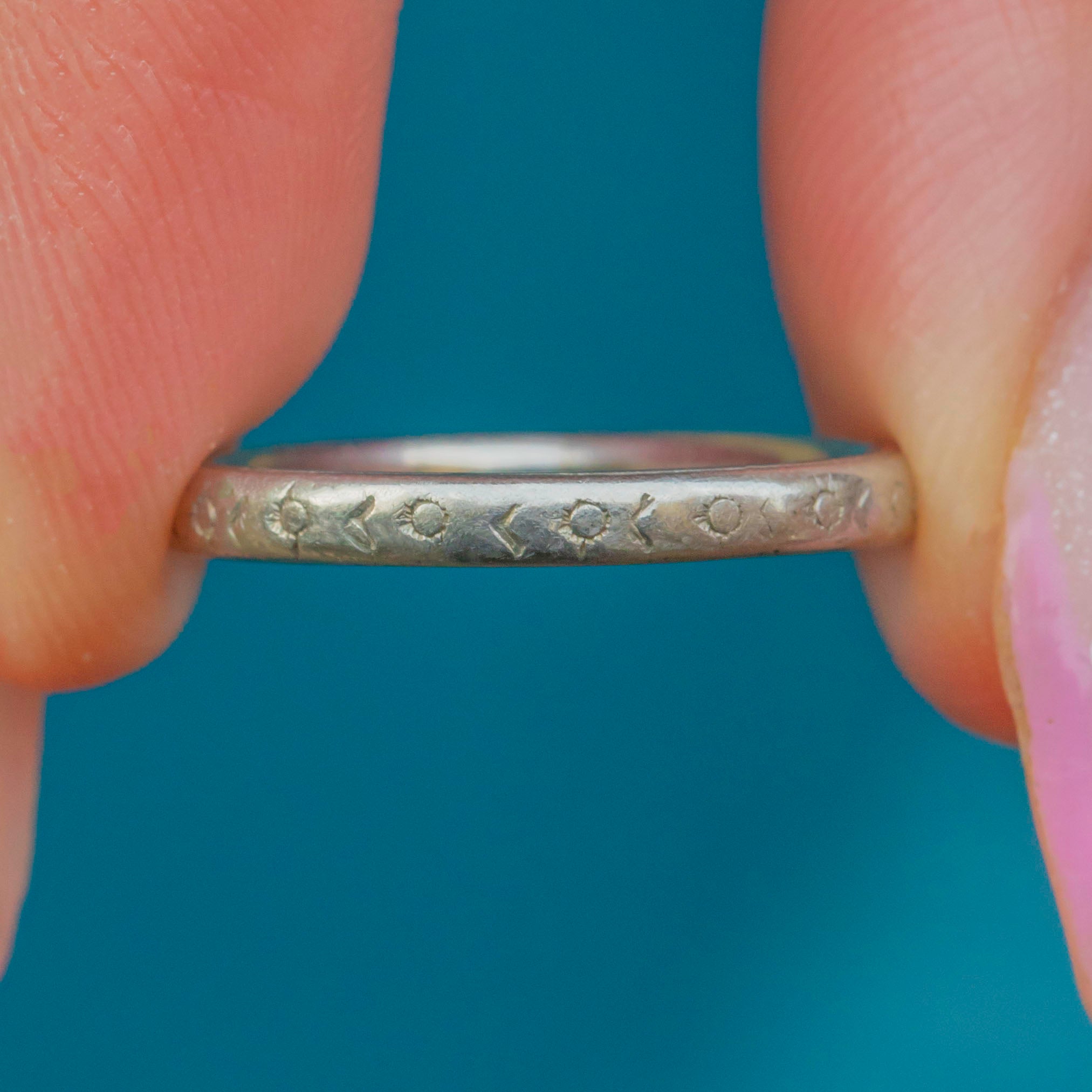 VERY GOOD. This splendid Art Deco Platinum engraved wedding band is offered in very good condition. Although her sweet engraved design has worn away slightly over time, it still retains a certain beauty! Her Platinum remains bright and glossy throughout, adding to the band's allure.
