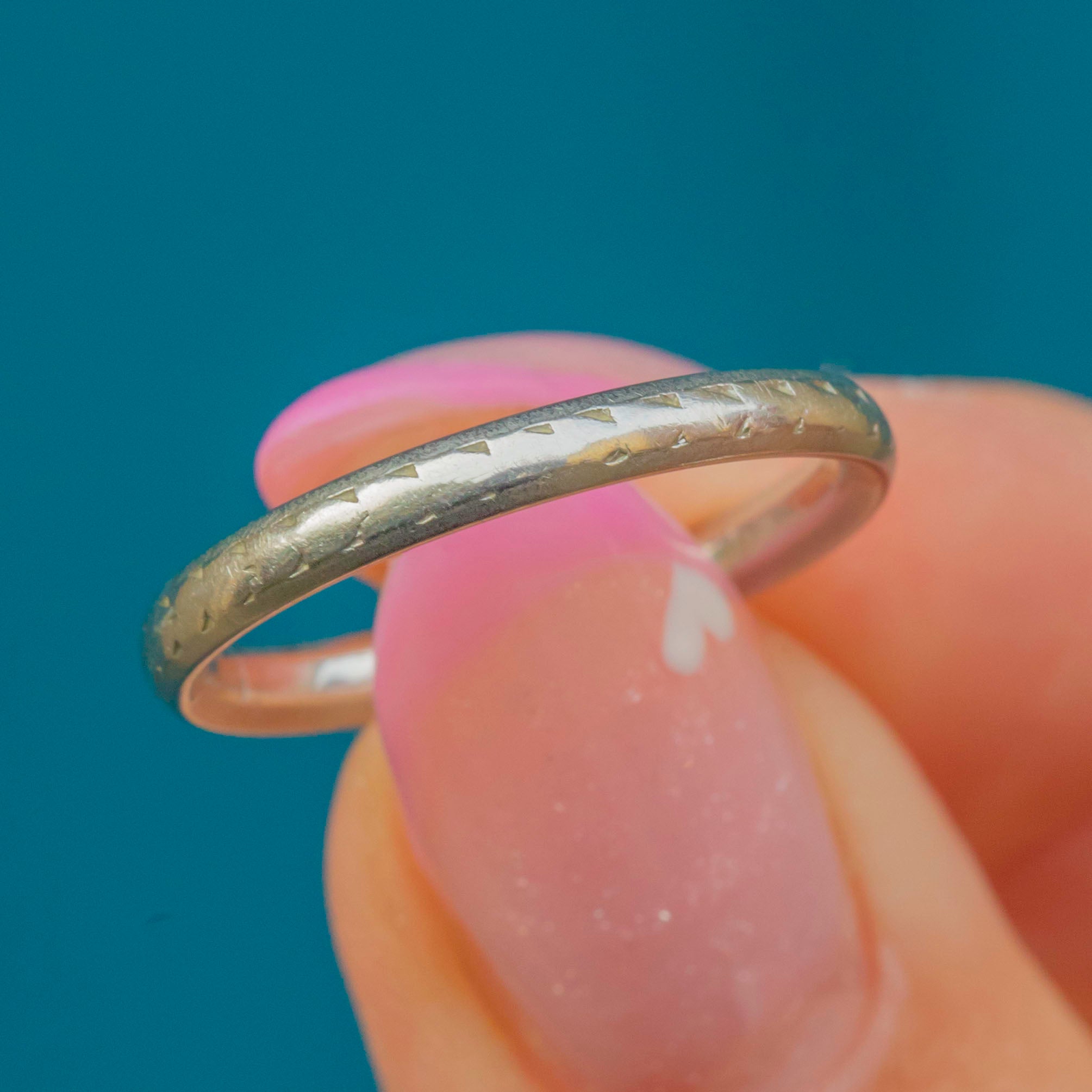 An exquisite wedding band, her bright Platinum boasts delicate geometric Art Deco engravings. Slender in design, she is the epitome of elegance.