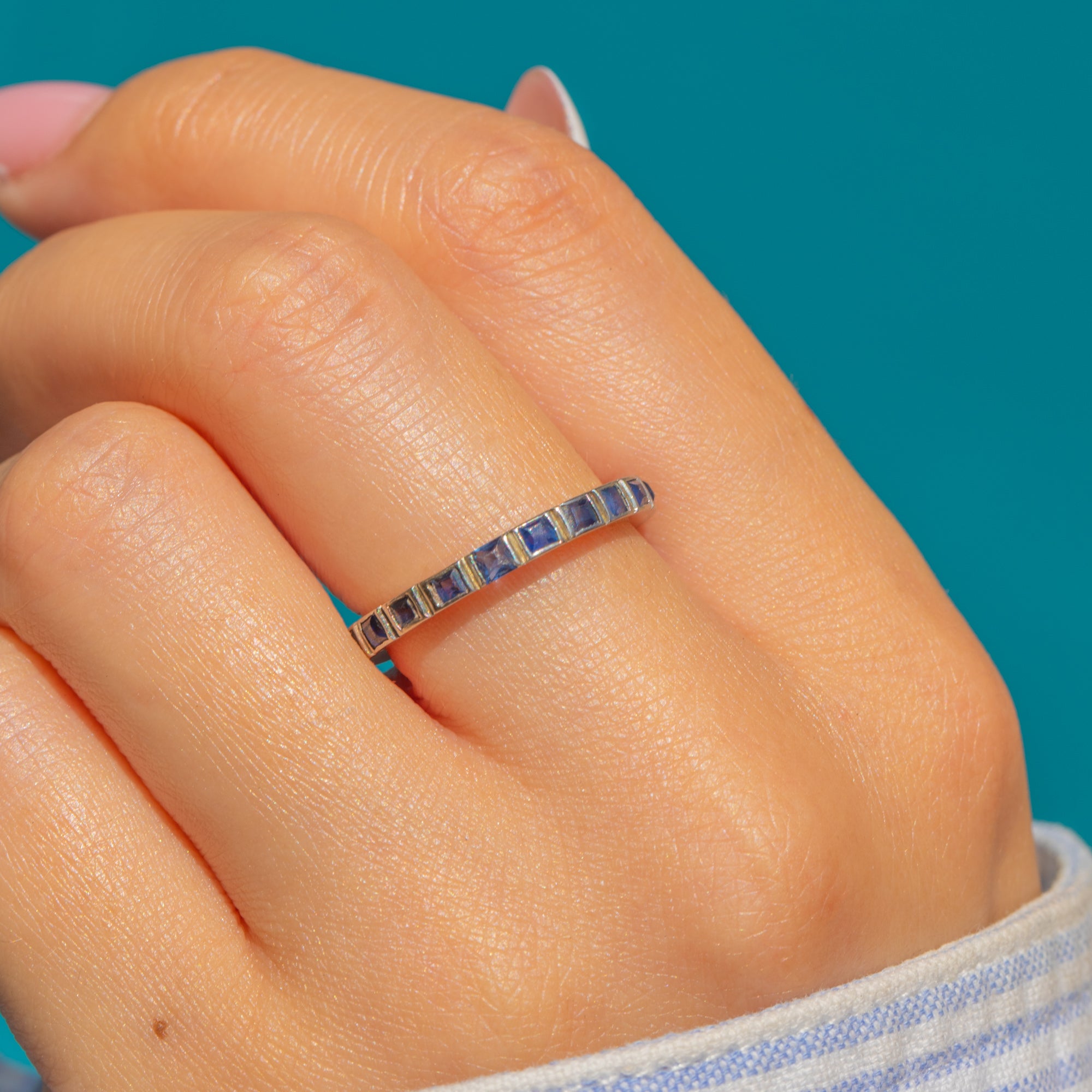 This elegant Art Deco eternity ring is set with a continuous row of twenty deep blue Sapphires, weighing approximately 0.70ct in total. Each square Sapphire creates a beautifully even, uninterrupted band of colour, and the gemstones are mounted in a combination of Platinum and 18ct Yellow Gold, with its sleek geometric pattern characteristic of the Art Deco era.