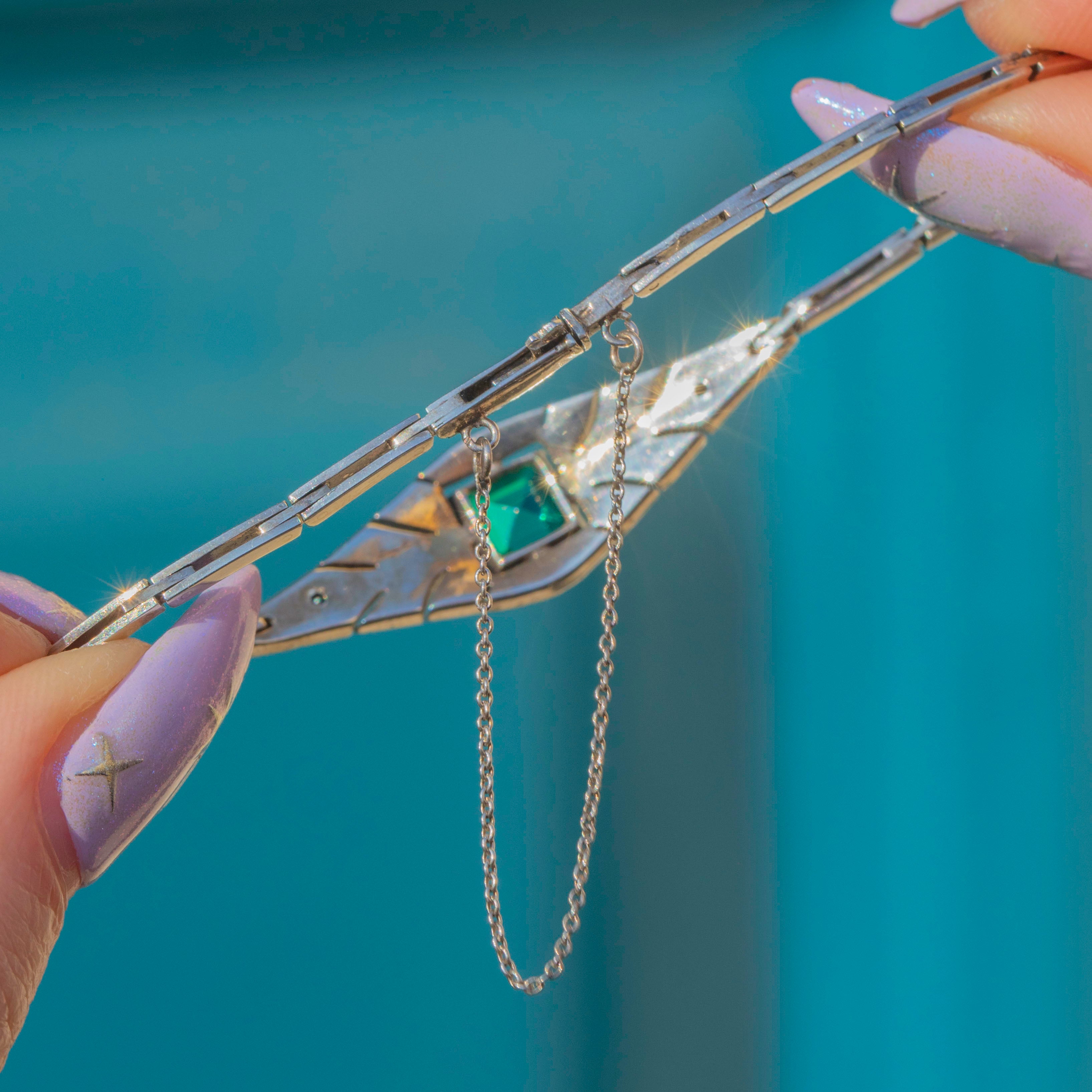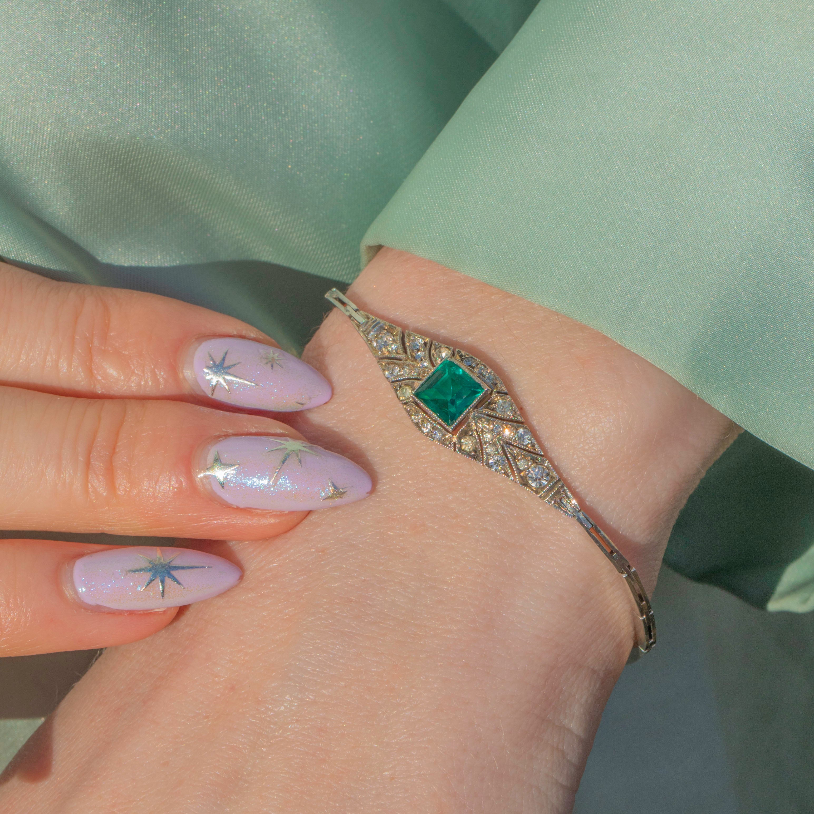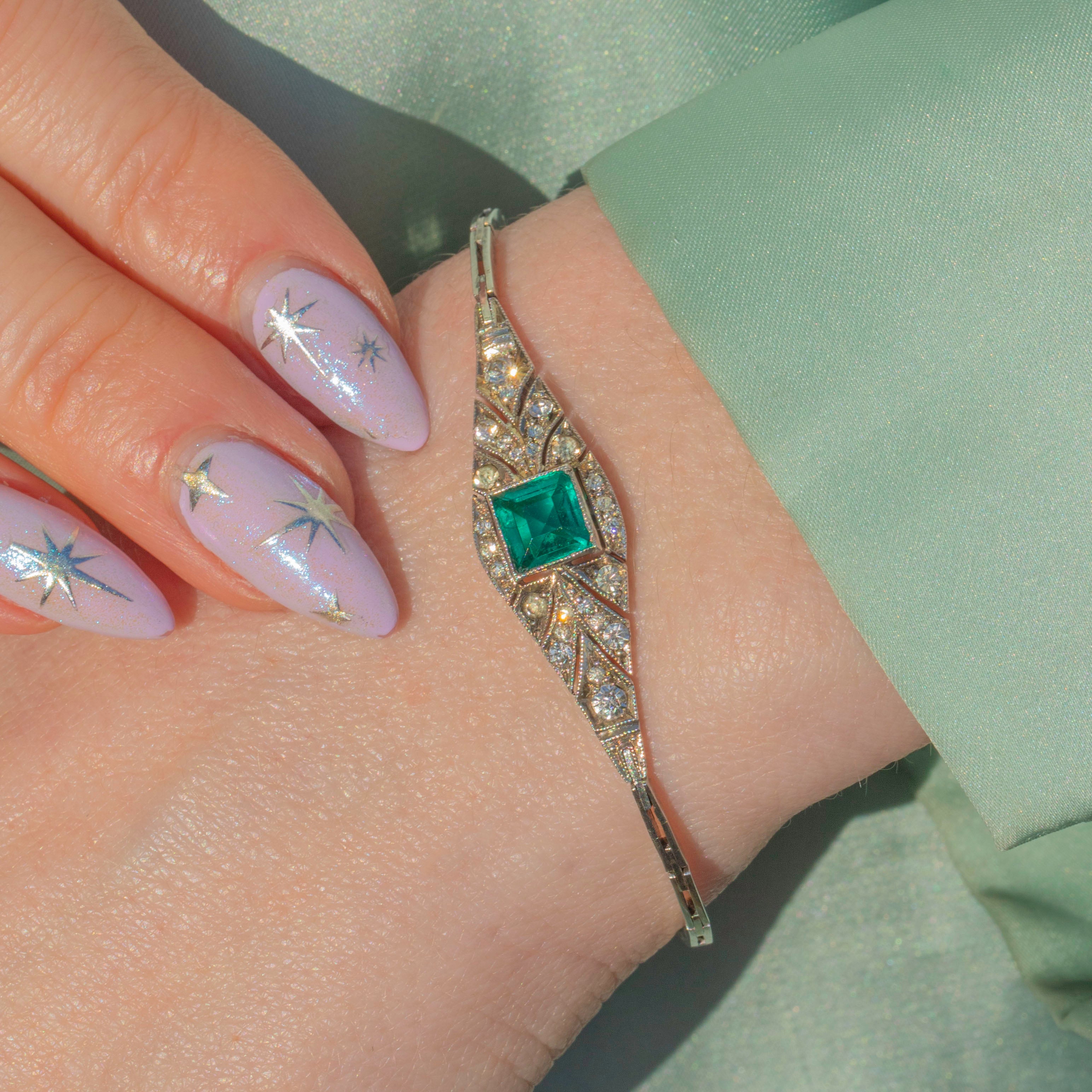 Crafted from lustrous Silver and set with a vibrant Green Paste adorned by an array of twinkling white Paste, this geometric bracelet exudes glamour.