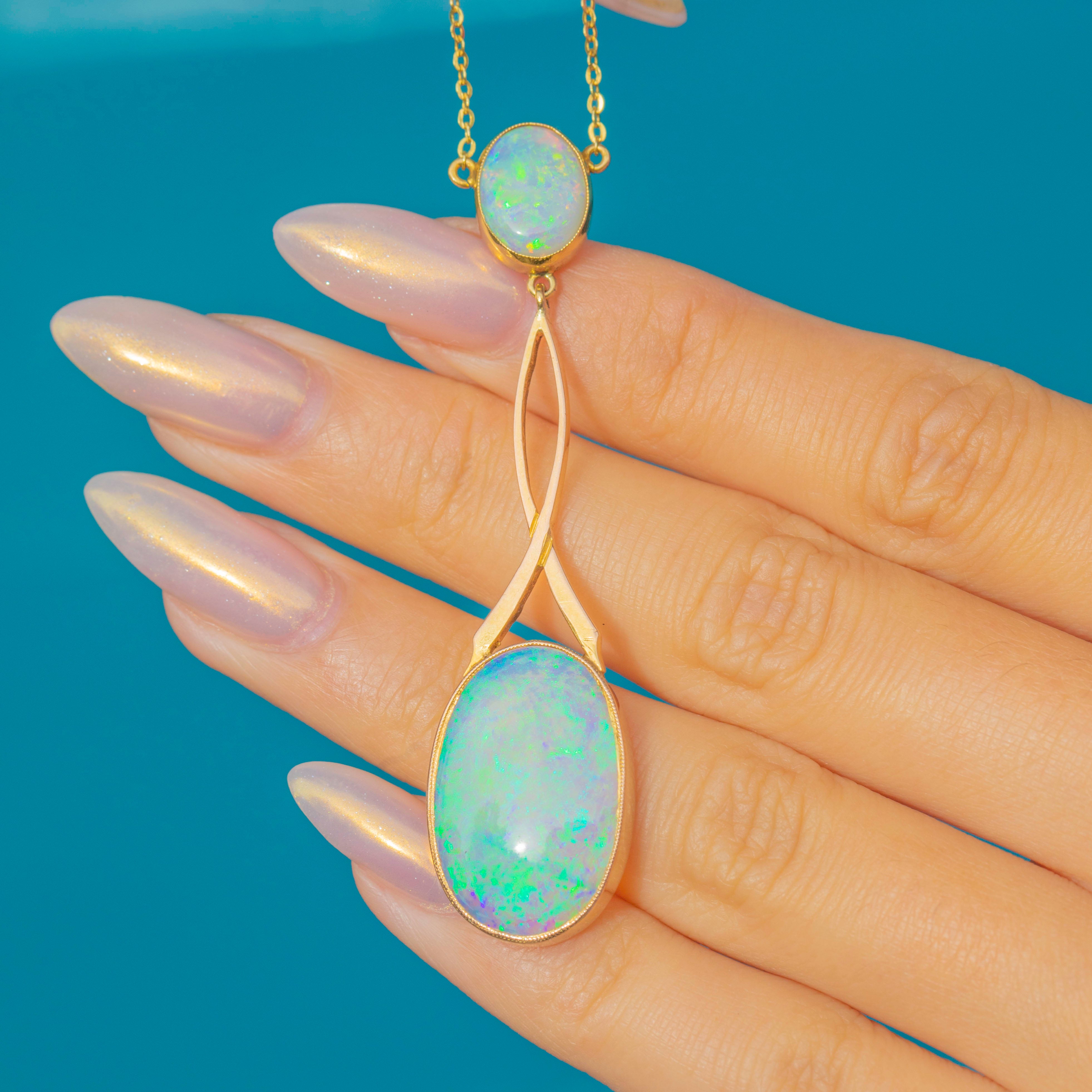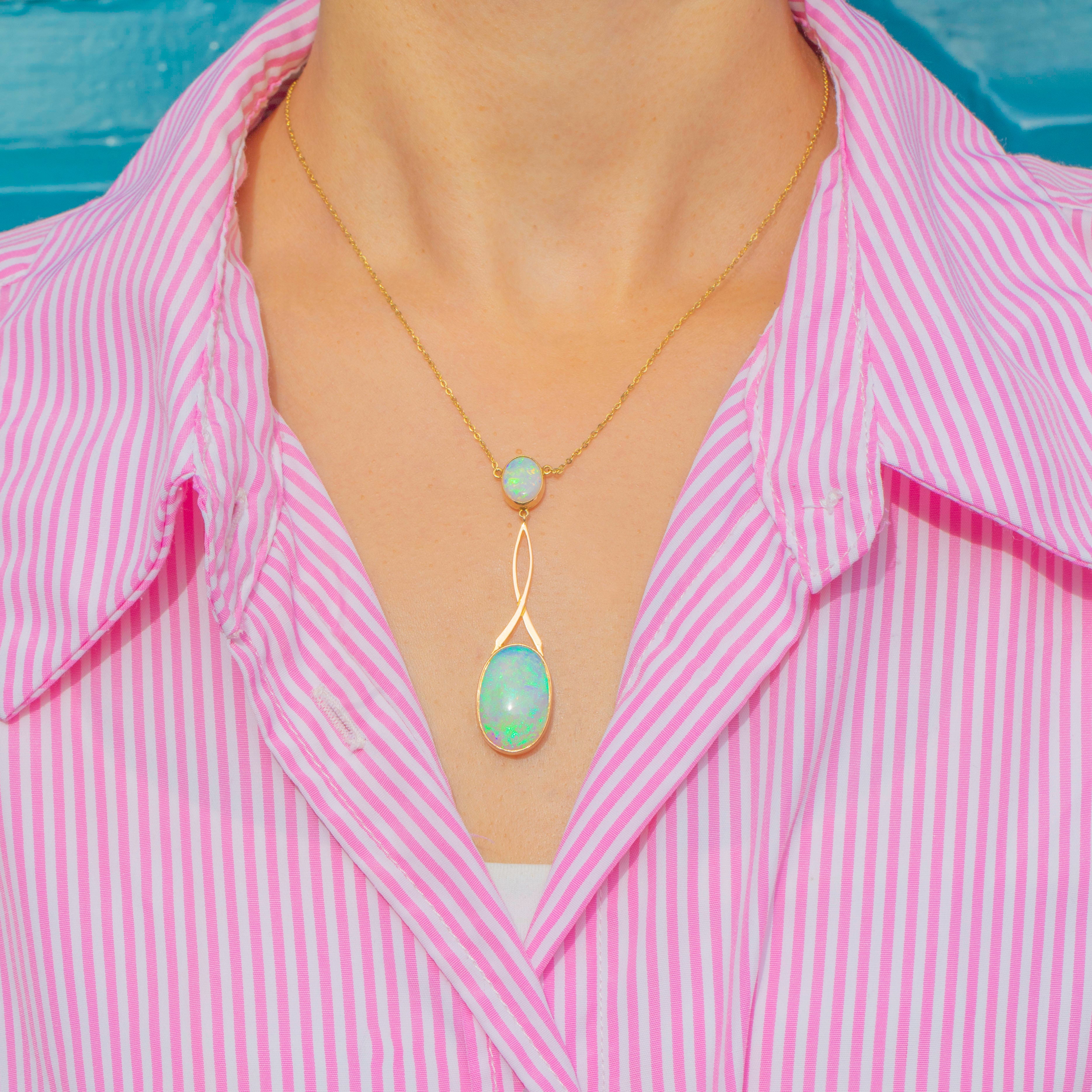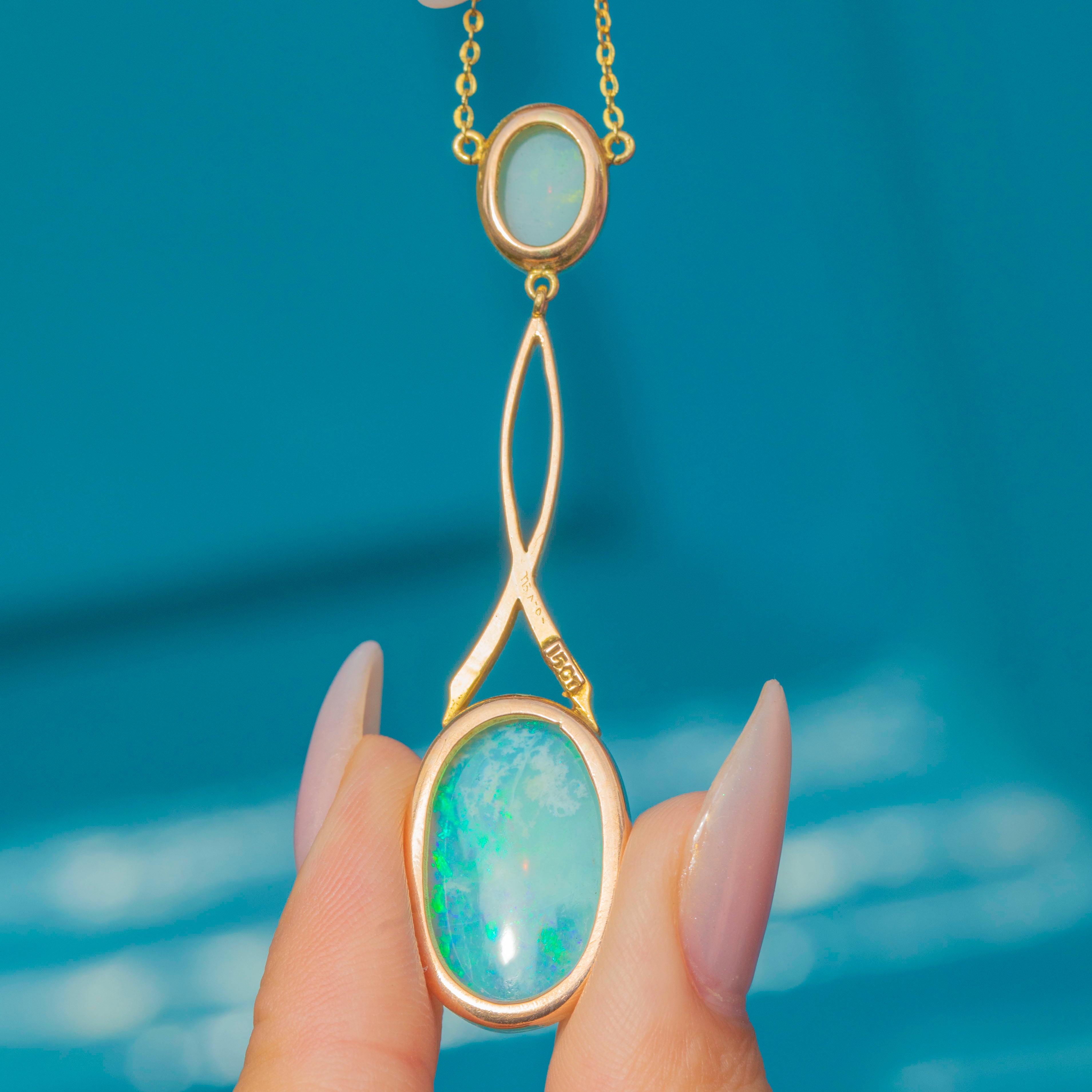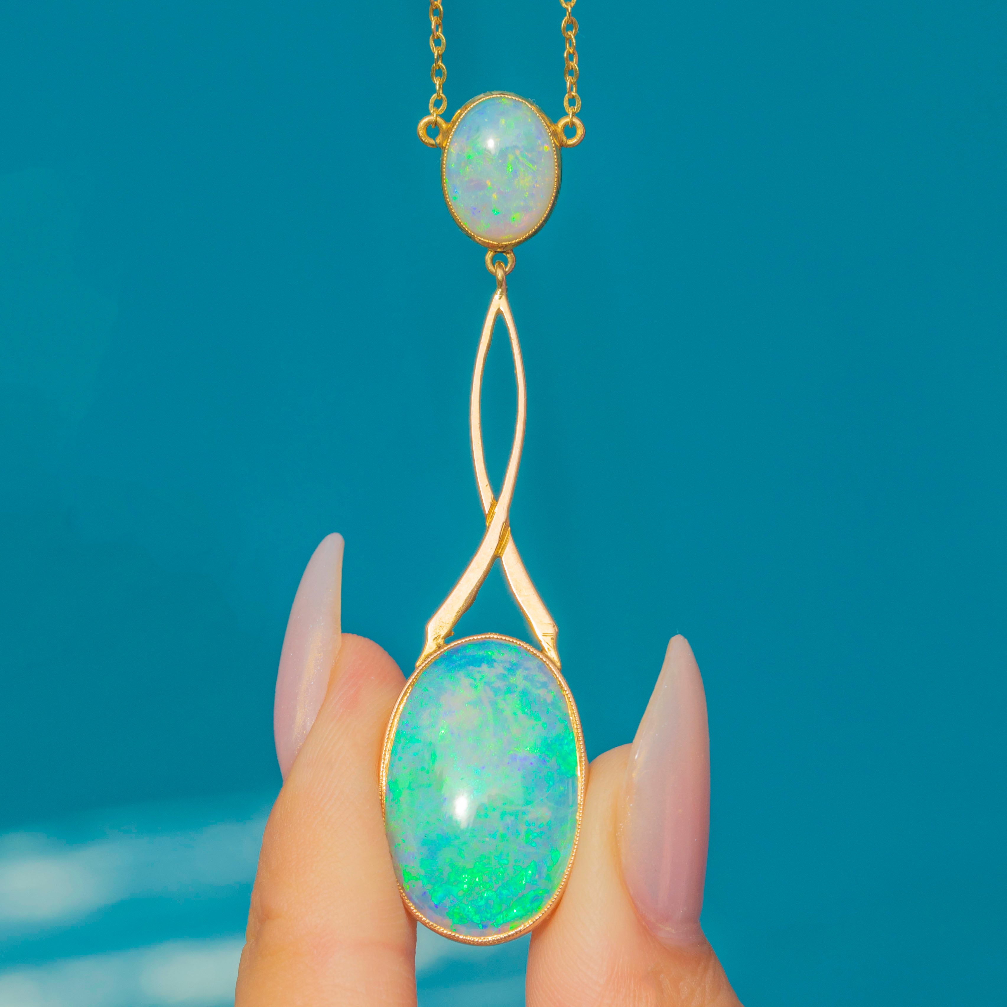 An exquisite Art Nouveau necklace, circa 1890–1910, featuring a 15ct Gold drop inspired by nature with an elegant twist design. Two solid, natural Opals are set within chubby bezels to keep them secure..