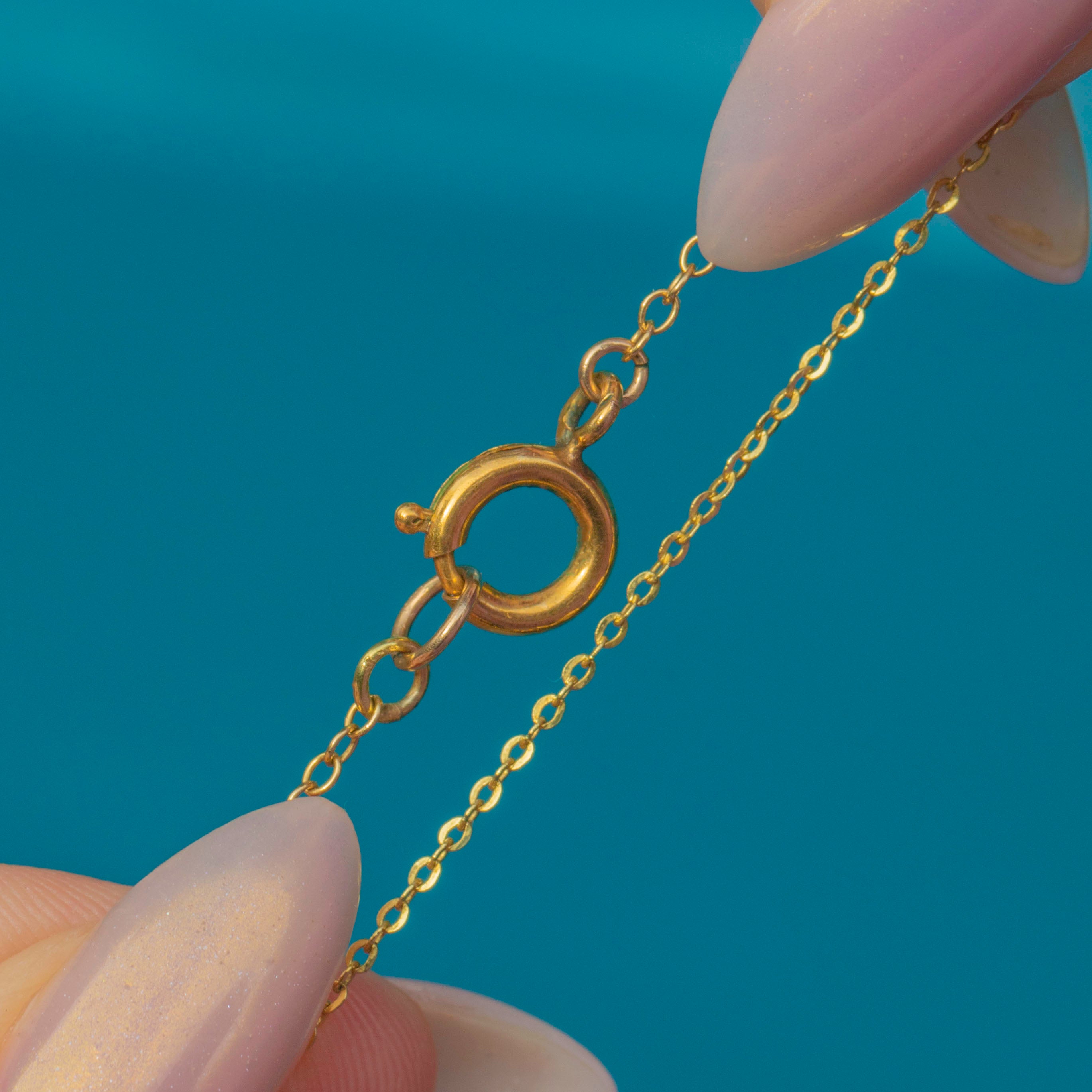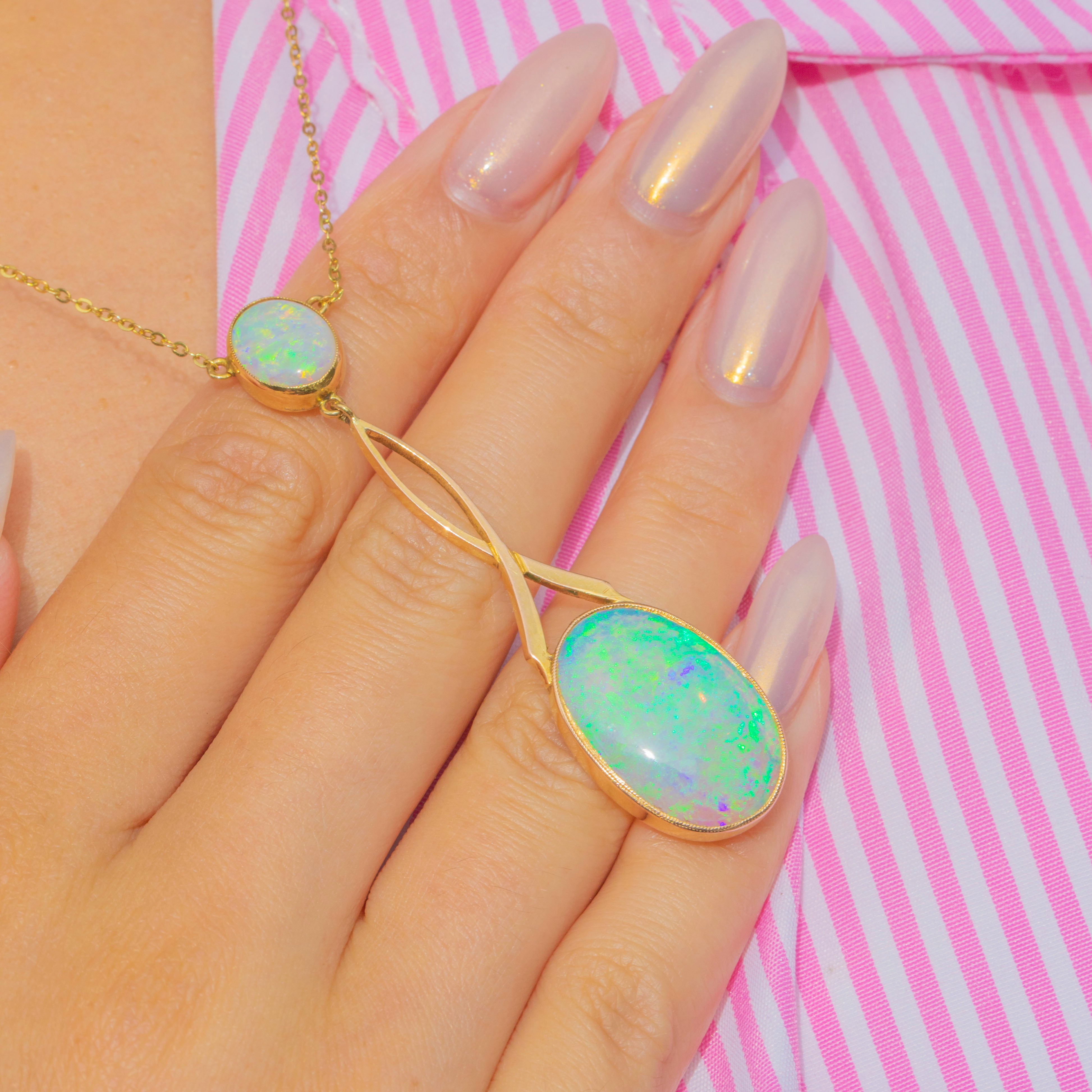 The Opals display vivid, lively colours, shimmering greens, blues, and neon flashes, beautifully highlighted by the high-polish Gold and delicate millegrain bezel detail. A later 9ct Gold chain with bolt-ring clasp completes this 18" necklace, allowing the drop to sit gracefully.