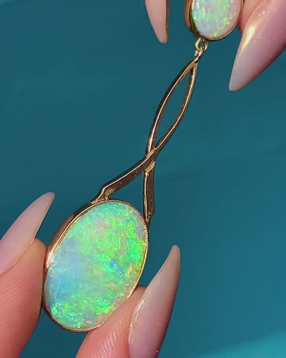 VERY GOOD – EXCELLENT: The Opals are in very fine antique condition, with no chips, cracks, or crazing, well-set and secure in their original millegrain bezels. The 15ct Gold drop is highly polished, catching the eye beautifully. The later 9ct Gold chain is in excellent working order and can be swapped or adjusted if desired.