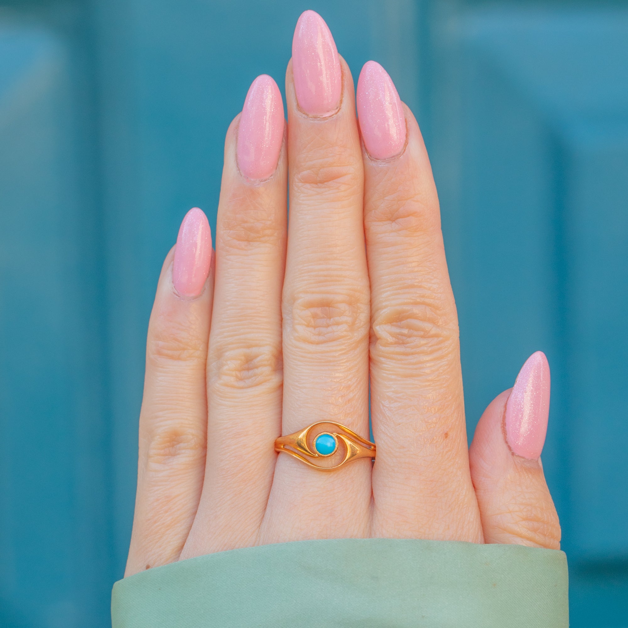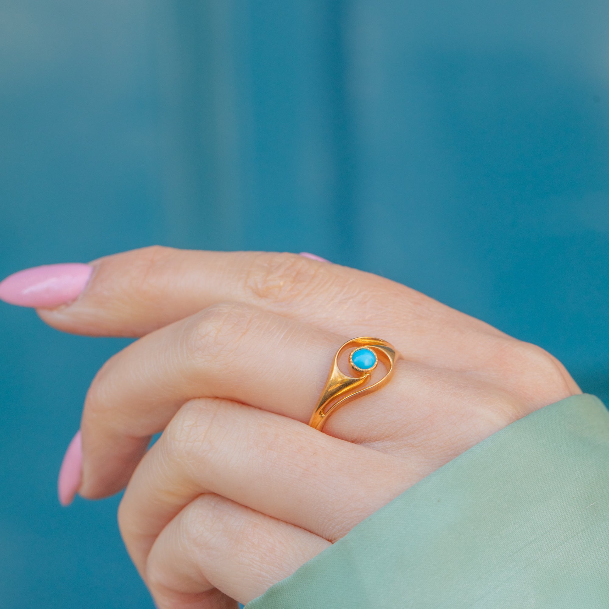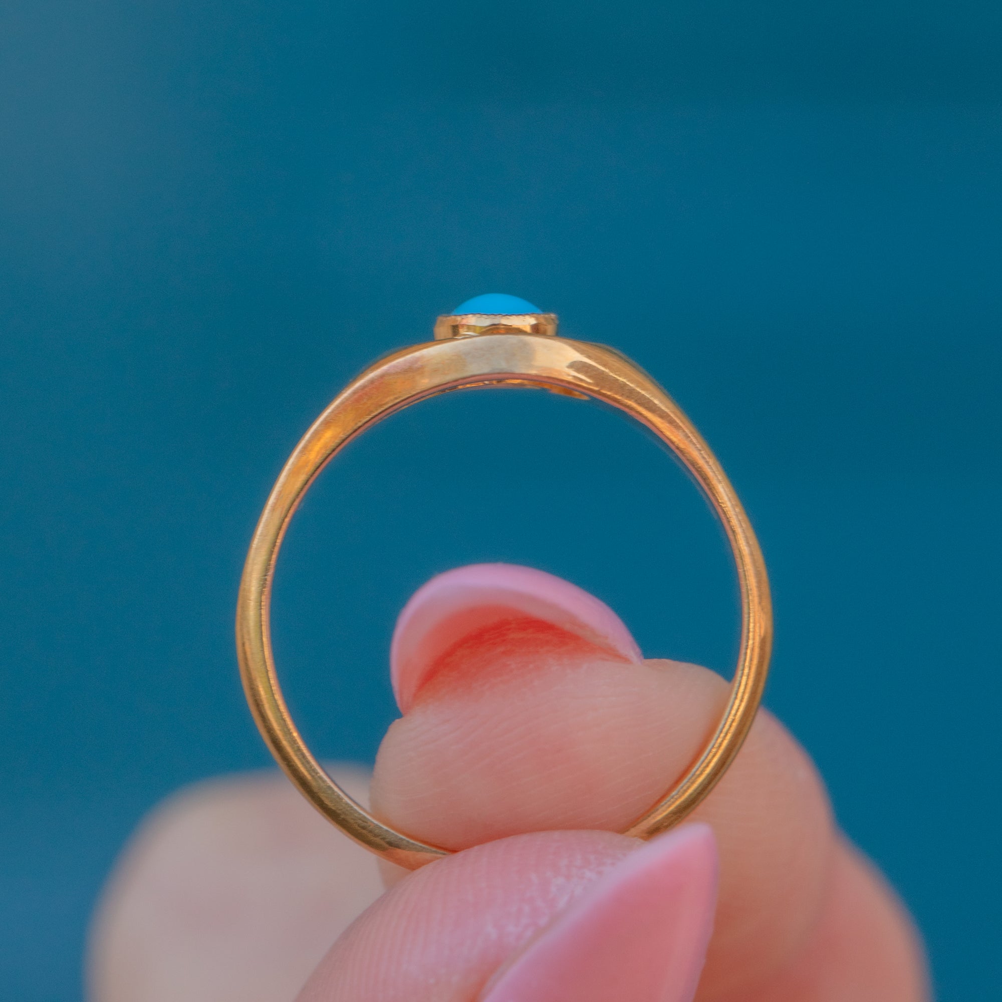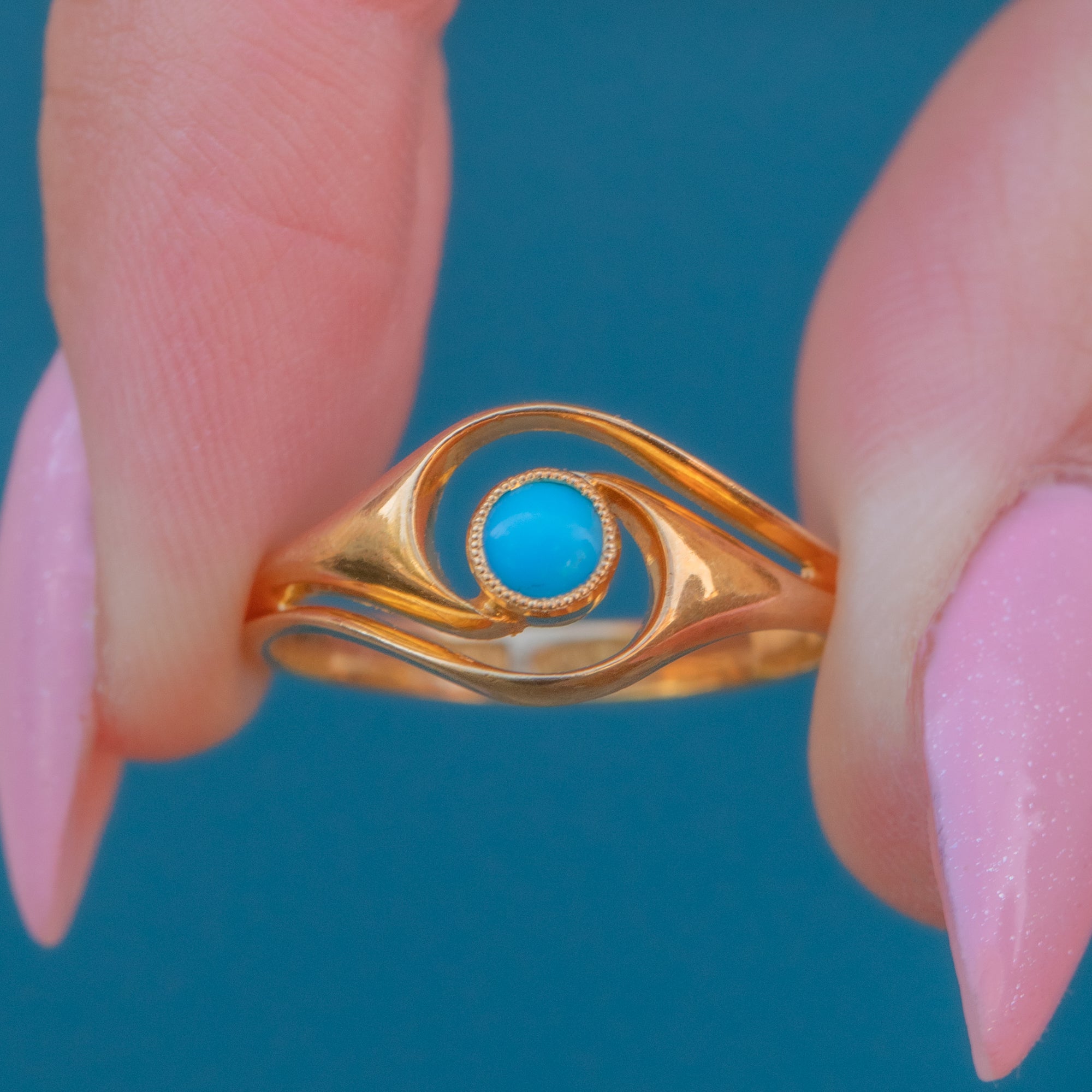 The Turquoise cabochon takes centre stage, its vibrant sky-blue hue perfectly complemented by the richly saturated Gold. The symmetrical twist design is endlessly pleasing to look at and provides wonderful finger coverage.