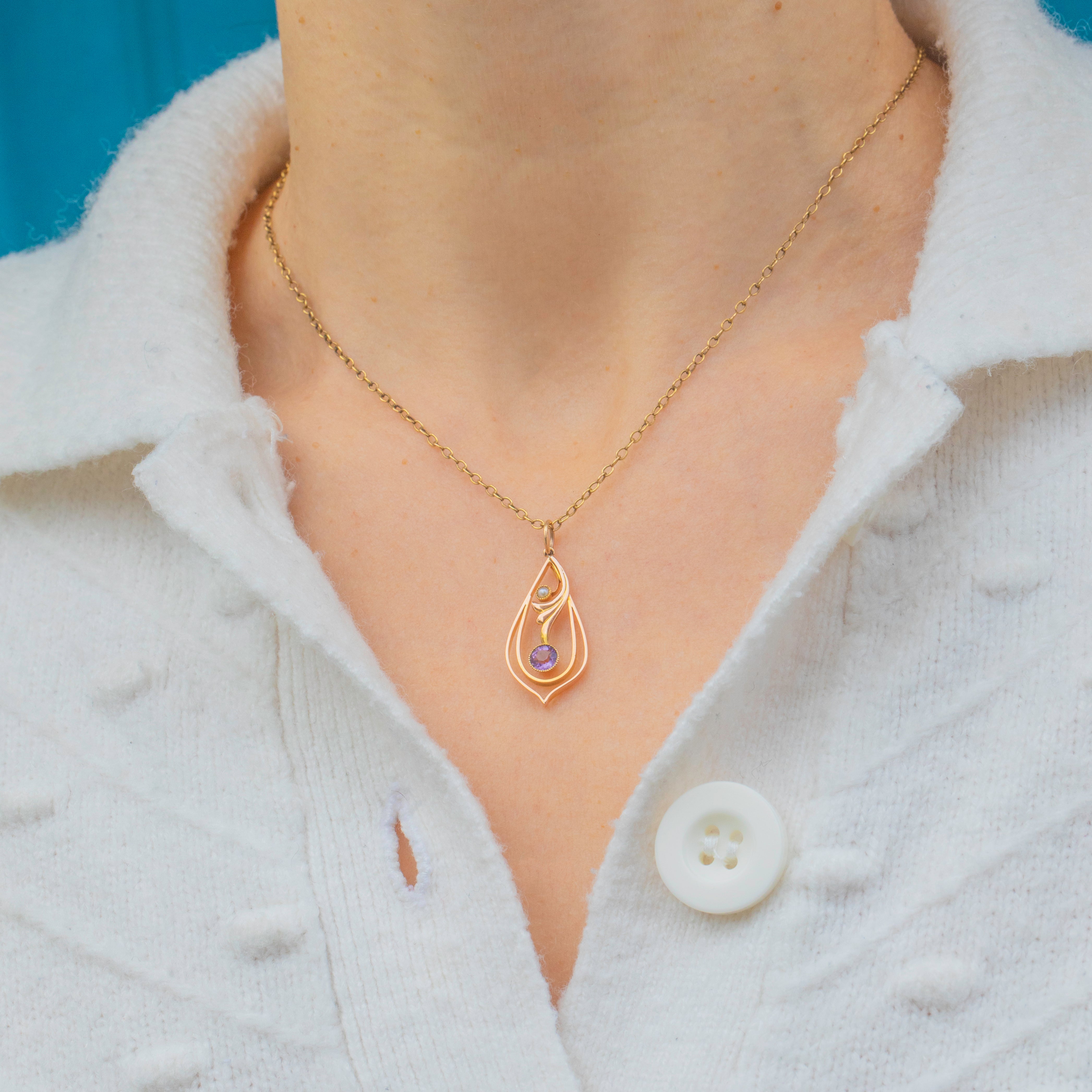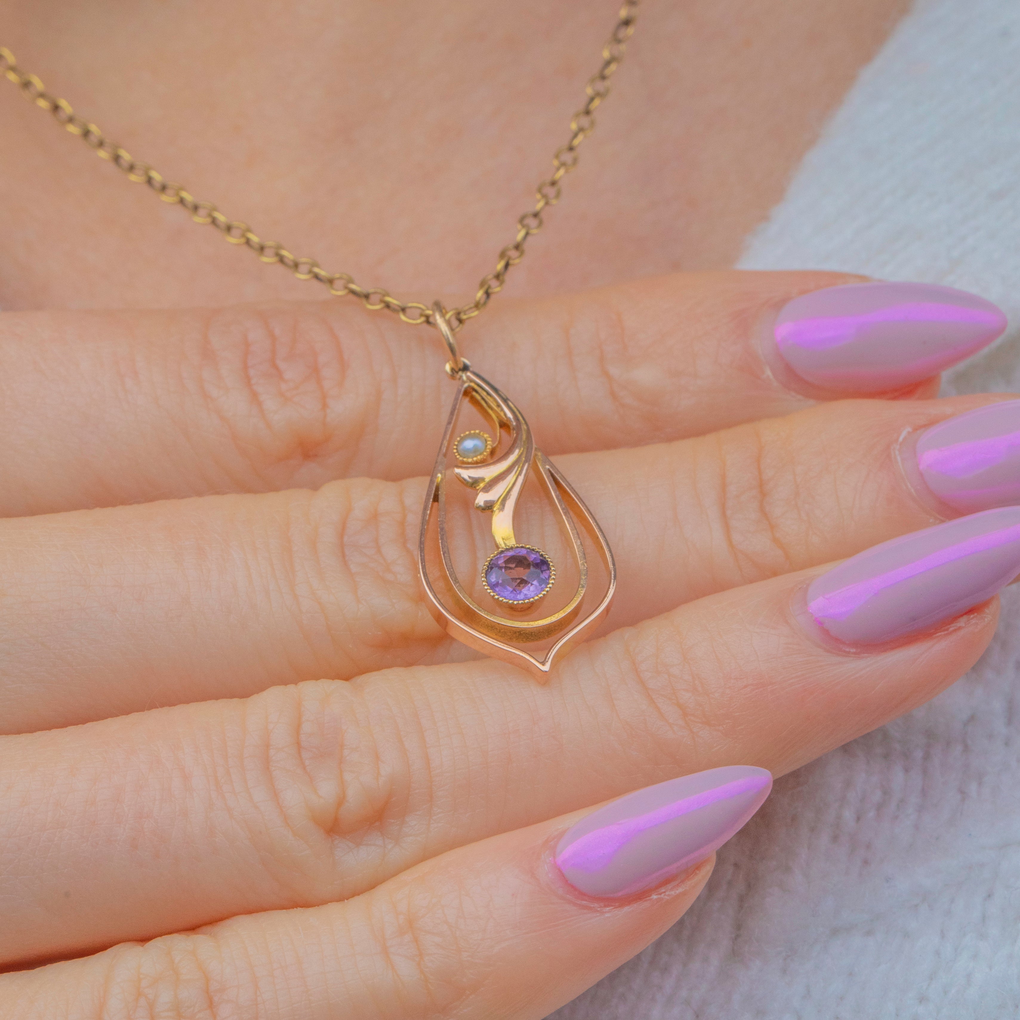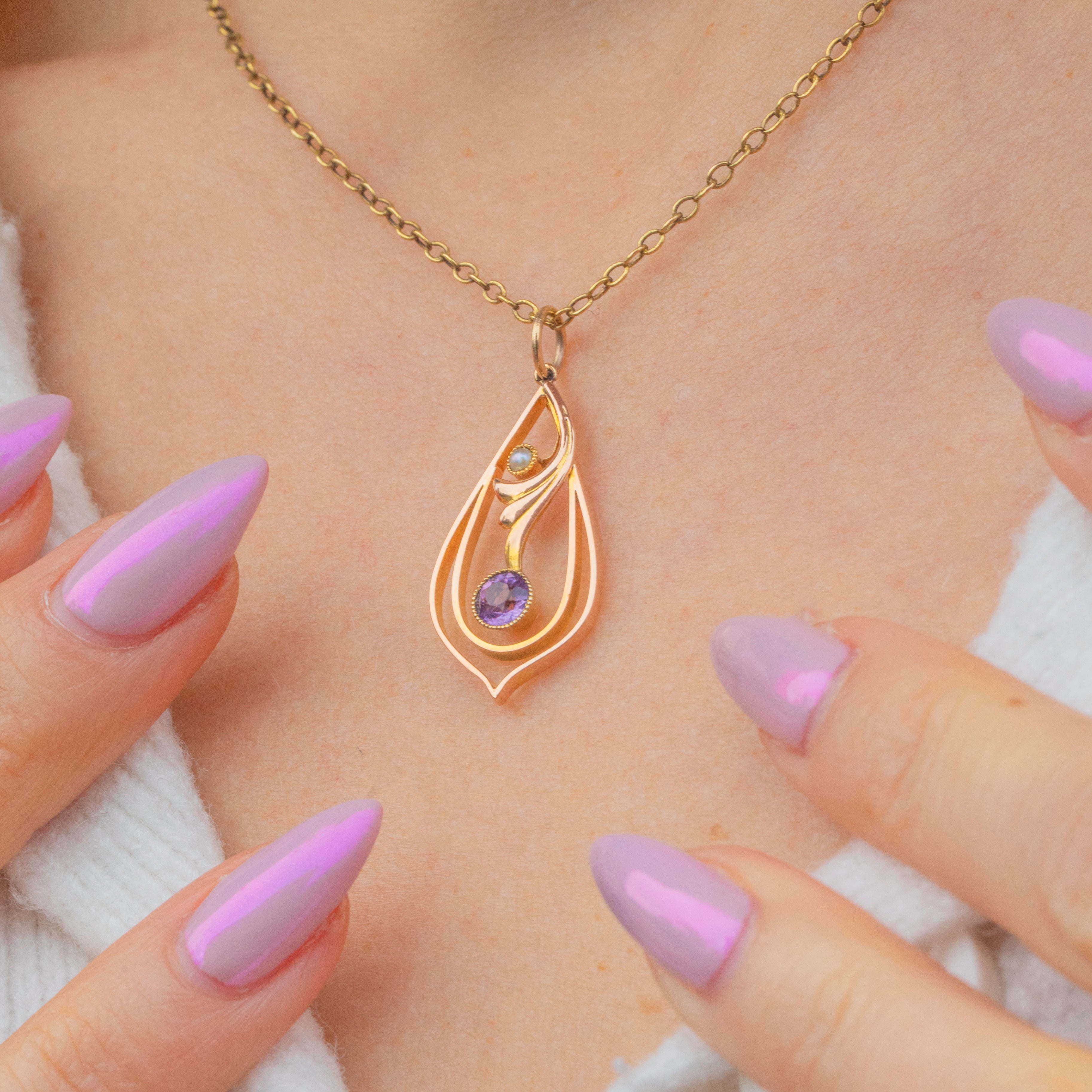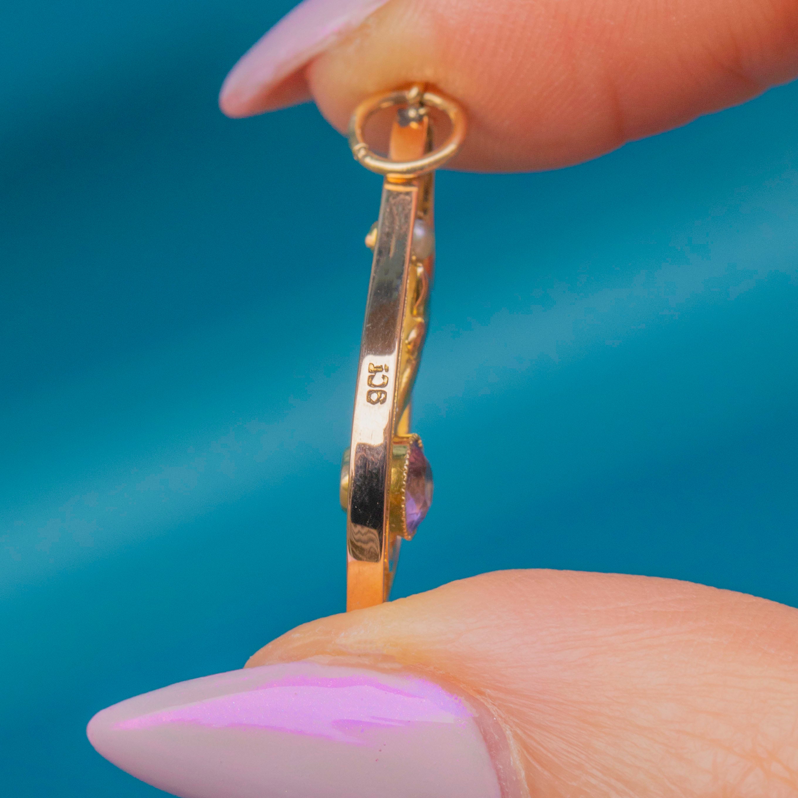 A beautiful Art Nouveau pendant crafted in 9ct Gold, set with a soft violet Amethyst and a lustrous Seed Pearl. The flowing, organic lines and delicate balance of this design perfectly embody the graceful naturalism of the Art Nouveau era.