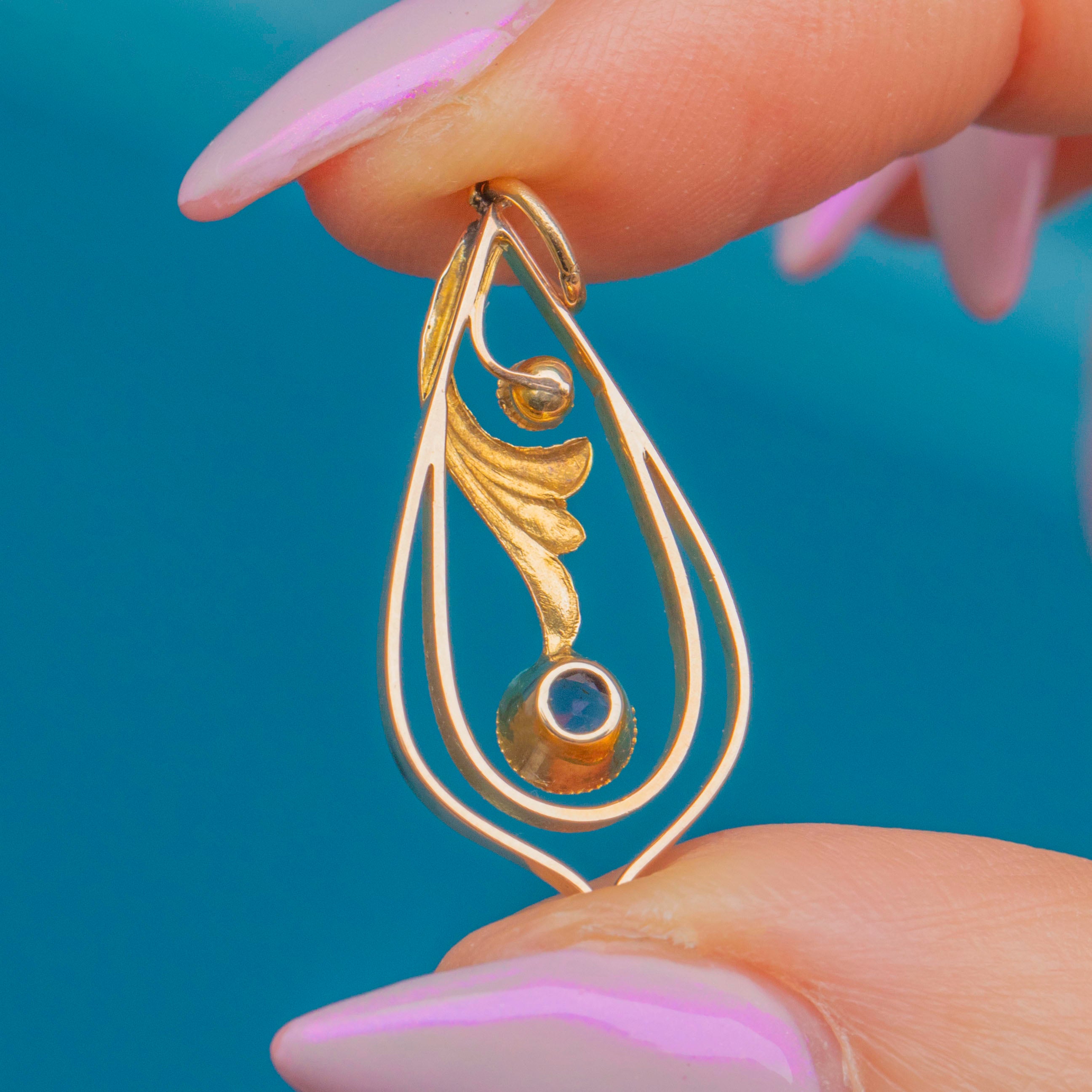 The rich Gold frame curves elegantly around the gemstones, creating a subtle yet striking piece that feels both romantic and timeless. With its fine detail and gentle femininity, this antique pendant is a wonderful example of early 20th-century craftsmanship.