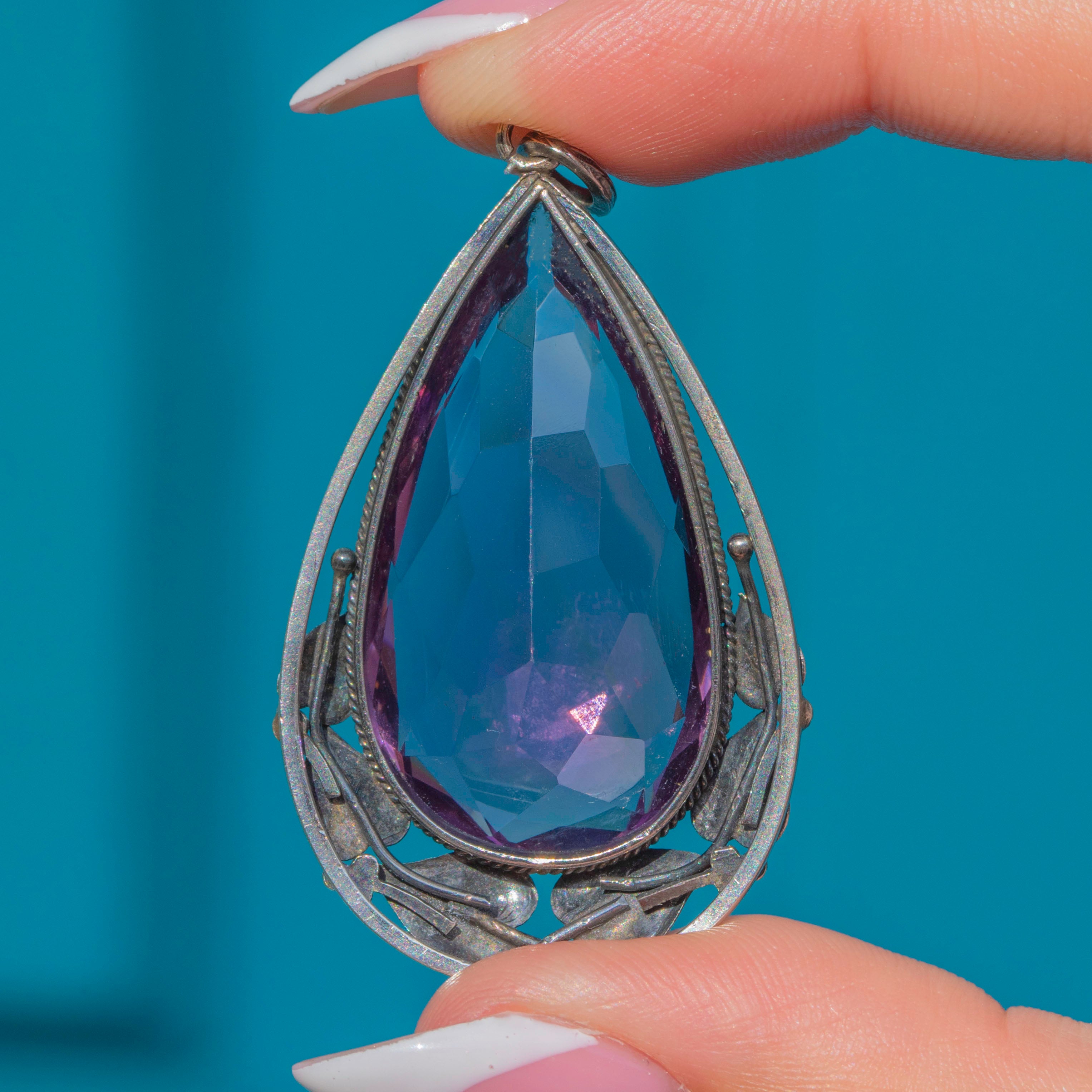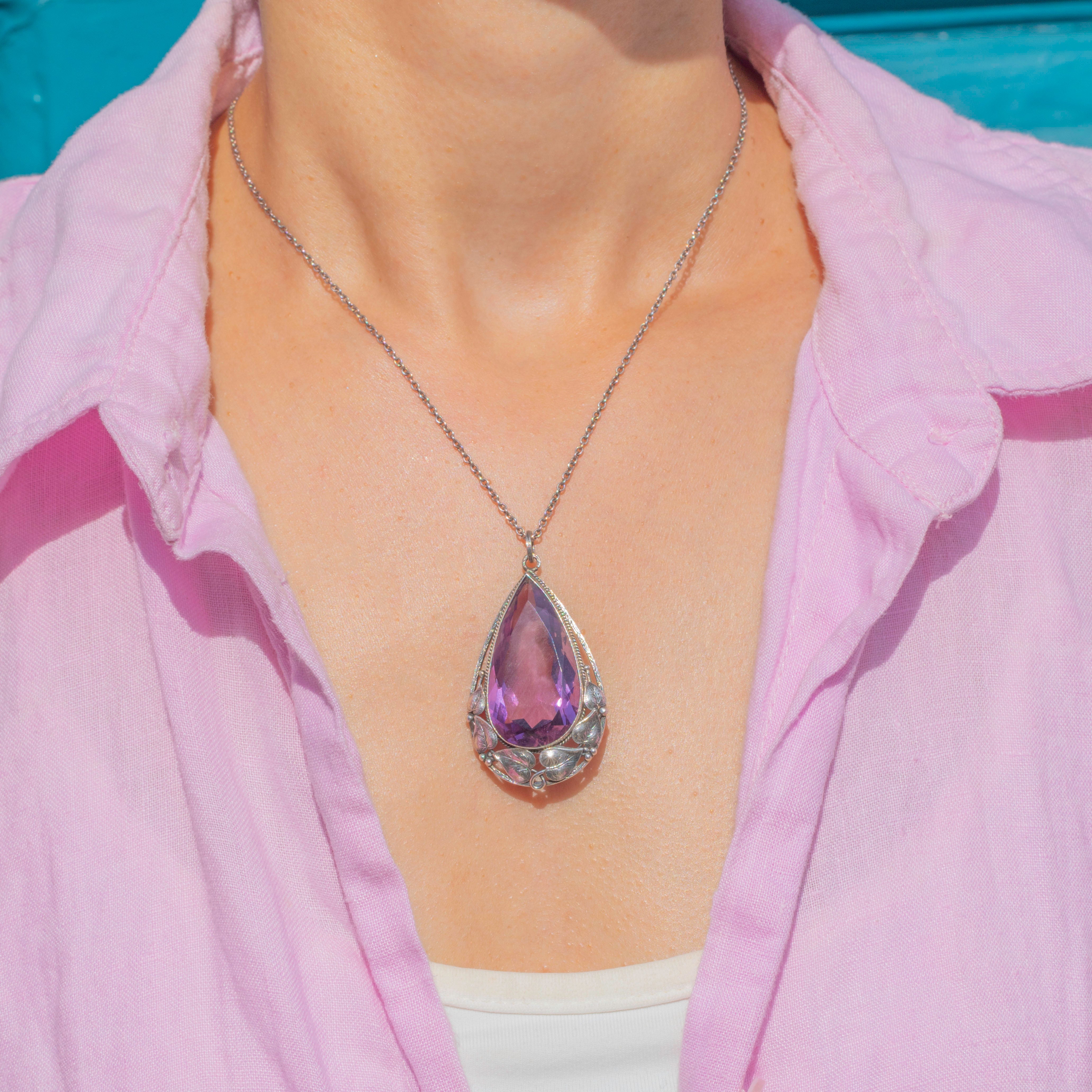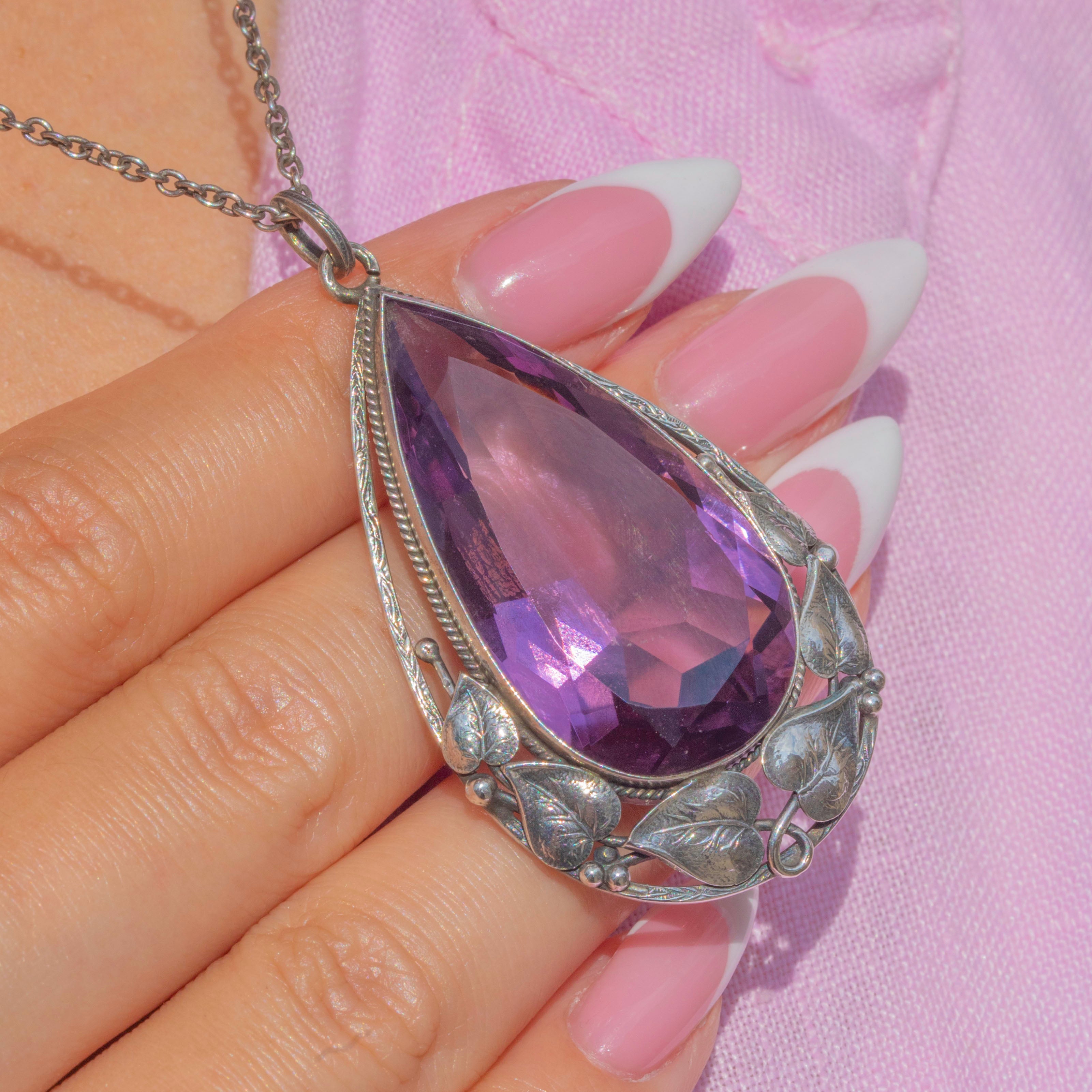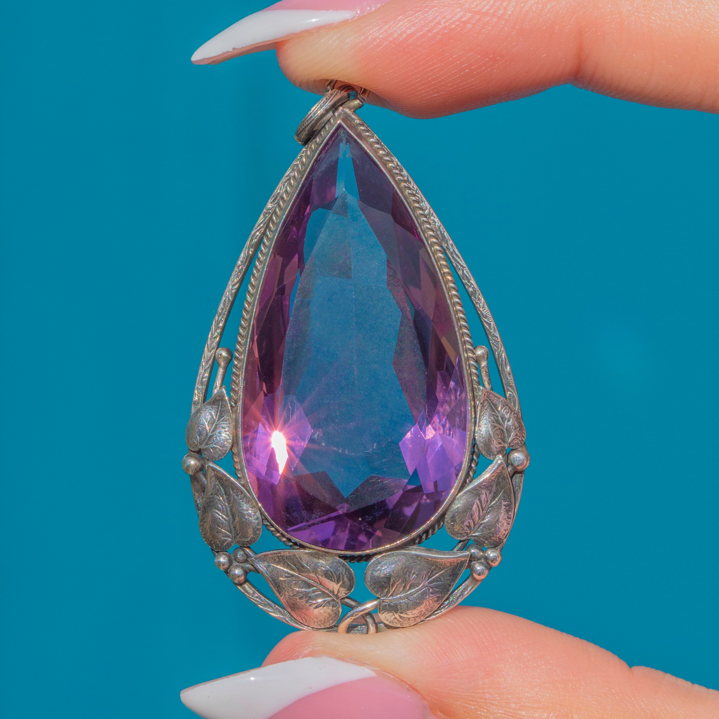 This striking antique pendant flaunts a large pear-cut Amethyst, boasting 22.50ct and radiating resplendent lavender and lilac hues from its crisp facets. The gemstone is set in lustrous Silver settings, adorned with foliate details which provide a gorgeous texture and depth.