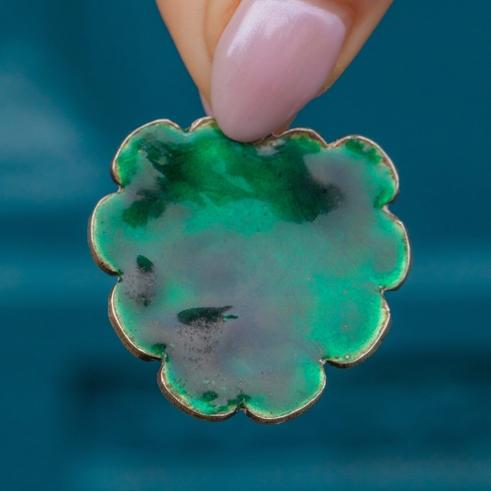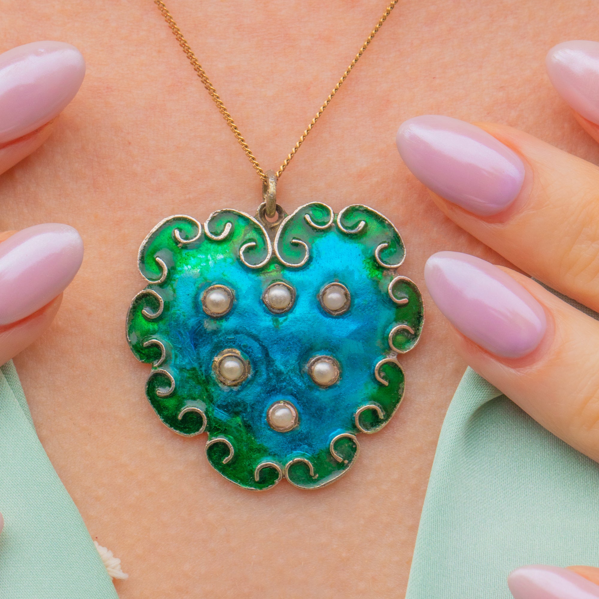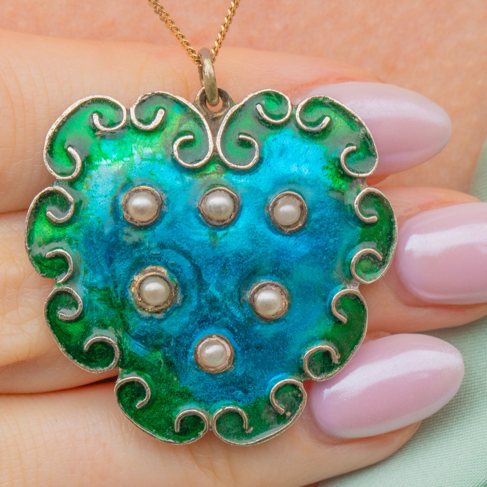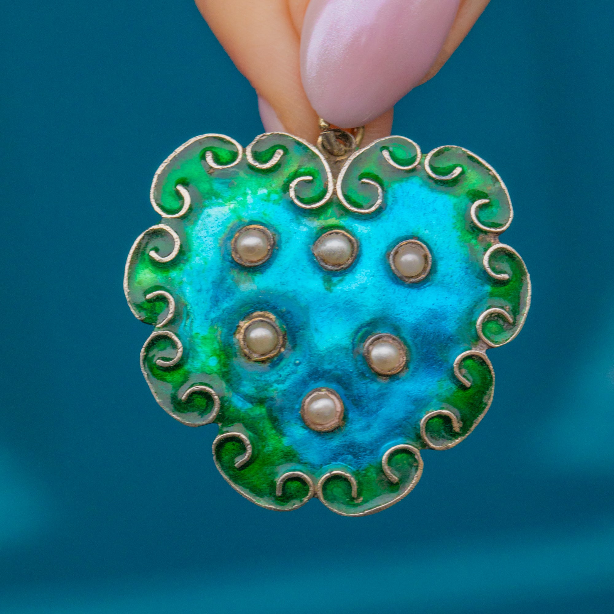 MATERIALS: Tests as Sterling Silver throughout, blue & green Enamel, Pearl.