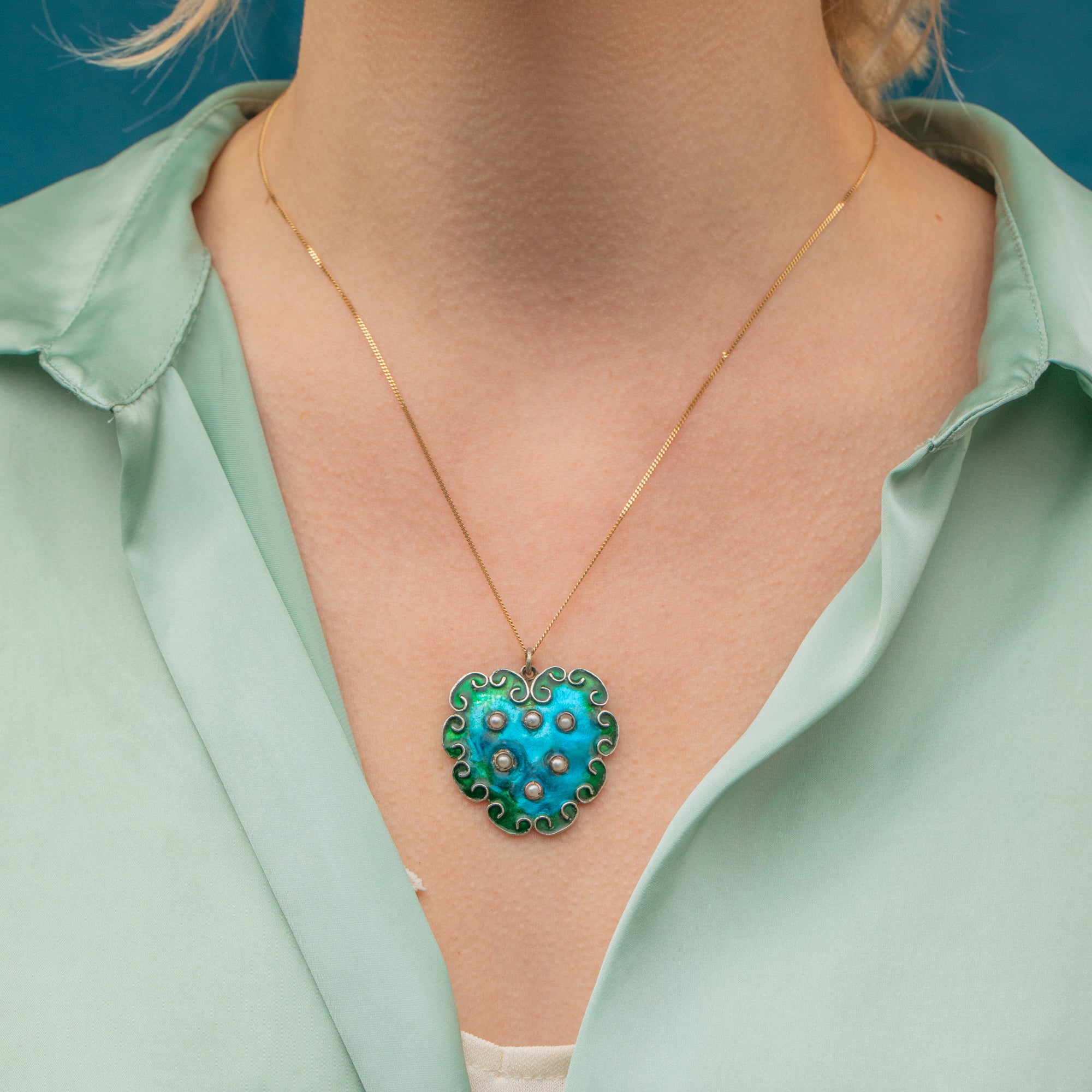 This Arts & Crafts Silver Enamel Pearl heart pendant is fit for a woodland pixie! Crafted in fine Silver, the heart shaped design features rich blue and green Enamel evoking the serene hues of a woodland glade. Accented with swirling Silver curves, reminiscent of celtic patterns, she offers an aura of timeless grace.