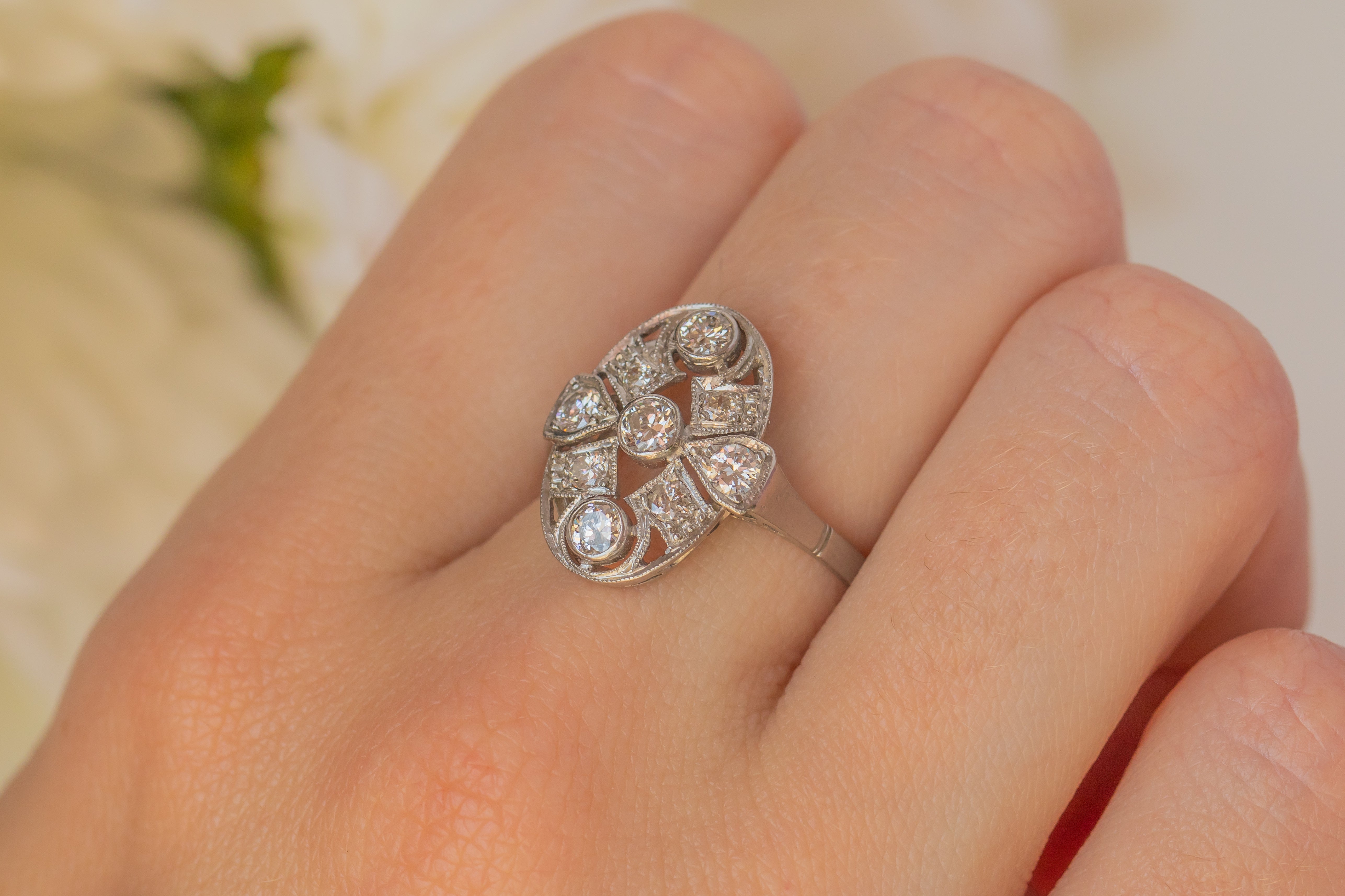A disco ball for your finger - this Art Deco Era Platinum Oval Diamond Cluster Ring proves that all that glitters is not gold. Solid Platinum with 9 stunning stones full of fire, this cut-out design looks delicate but has hardly aged in over 100 years.