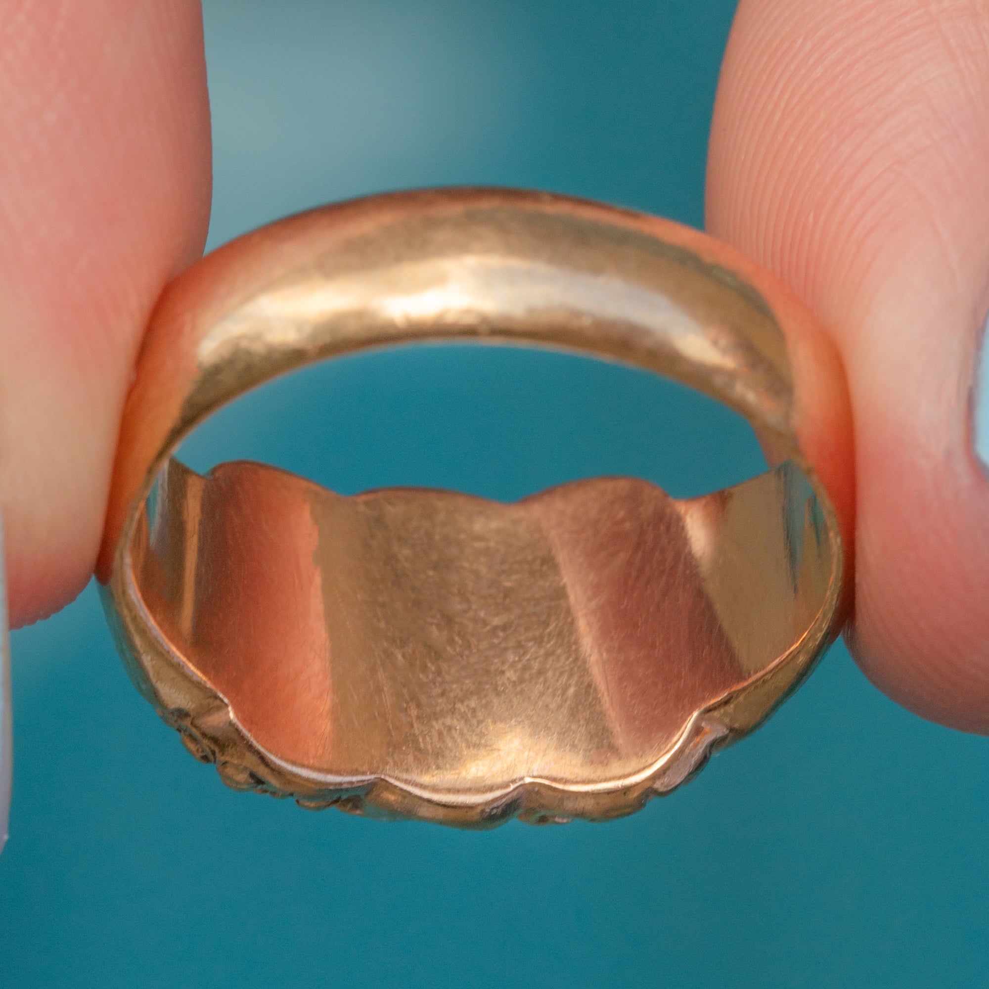 EXCELLENT. The Gold is bright with a gorgeous rosy hue, and the details have all remained crisp. The chunky ring band feels comfortable to wear and comes complete with a full set of antique hallmarks, allowing us to accurately date it to 1914!