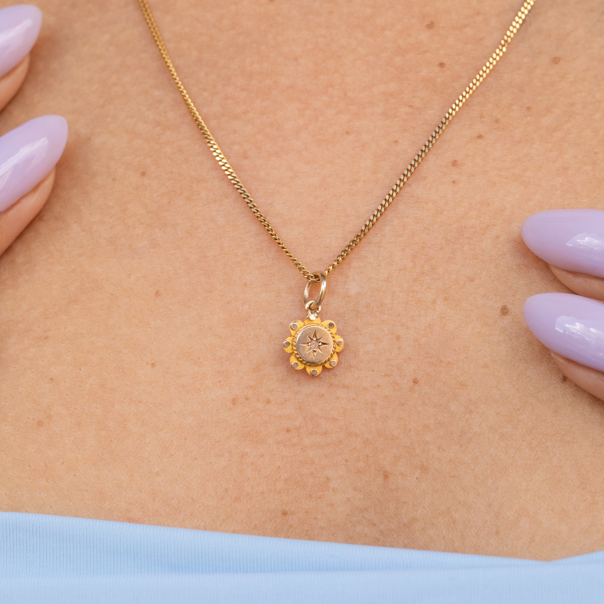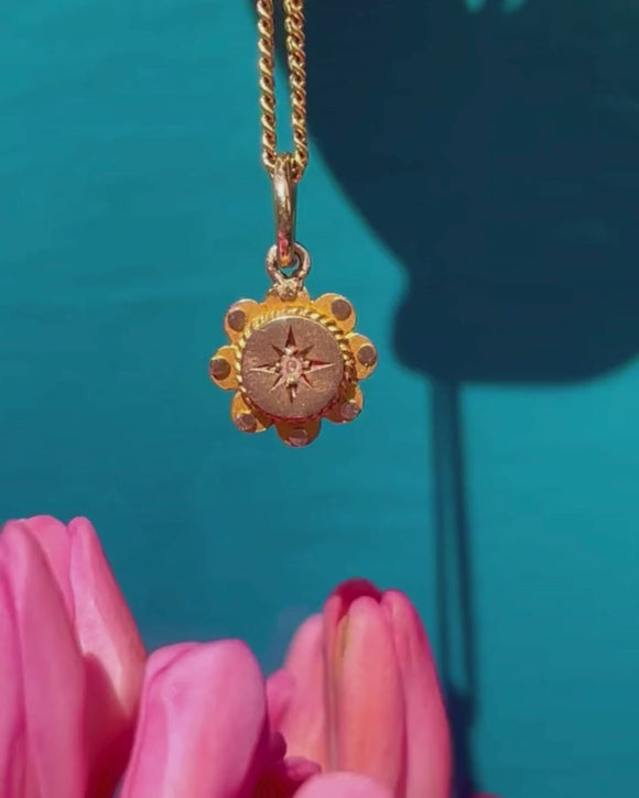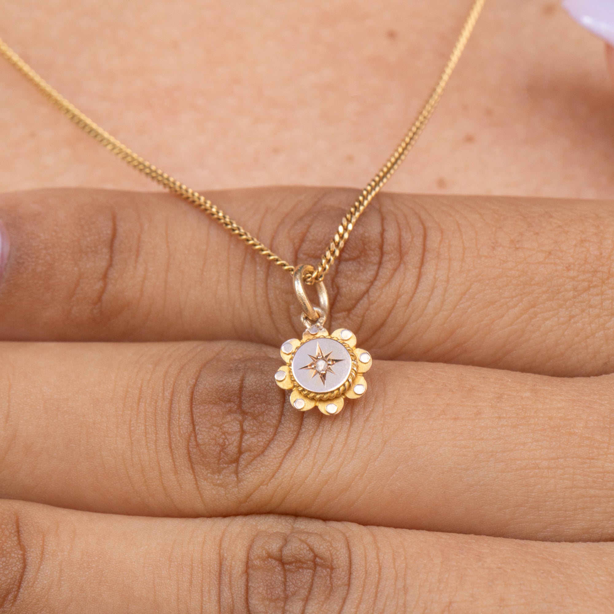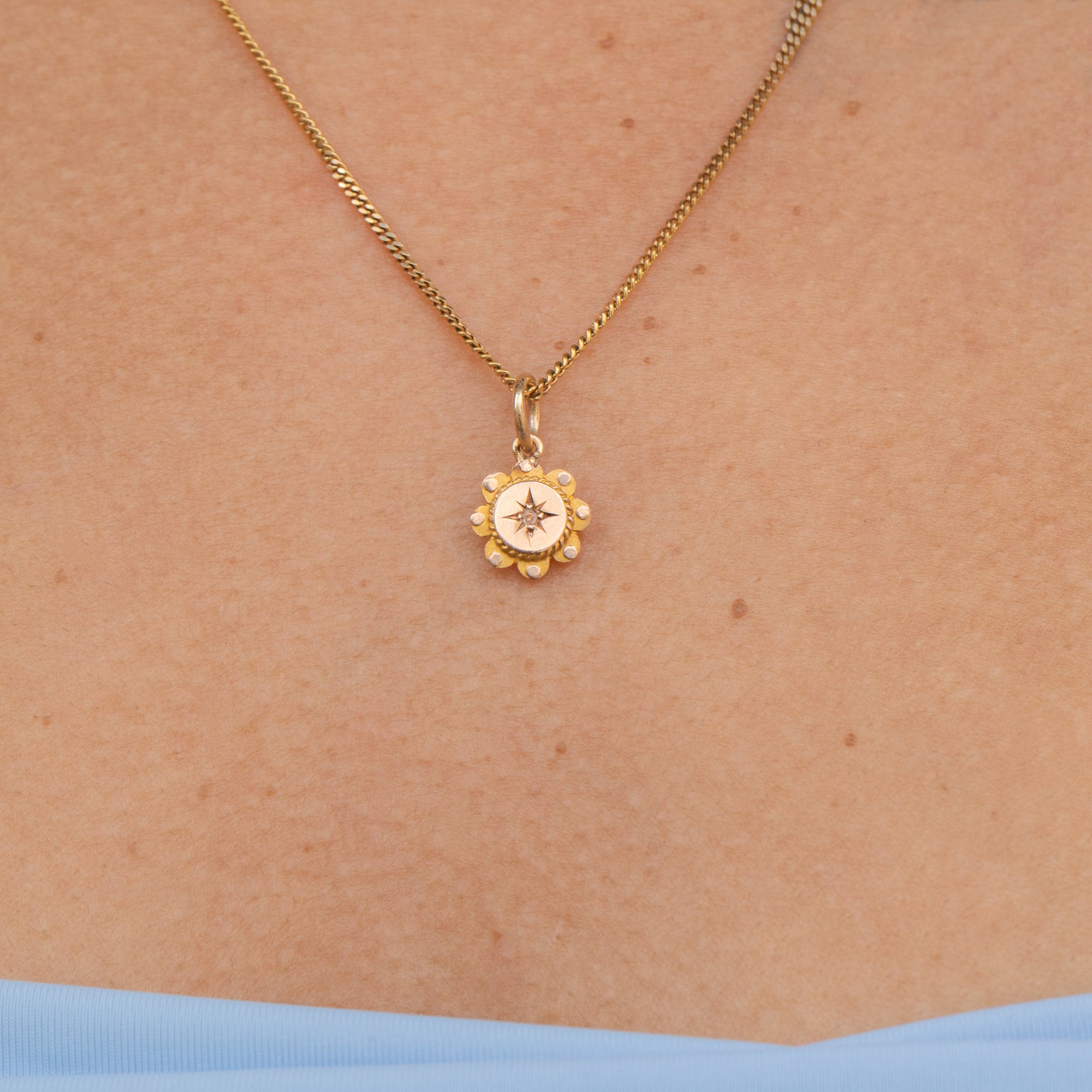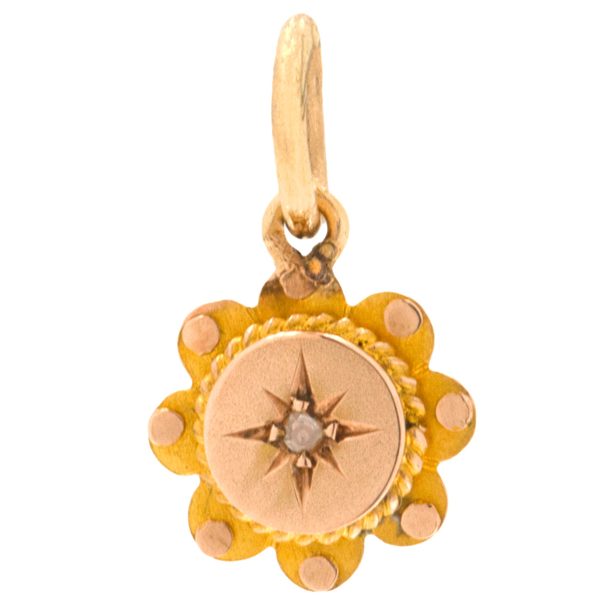 EXCELLENT. This dainty 9ct Gold Etruscan Diamond charm is in fabulous condition. This charm has one rose-cut Diamond at its centre which is securely held within a star setting. The 9ct Gold is bright and buttery and all the details have remained crisp. There is some minor wear on the back of the pendant, commensurate with age, but this is not noticeable when the pendant is worn. Finished with a soldered jump ring, all this sweet Victorian Diamond charm needs is a Gold chain to adorn!