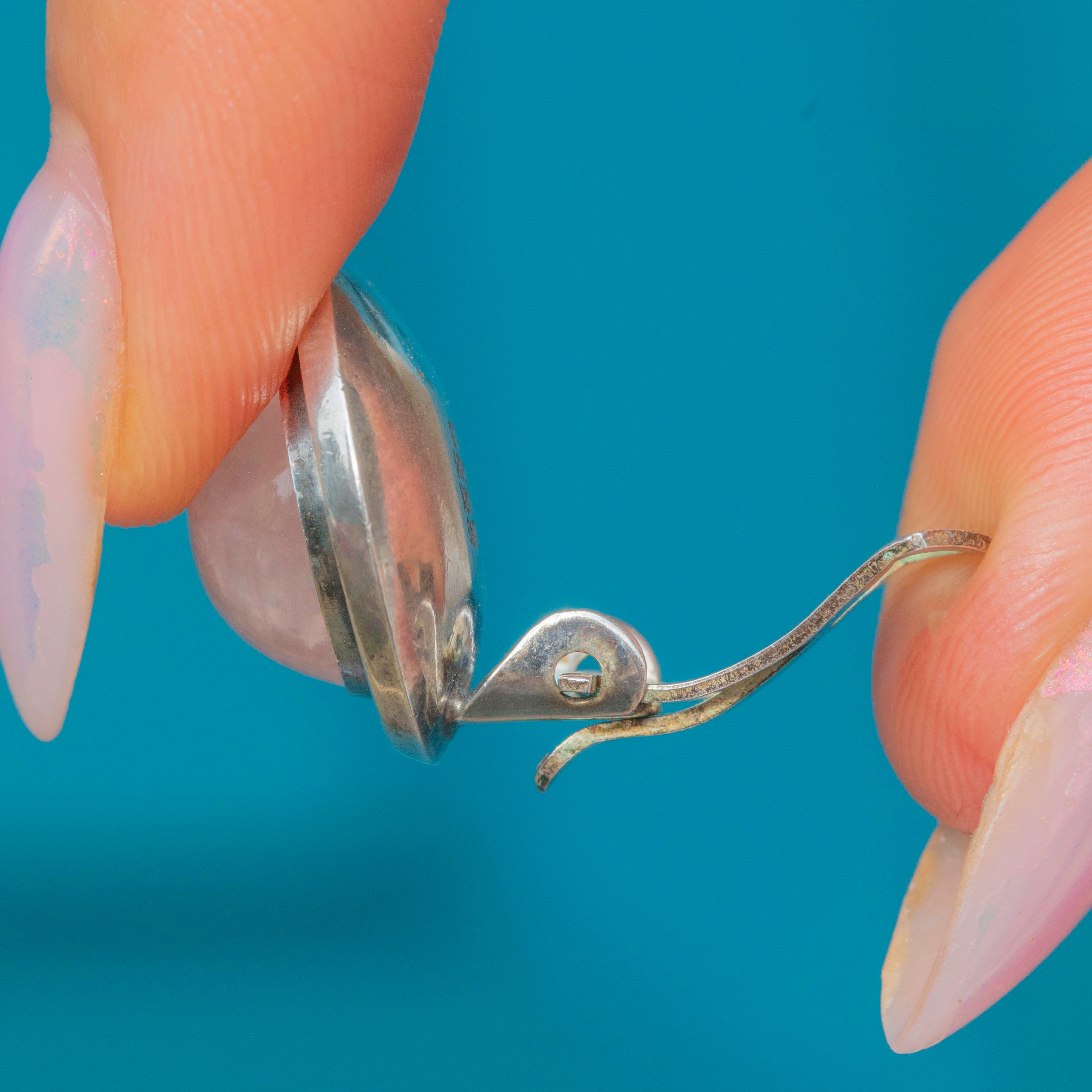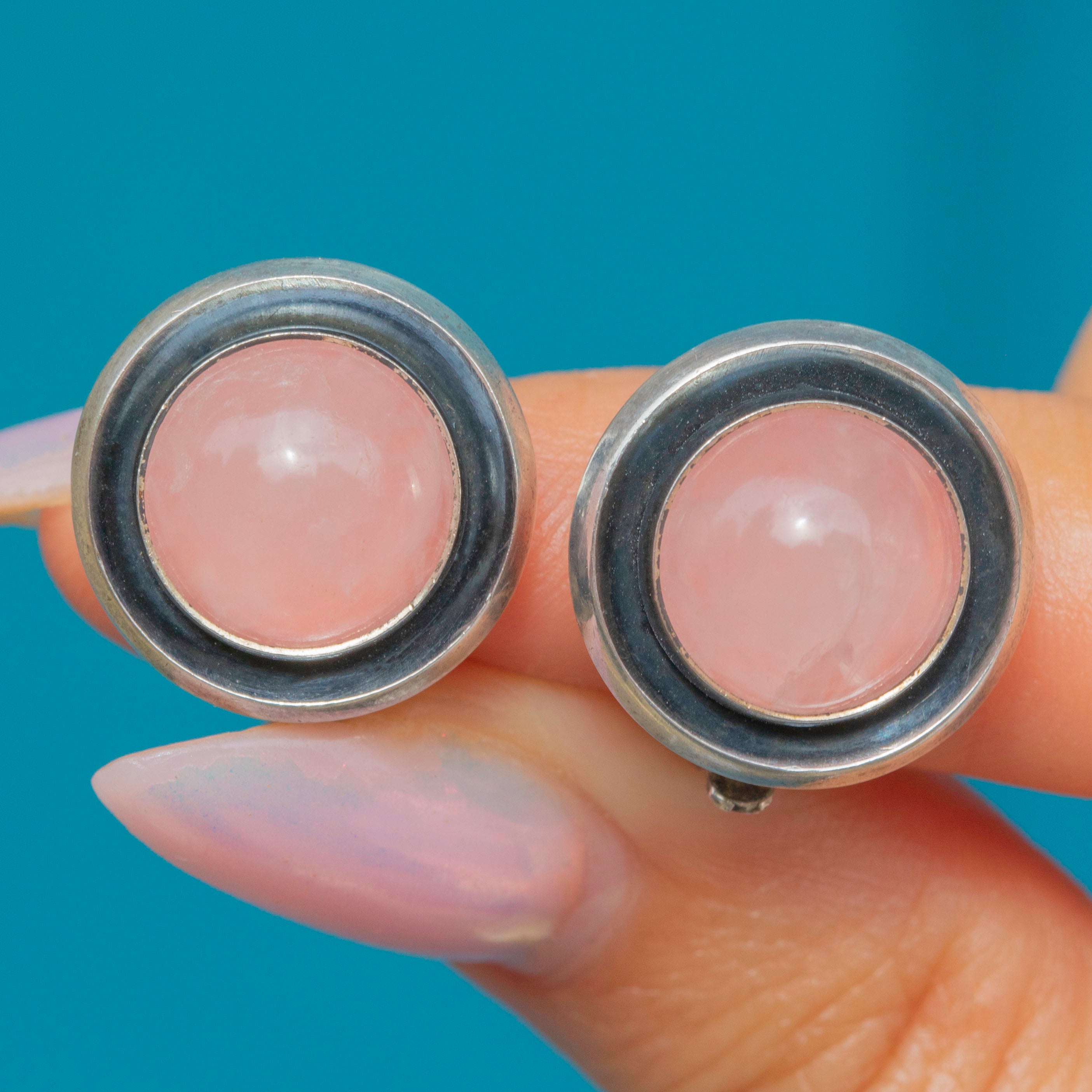 EXCELLENT: The Rose Quartz cabochons are perfectly smooth, with no chips or scuffs, and are held securely in their bezel settings. The Silver is lustrous and the patina sections add a wonderful contrast. The clip-ons are in perfect working order, allowing you to wear these vintage Danish earrings with absolute confidence!
