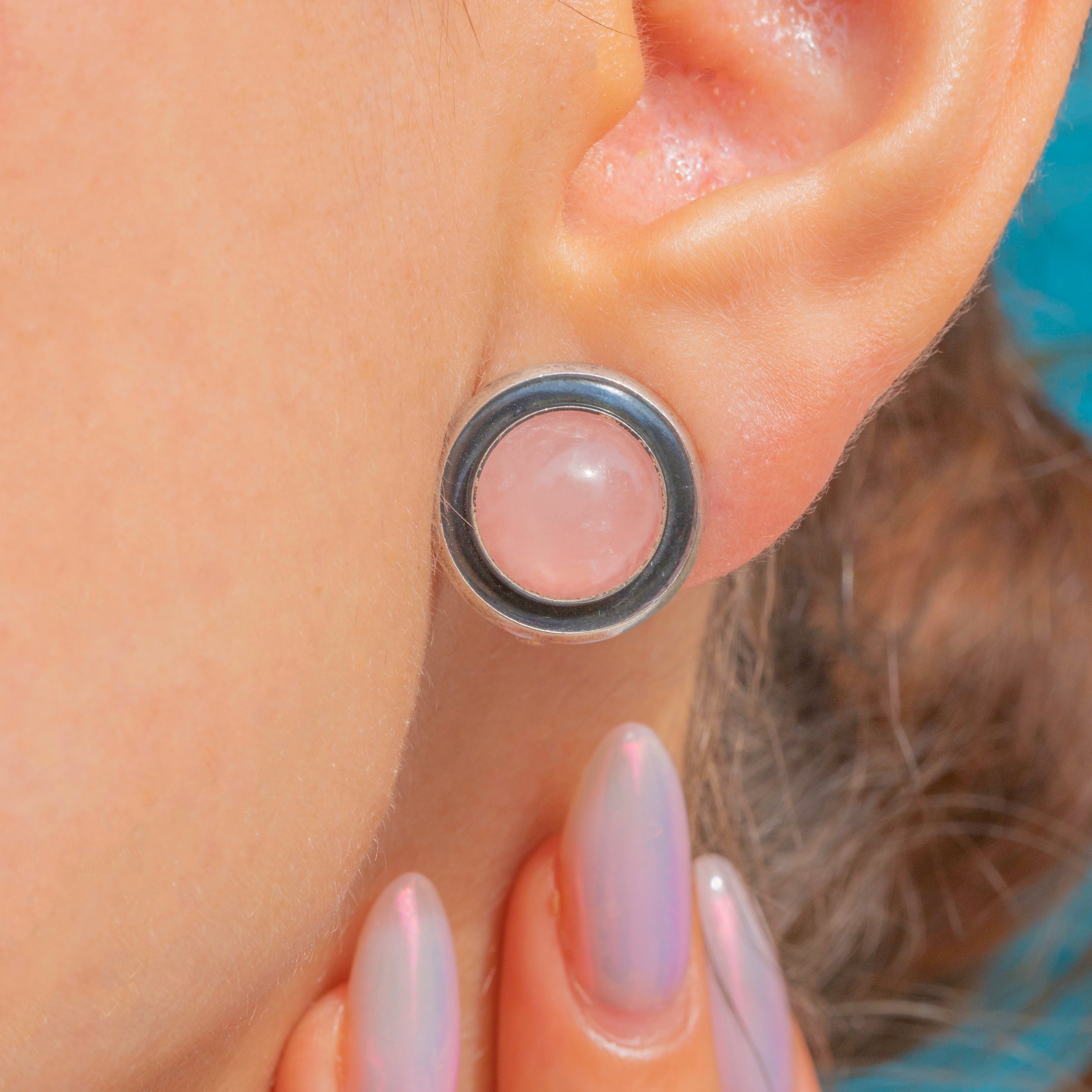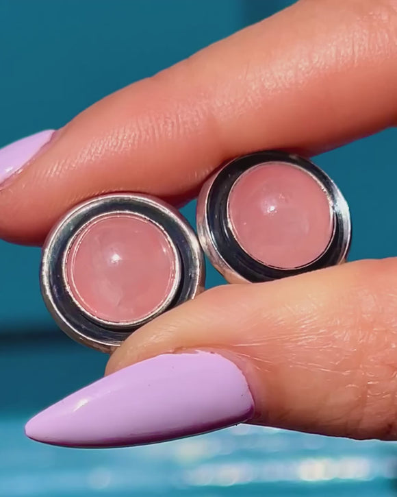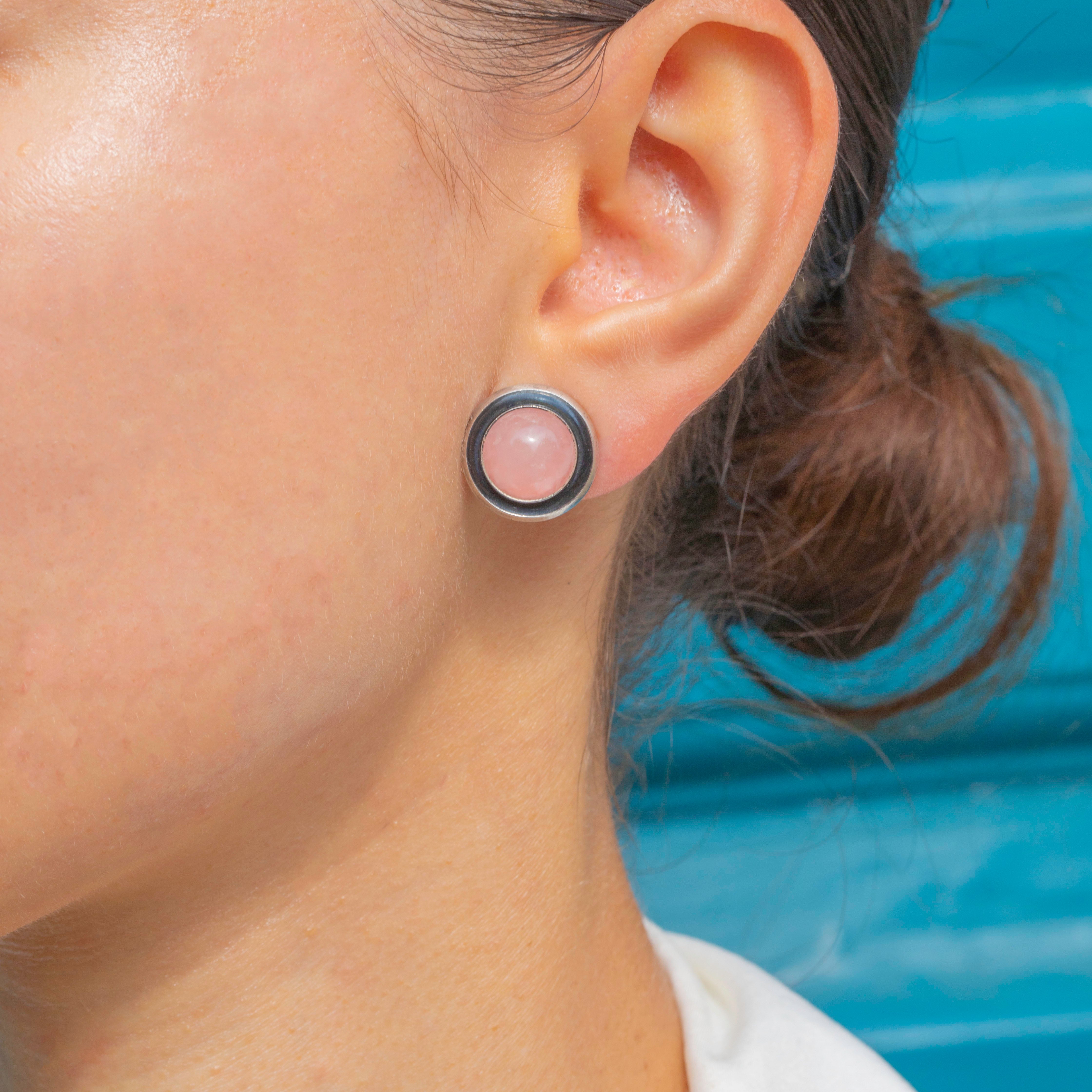 Each round earring features a plump Rose Quartz cabochon, projecting gorgeous blush hues, set within a smooth bezel and accented by a bold line of patina, creating a dramatic contrast.