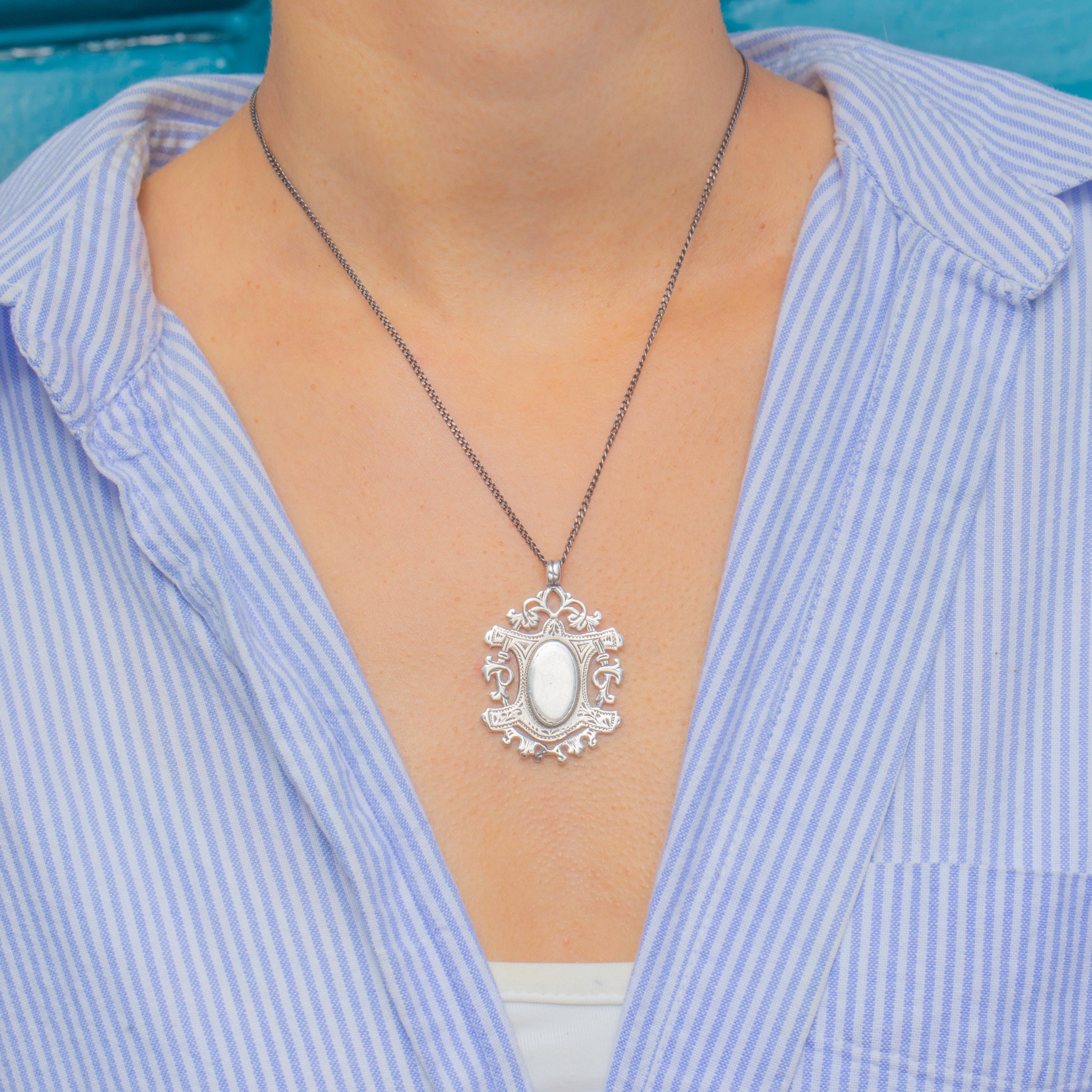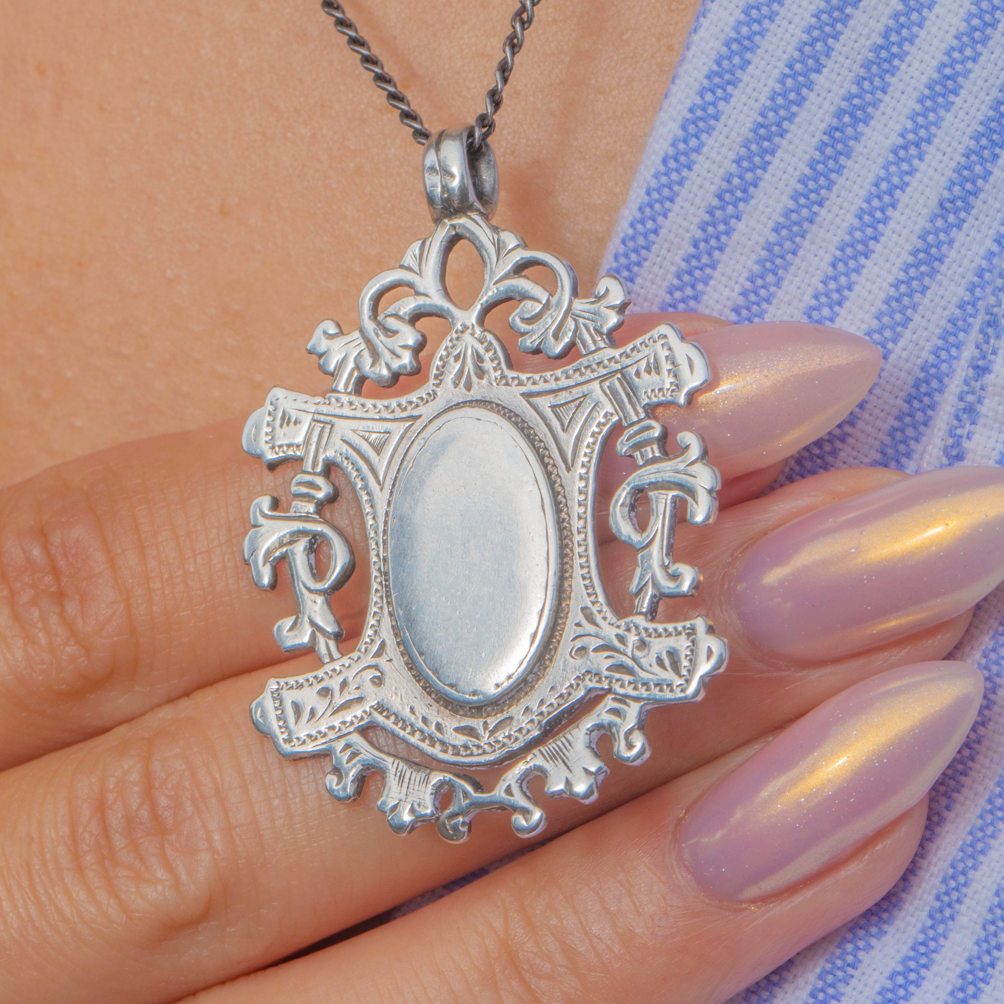 Crafted entirely from glossy Sterling Silver, this large Victorian fob pendant is crafted in a quintessential Victorian style, providing a lovely visual depth.