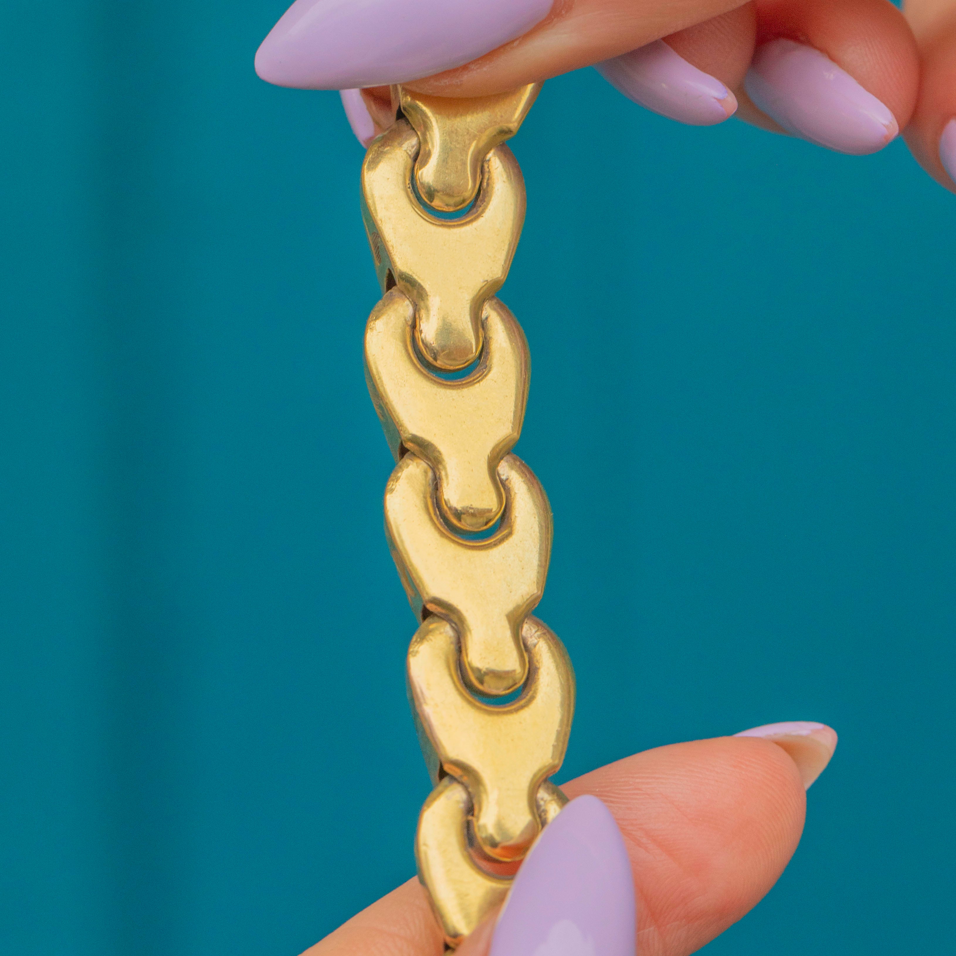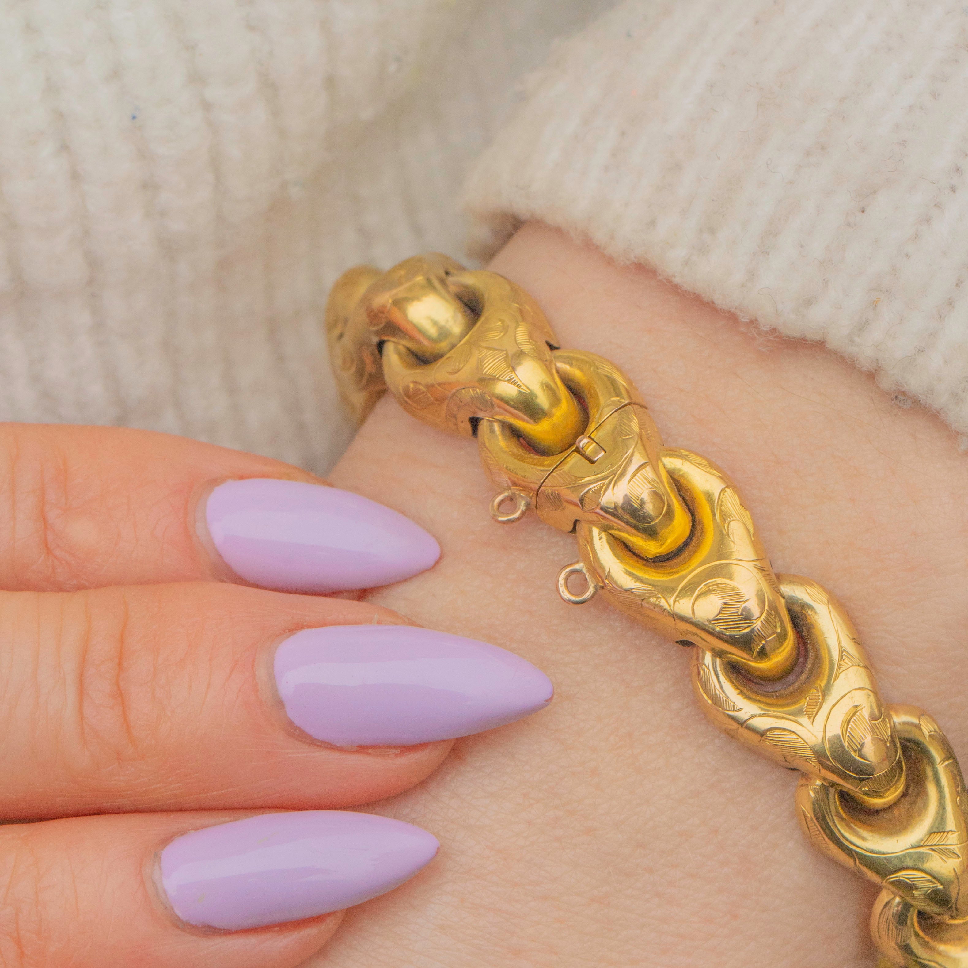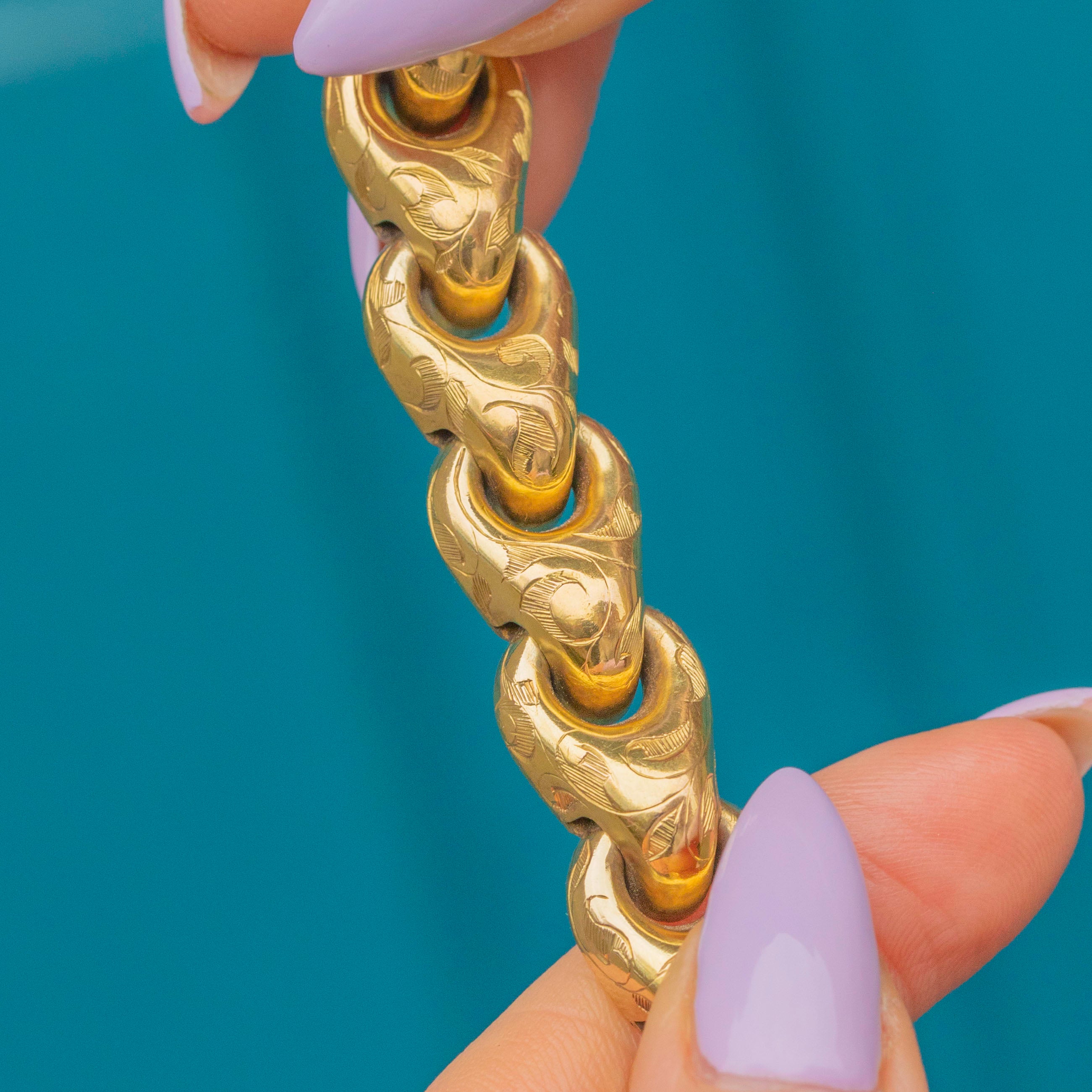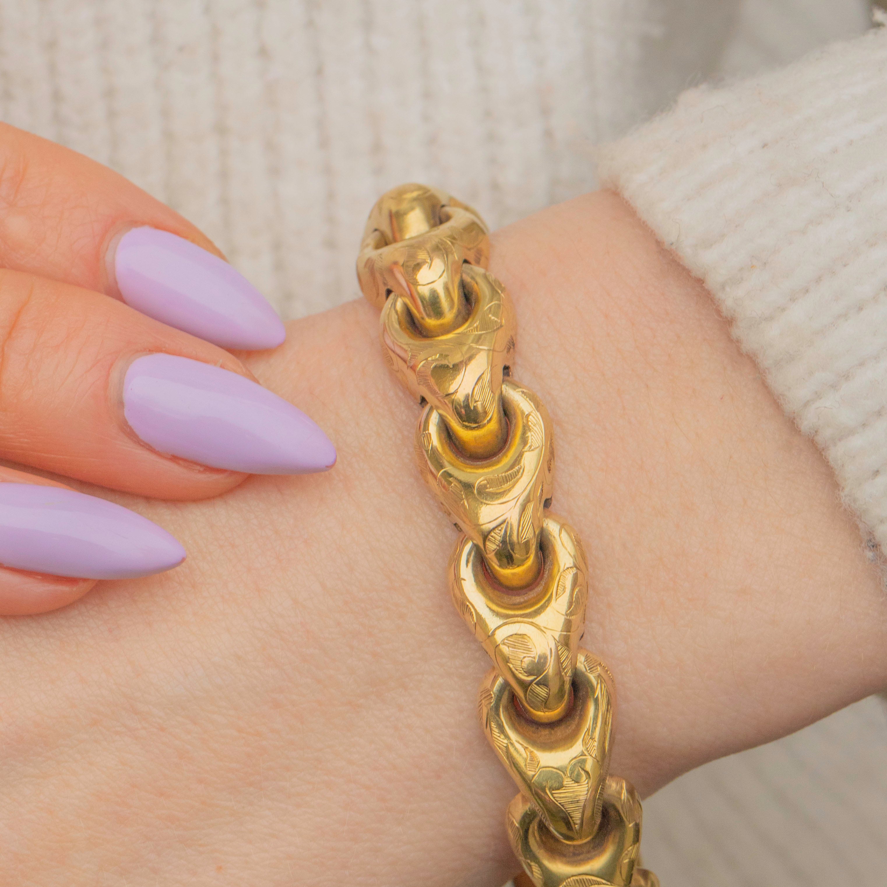 EXCELLENT. This early Victorian 18ct Gold engraved link bracelet is in excellent condition. The links are securely connected, with no dings or dents, and still have good movement, allowing you to wear the bracelet comfortably. The Gold is brightly saturated throughout and the engraved details have remained crisp. There is some minor age-related wear on the back of the links, which is to be expected from a piece of almost 200 years old and are not noticeable during wear. With a fully functioning clasp, you can enjoy this exceptional Victorian Gold bracelet for many more years to come!