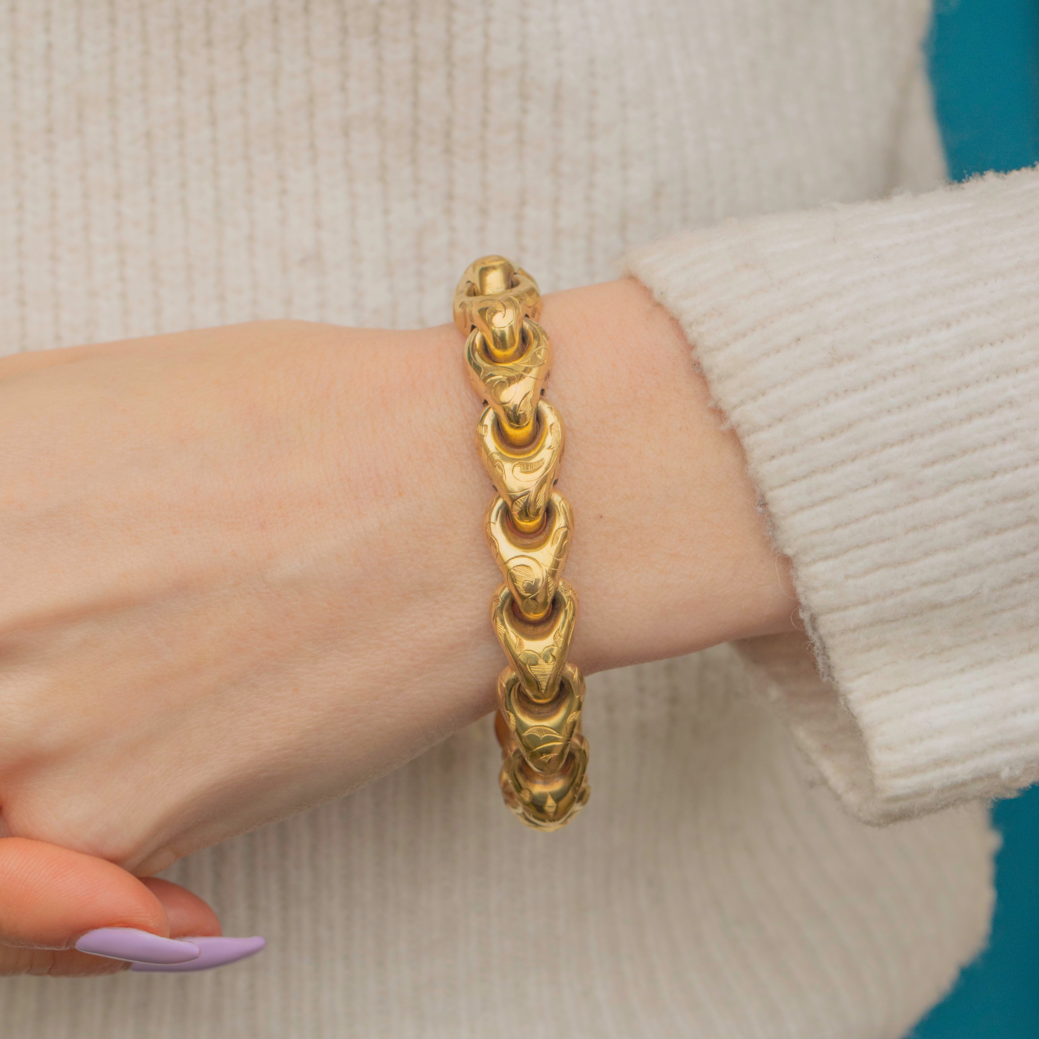 This exquisite early Victorian 18ct Gold engraved link bracelet features beautifully crafted heart-shaped links with intricate detailing inspired by the popular acanthus leaf style of this period, perfectly capturing the skilled craftsmanship of the early Victorian period.