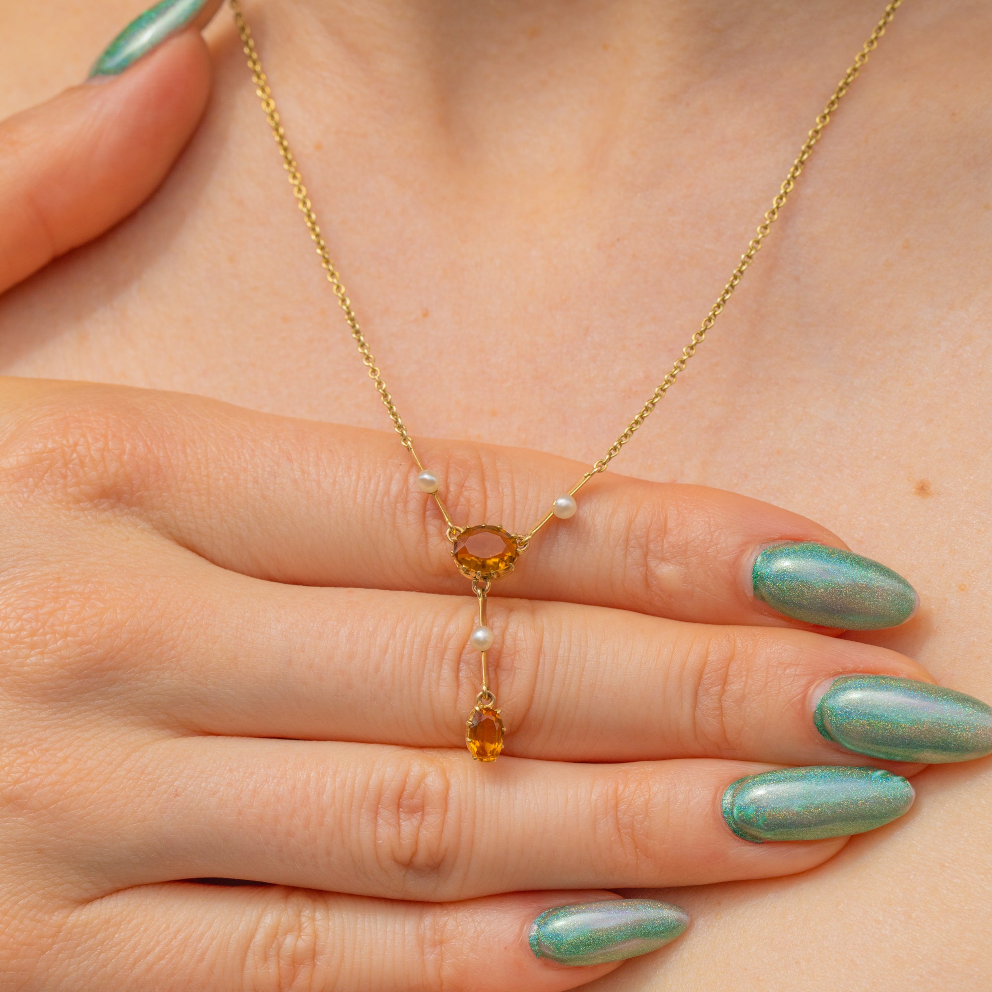 Exuding elegance, this Edwardian 18ct Gold Citrine Pearl drop necklace will bring refinement to your antique jewellery collection! the 17.5" length has been crafted entirely from saturated 18ct Gold, set with a delectable selection of gemstones.