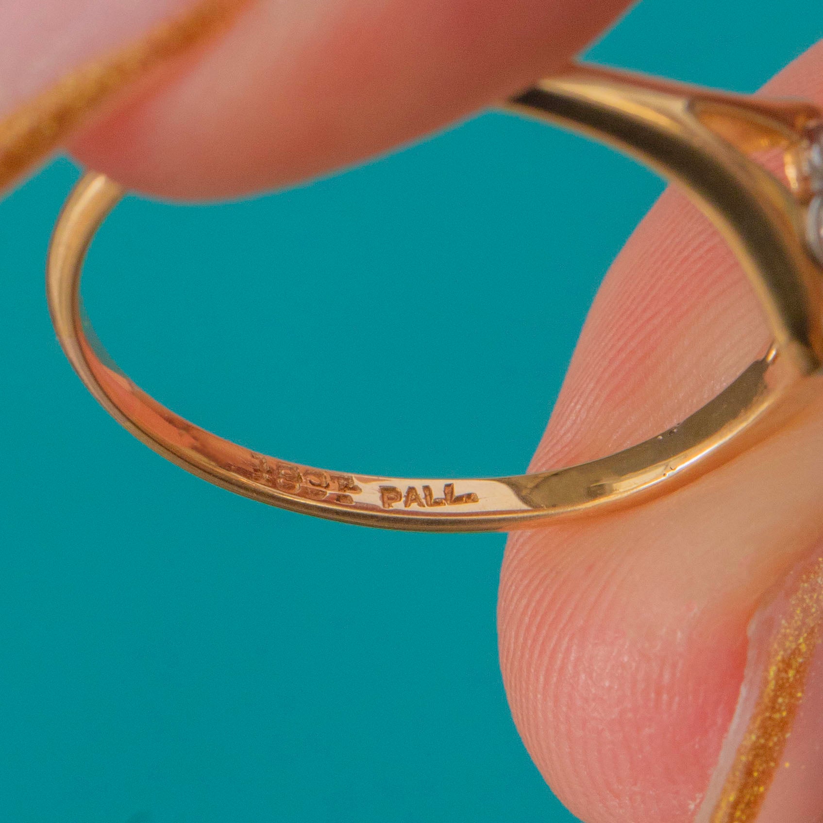 Crafted in 18ct Gold with open shoulders for a light, graceful profile, this pretty piece captures the romantic spirit of the early 1900s. Dainty yet full of fire, it’s a beautiful choice for everyday wear or as a sentimental antique gift.