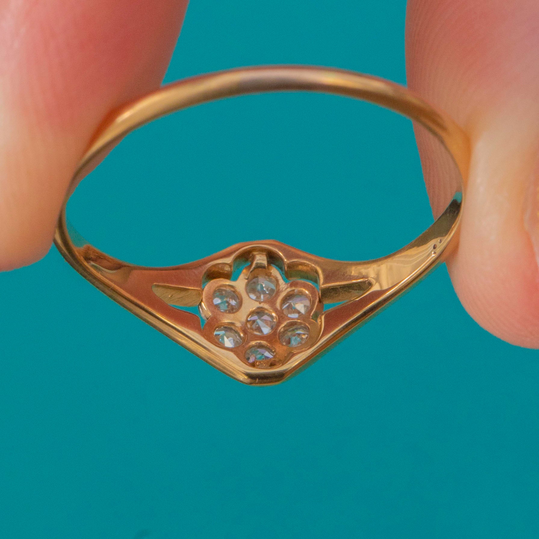This charming antique 18ct Gold Edwardian ring features a delicate daisy cluster of old mine and old European-cut Diamonds, glistening with that unmistakable antique sparkle. The Diamonds form a perfect floral motif, symbolising purity and love, a much-loved Edwardian design that remains effortlessly wearable today.