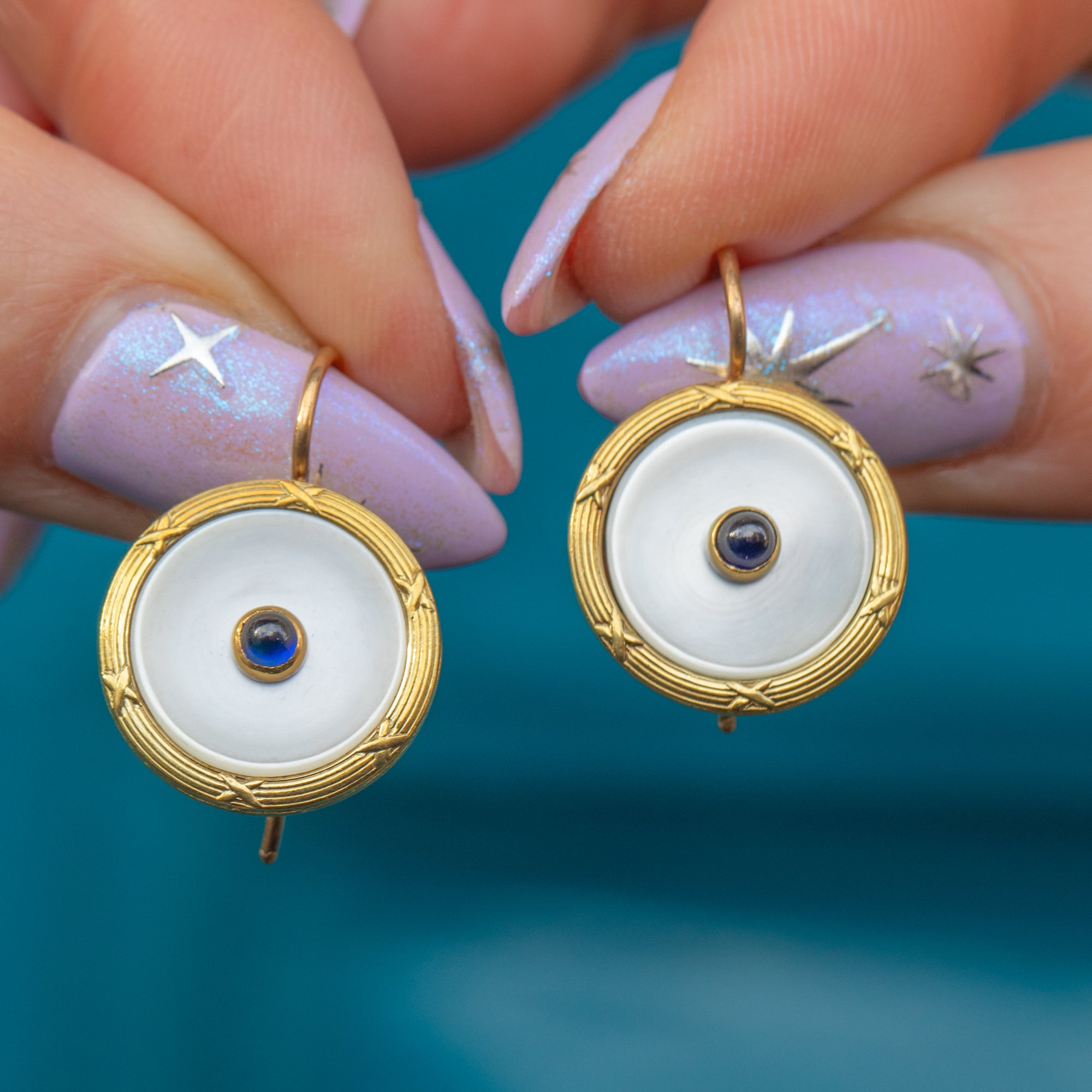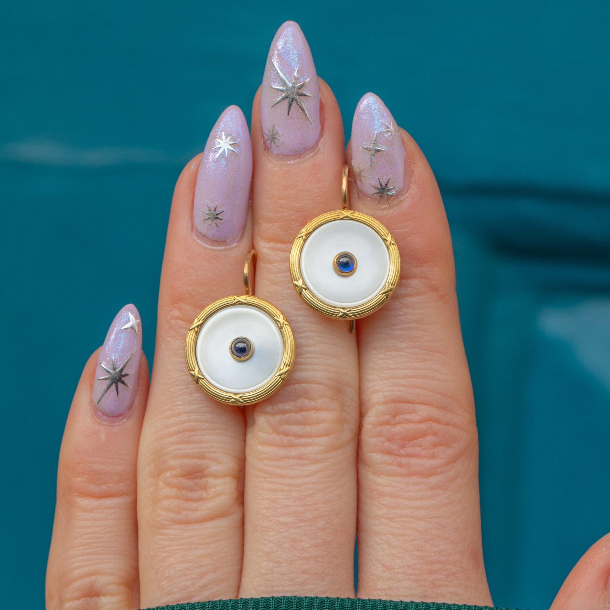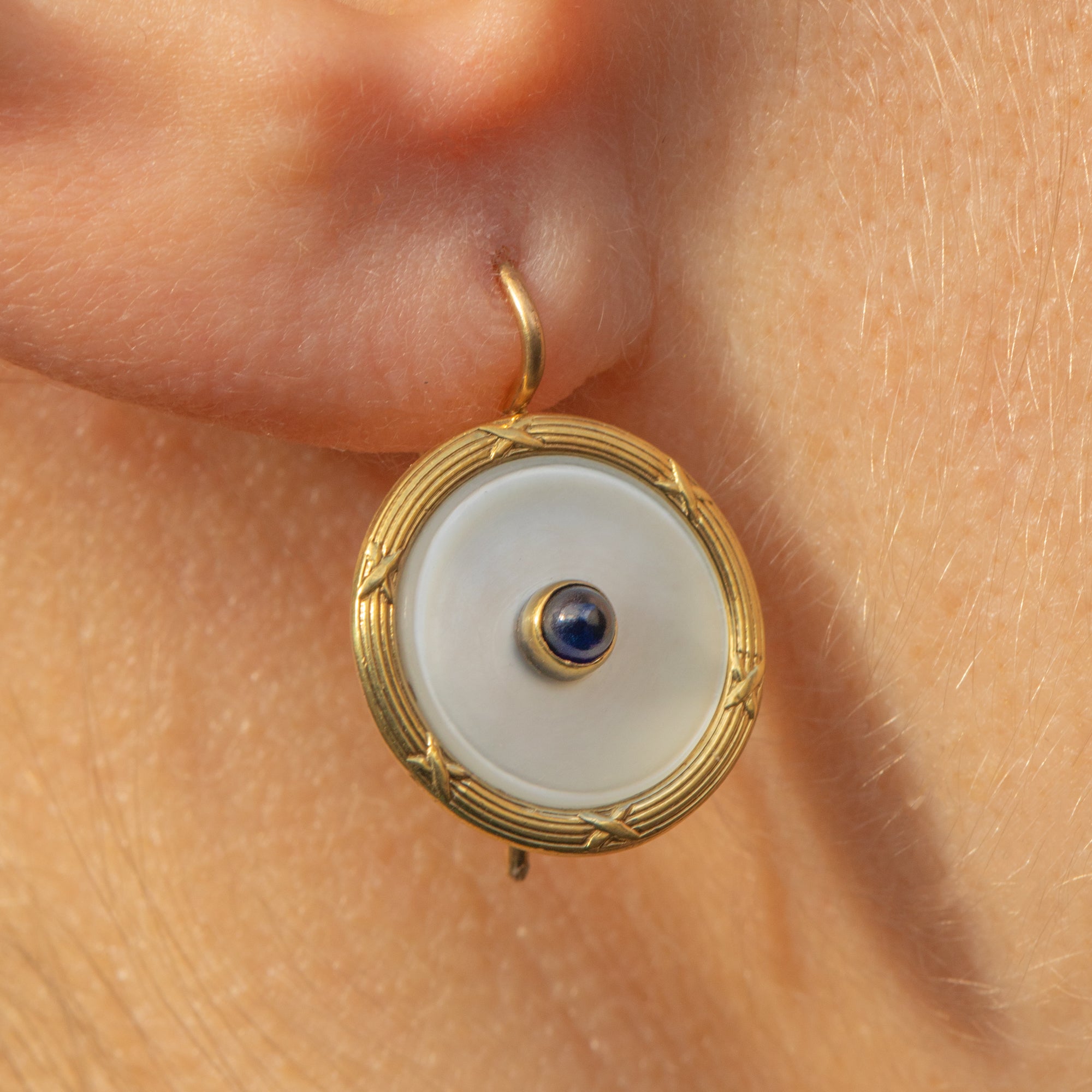 VERY GOOD. A fabulous pair of Edwardian 18ct Gold Mother of Pearl Sapphire button earrings! The earrings have very little signs of age, the only thing to note is that these earrings were likely once buttons, so there is a slight sign of conversion to the back but this is not visible when you wear them. The gems are all securely set and free from surface wear and the slender hooks are comfortable to wear!